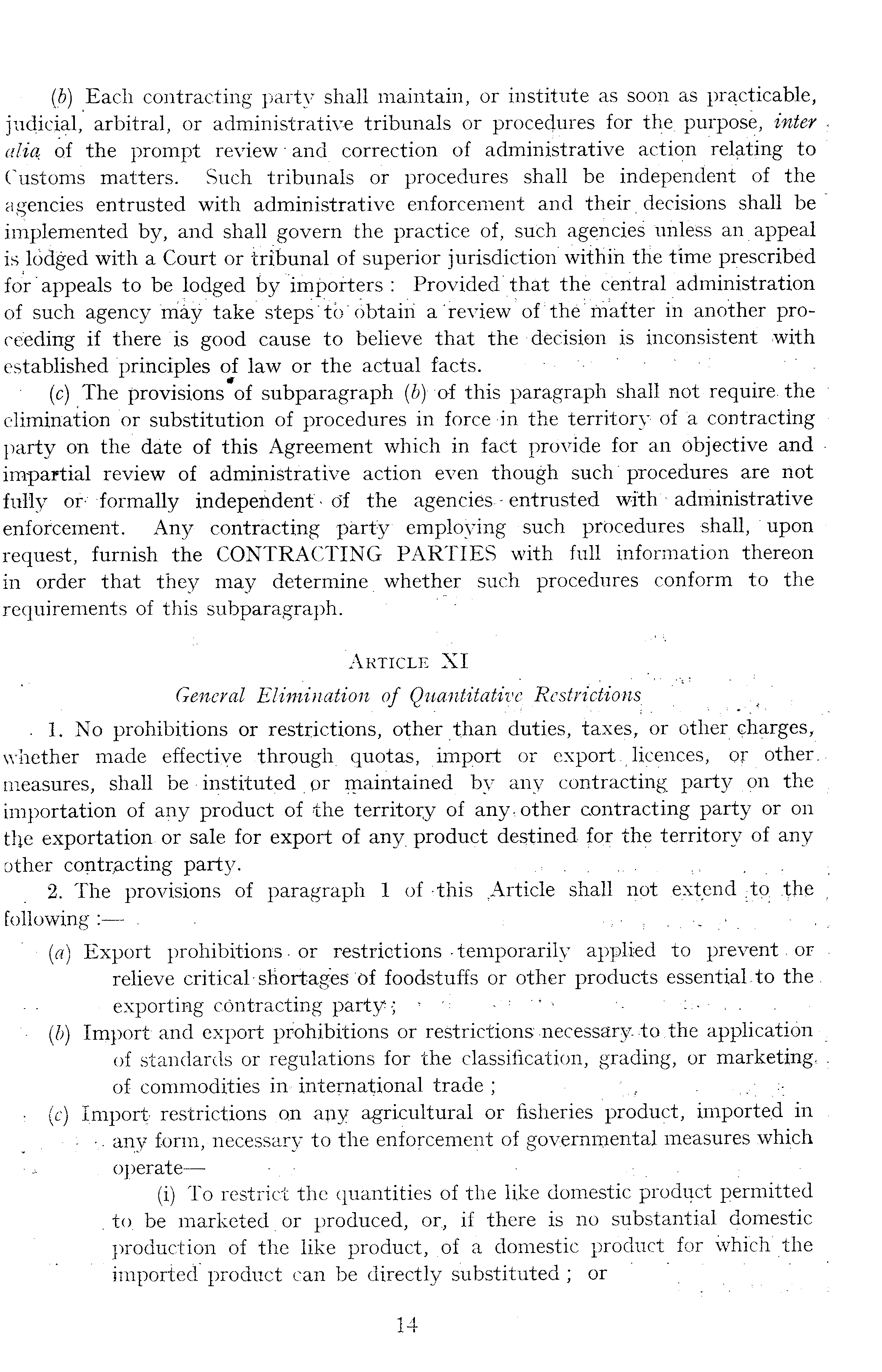 (b) Each contracting party shall maintain, or institute as soon as practicable, judicial, arbitral, or administrative tribunals or procedures for the. purpose, inter alia, of the prompt review • and correction of administrative action relating to Customs matters. Such tribunals or procedures shall be independent of the agencies entrusted with administrative enforcement and their decisions shall be implemented by, and shall govern the practice of, such agencies unless an appeal is lodged with a Court or tribunal of superior jurisdiction within the time prescribed for appeals to be lodged by importers : Provided that the central administration of such agency may take steps to obtain a review of the matter in another proceeding if there is good cause to believe that the decision is inconsistent with established principles of law or the actual facts. (c) The provisions of subparagraph {b) of this paragraph shall not require, the elimination or substitution of procedures in force in the territory of a contracting party on the date of this Agreement which in fact provide for an objective and impartial review of administrative action even though such procedures are not fully 6r formally independent ■ Of the agencies - entrusted with administrative enforcement. Any contracting party employing such procedures shall, upon request, furnish the CONTRACTING PARTIES with full information thereon in order that they may determine whether such procedures conform to the requirements of this subparagraph. Article XI General Elimination of Quantitative Restrictions ■ 1. No prohibitions or restrictions, other than duties, taxes, or other charges, whether made effective through quotas, import or export, licences, or other, measures, shall be instituted or maintained by any contracting party on the importation of any product of the territory of any. other contracting party or on the exportation or sale for export of any product destined for the territory of any other contracting party. . 2. The provisions of paragraph 1 of-this Article shall not extend .to the following : (a) Export prohibitions or restrictions • temporarily applied to prevent. of relieve critical ■ shortages of foodstuffs or other products essential, to the exporting contracting party-; * - ■ < > . ■ (b) Import and export prohibitions or restrictions' necessary to ;the application of standards or regulations for the classification, grading, or marketing, of commodities in international trade ; -. (c) Import restrictions on any agricultural or fisheries product, imported in : v any form, necessary to the enforcement of governmental measures which . operate— • • (i) To restrict the quantities of the like domestic product permitted . to. be marketed or produced, or, if there is no substantial domestic production of the like product, of a domestic product for which the imported product can be directly substituted; or