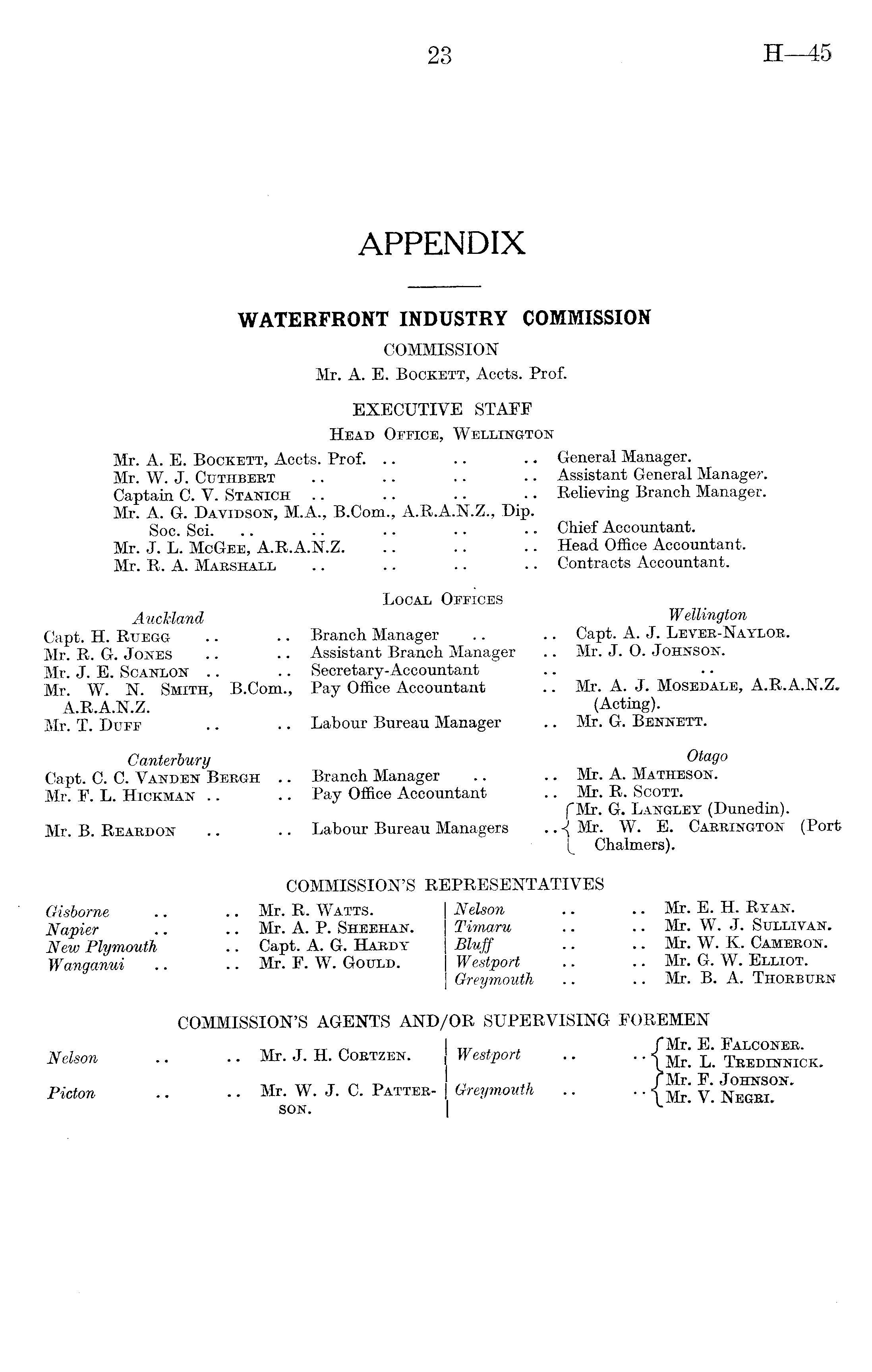 APPENDIX WATERFRONT INDUSTRY COMMISSION COMMISSION Mr. A. E. Bockett, Accts. Prof. EXECUTIVE STAFF Head Office, Wellington Mr. A. E. Bockett, Accts. Prof. .. .. .. General Manager. Mr. W. J. Cuthbert .. .. . - • • Assistant General Manager. Captain 6. V. Stanich .. .. .. .. Relieving Branch Manager. Mr. A. G. Davidson, M.A., 8.C0m., A.R.A.N.Z., Dip. Soc. Sci. .. .. .. .. • • Chief Accountant. Mr. J. L. McGee, A.R.A.N.Z. .. .. .. Head Office Accountant. Mr. R. A. Marshall .. .. .. .. Contracts Accountant. Local Offices Auckland Wellington Capt. H. Ruegg .. .. Branch Manager .. .. Capt. A. J. Lever-Naylor. Mr. R. G. Jones .. .. Assistant Branch Manager .. Mr. J. 0. Johnson. Mr. J. E. Scanlon .. .. Secretary-Accountant Mr. W. N. Smith, 8.C0m., Pay Office Accountant .. Mr. A. J. Mosedale, A.R.A.N.Z. A.R.A.N.Z. (Acting). Mr. T. Duff .. .. Labour Bureau Manager .. Mr. G. Bennett. Canterbury 0ta 9° Capt. C. C. Vanden Bergh .. Branch Manager .. .. Mr. A. Matheson. Mr. F. L. Hickman .. .. Pay Office Accountant .. Mr. R. Scott. f Mr. G. Langley (Dunedin). Mr. B. Reardon .. .. Labour Bureau Managers .. Mr. W. E. Carrington (Port [_ Chalmers). COMMISSION'S REPRESENTATIVES Gisborne .. .. Mr. R. Watts. Nelson .. .. Mr. E. H. Ryan. Napier .. .. Mr. A. P. Sheehan. Timaru .. .. Mr. W. J. Sullivan. New Plymouth .. Capt. A. G. Hardy Bluff .. .. Mr. W. K. Cameron. Wanganui .. .. Mr. F. W. Gould. Westport .. .. Mr. G. W. Elliot. Greymouth .. .. Mr. B. A. Thorburn COMMISSION'S AGENTS AND/OR SUPERVISING FOREMEN „r -r tt ur s t /Mr- E - Falconer. Nelson .. .. Mr. J. H. Cortzen. Westport .. .. <- L Trbdinotck . „, „ T T n t, J? f Mr. F. Johnson. Picton .. .. Mr. W. J. C. Patter- Greymouth .. ••"\ Mr V Negri son. i. • •