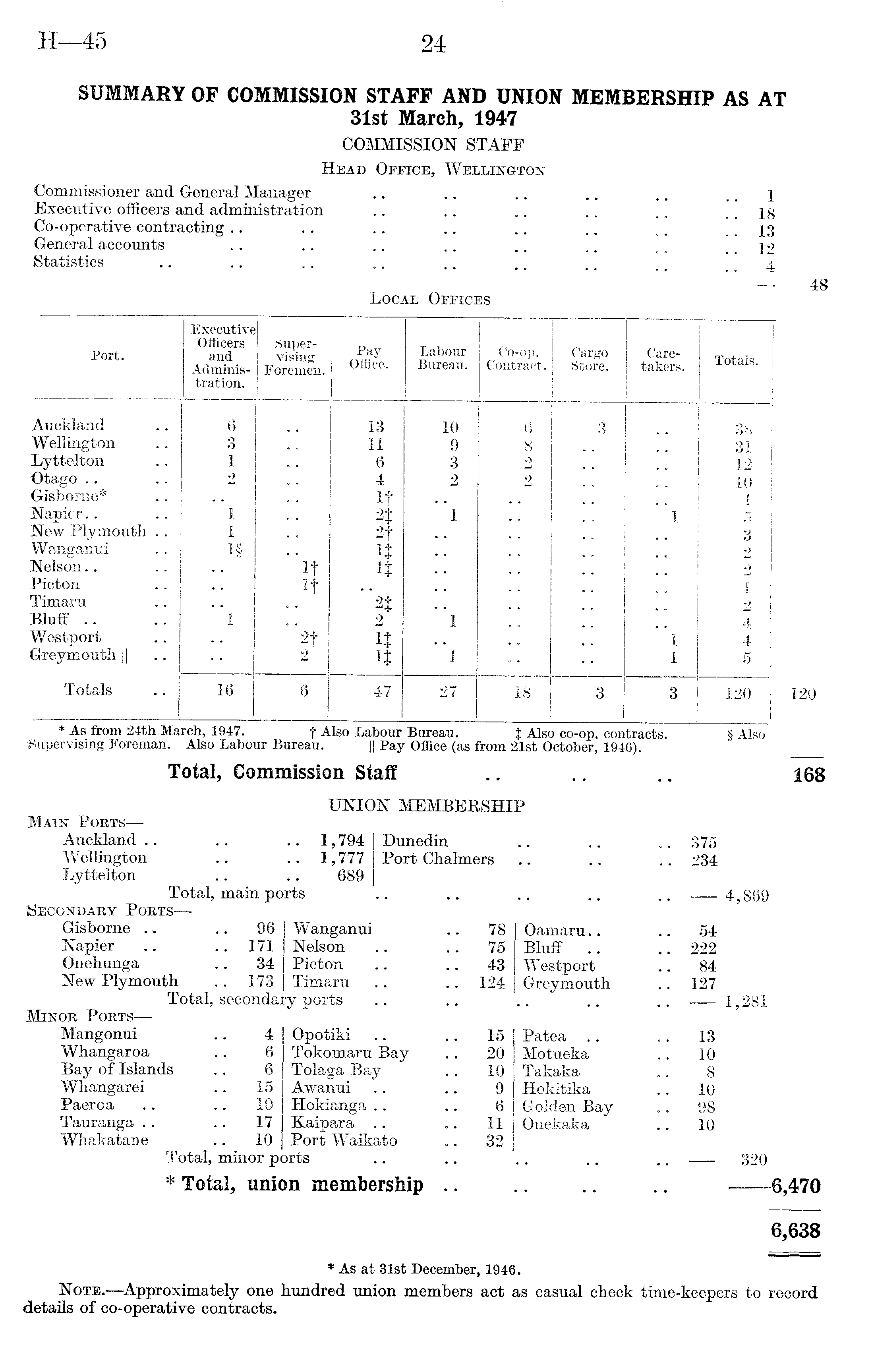 Executive Port. Officers and Administration. Supervising Foremen. Pay Office. Labour Bureau. Co-op. Contract. Cargo Store. Caretakers. Totals. Auckland 6 13 10 6 3 38 Wellington 3 11 9 8 31 Lyttelton 1 6 3 -> 12 Otago .. 2 4 2 2 10 Gisborno* It 1 Napier.. 1 2$ 1 1 5 New Plymouth . 1 2f 3 Wanganui 1§ 1$ 2 Nelson.. "if n .. 2 Picton If I Timaru "2$ 2 Bluff .. I 2 1 4 Westport "2-f it I 4 Greymouth || 2 n 1 1 5 Totals 16 Q 47 27 1 IS j 3 3 120 120