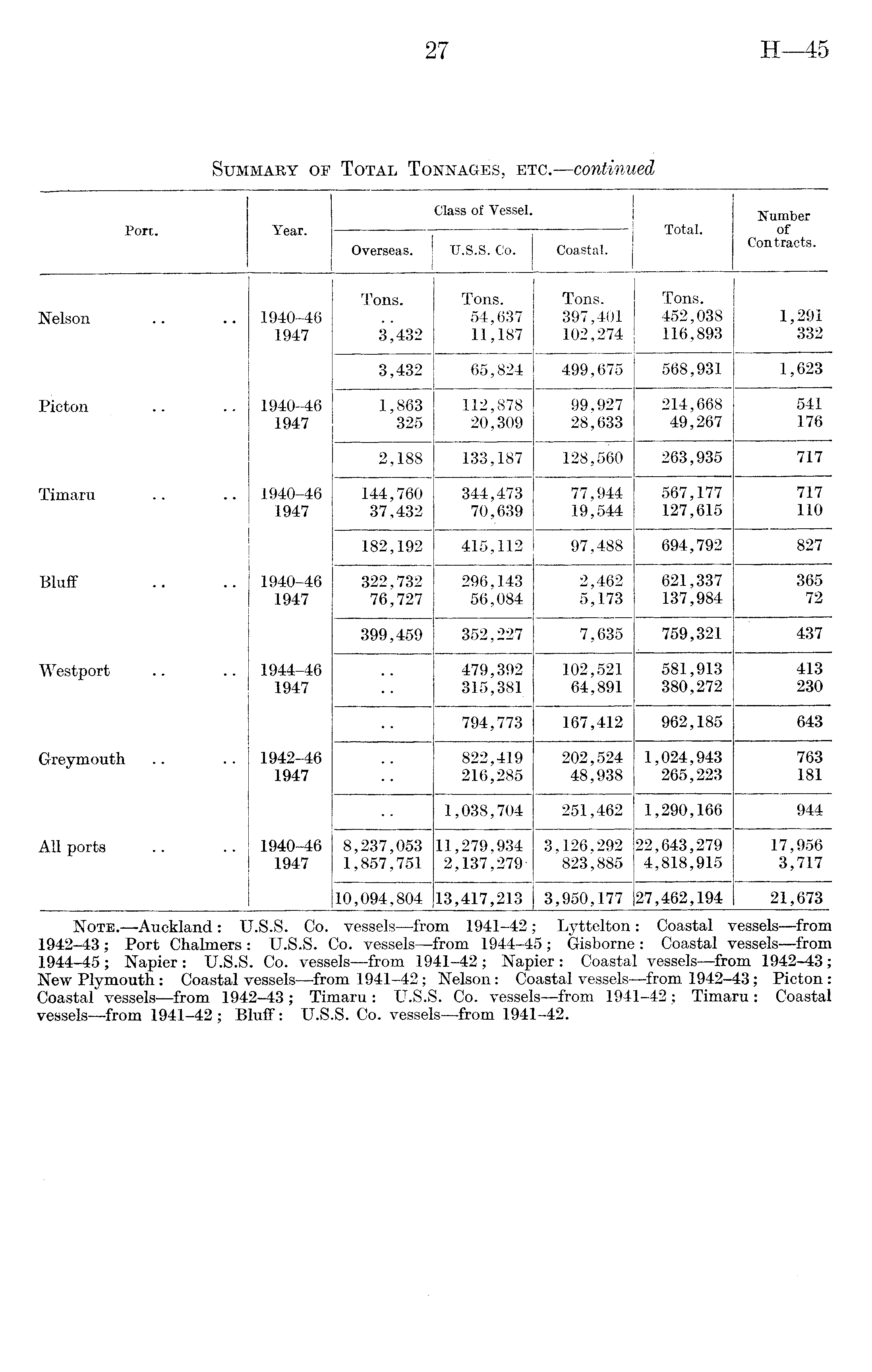 Year. Class of Vessel. Total. Number of Contracts. Overseas. TJ.S.S. Co. Coastal. Nelson 1940-46 1947 1940-46 1947 1940-46 1947 1940-46 1947 1944-46 1947 1942-46 1947 1947 Tons. 3 Tons. 54,637 11,187 Tons. 397,401 102,274 Tons. 452,038 116,893 1,291 332 3,432 65,824 499,675 568,931 1,623 Picton 1,863 325 112,878 20,309 99,927 28,633 214,668 49,267 541 176 2,188 133,187 128,560 263,935 717 Timaru 144,760 37,432 344,473 70,639 77,944 19,544 567,177 127,615 717 110 182,192 415,112 97,488 694,792 827 Bluff 322,732 76,727 296,143 56,084 2,462 5,173 621,337 137,984 365 72 399,459 352,227 7,635 759,321 437 Westport 479,392 315,381 102,521 64,891 581,913 380,272 413 230 794,773 167,412 962,185 643 Greymouth 822,419 216,285 202,524 48,938 1,024,943 265,223 763 181 1,038,704 251,462 1,290,166 944 All ports 8,237,053 1,857,751 11,279,934 2,137,279 3,126,292 823,885 22,643,279 4,818,915 17,956 3,717 10,094,804 13,417,213 3,950,177 27,462,194 21,673