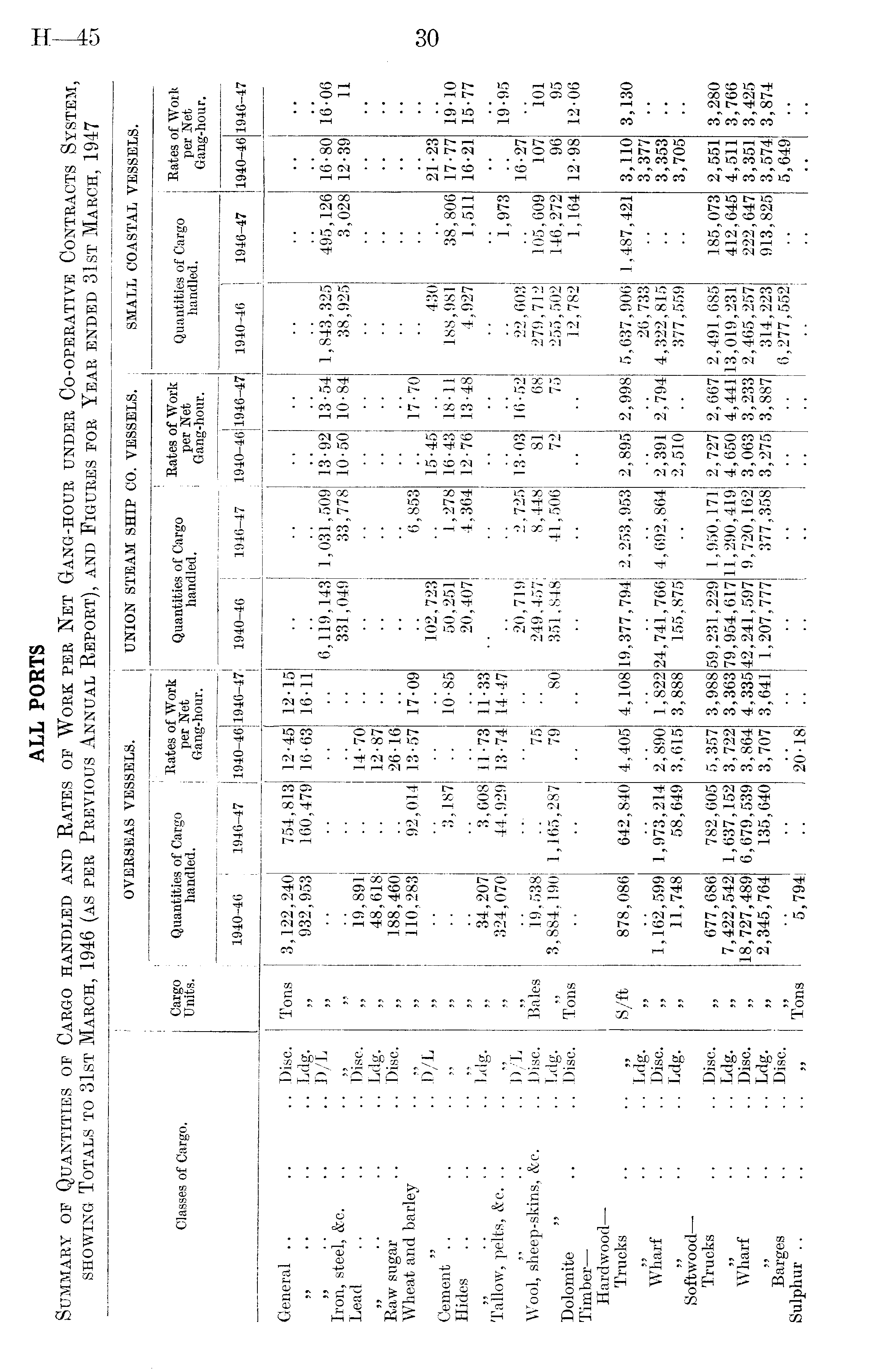 ALL PORTS Summary of Quantities of Cargo handled and Rates of Work per Net Gang-hour under Co-operative Contracts System, showing Totals to 31st March, 1946 (as per Previous Annual Report), and Figures for Year ended 31st March, 1947