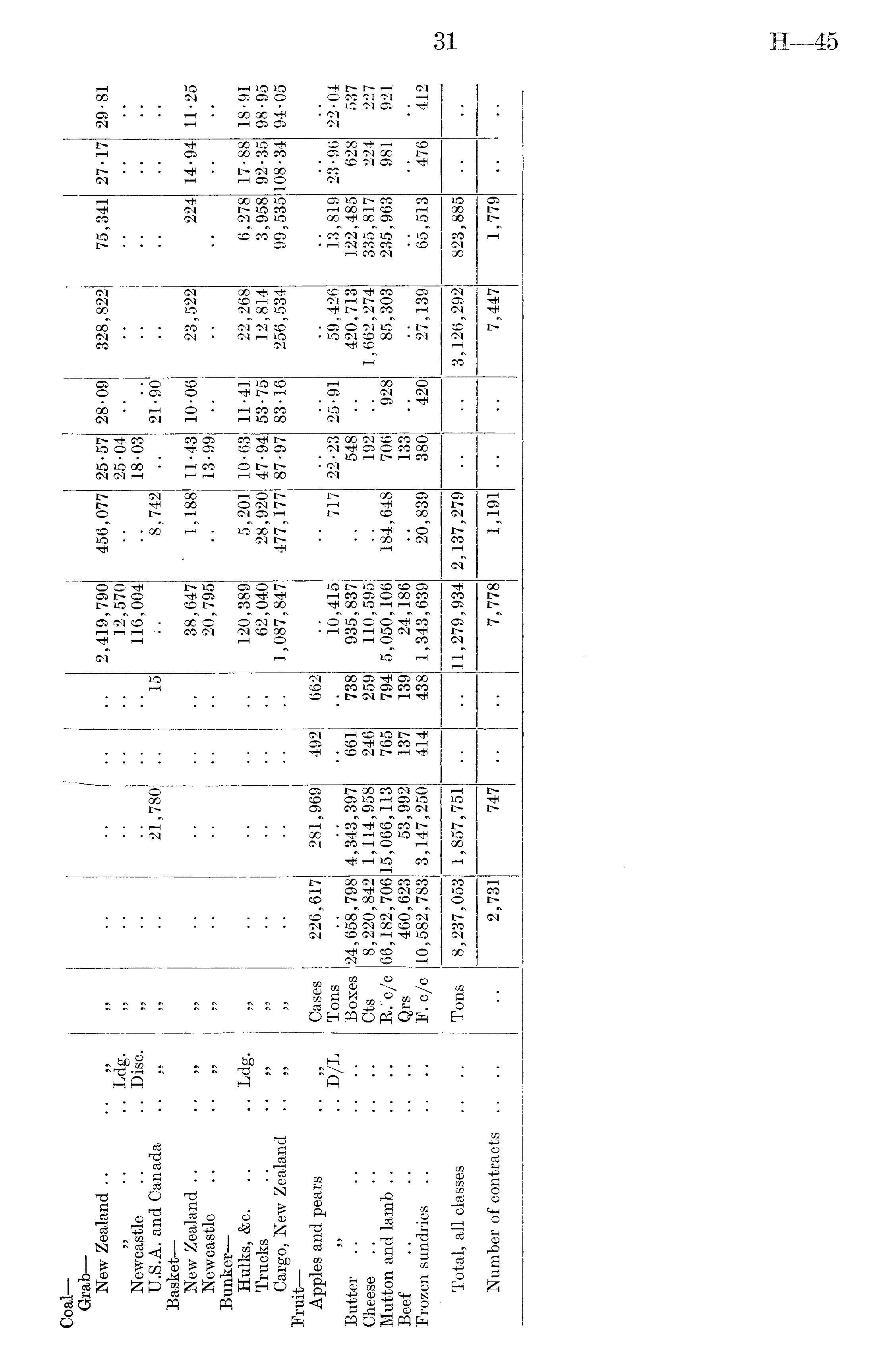 Coal- ' 1 Grab— New Zealand .. » 2,419,790 456,077 25-57 28-09 328,822 75,341 27-17 29-81 >f • • .. Ldg. 12,570 25-04 Newcastle .. Disc. 116,004 18-03 U.S.A. and Canada • • 55 2i,7S0 "l5 '8,742 21-90 Basket — New Zealand .. • • 5) 38,647 1,188 11-43 10-06 23,522 224 14-94 11-25 Newcastle 55 20,795 13-99 Bunker — Hulks, &c. .. Ldg. 120,389 5,201 10-63 11-41 22,268 6,278 17-88 18-91 Trucks 62,040 28,920 47-94 53-75 12,814 3,958 92-35 98-95 Cargo, New Zealand 55 1,087,847 477,177 87-97 83-16 256,534 99,535 108-34 94-05 FruitApples and pears • • 55 Cases 226,617 281,969 492 662 .. D/L Tons io,415 717 22-23 25-91 59,426 13,819 23-96 22-04 Butter Boxes 24,658,798 4,343,397 661 ■738 935,837 548 420,713 122,485 628 537 Cheese Cts 8,220,842 1,114,958 246 259 110,595 192 1,662,274 335,817 224 227 Mutton and lamb .. R.'c/c 66,182,706 15,066,113 765 794 5,050,106 184,648 706 928 85,303 235,963 981 921 Beef Qrs 460,623 53,992 137 139 24,186 133 Frozen sundries F. c/c Tons 10,582,783 3,147,250 414 438 1,343,639 20,839 380 420 27,139 65,513 *476 412 Total, all classes 8,237,053 1,857,751 11,279,934 2,137,279 3,126,292 823,885 •• Number of contracts 2,731 747 7,778 1,191 7,447 1,779