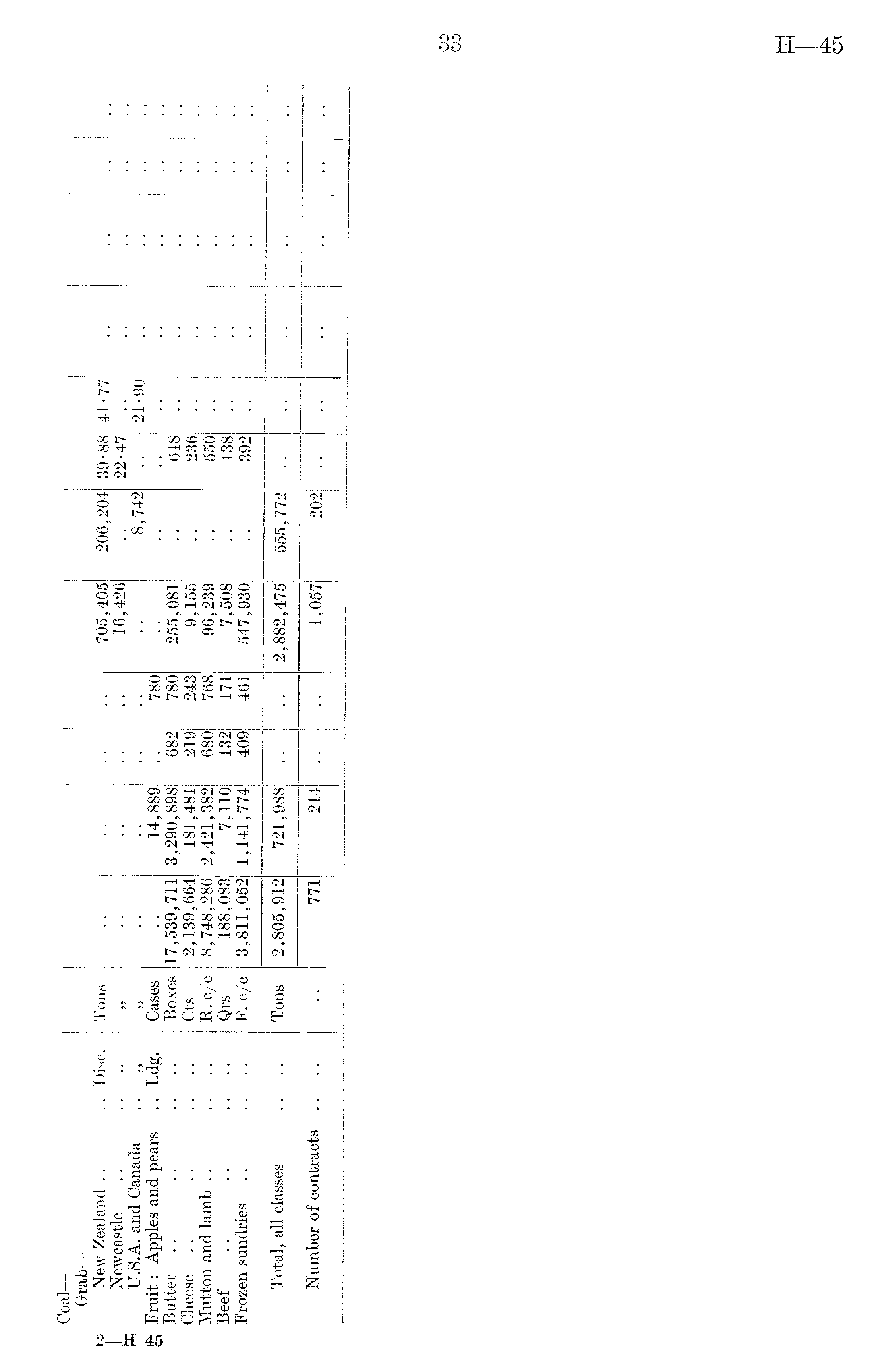 Coal- ' Grab— fro New Zealand .. . T)isc. Tons 705,405 206,204 39-88 41 • 77 Newcastle W U.S.A. and Canada » ,, 16,426 22-47 » ?J 8,742 21-90 g; Fruit: Apples and pears • Ldg. Cases 14,889 780 Butter Boxes 17,539,711 3,290,898 682 780 255,081 "648 j Cheese Cts 2,139,664 181,481 219 243 9,155 236 Mutton and lamb . . R, c/c 8,748,286 2,421,382 680 768 96,239 550 , . Beef Qrs 188,083 7,110 132 171 7,508 138 Frozen sundries .. F. c/c Tons 3,811,052 1,141,774 409 461 547,930 392 Total, all classes 2,805,912 721,988 2,882,475 555,772 Number of contracts 771 214 1,057 202