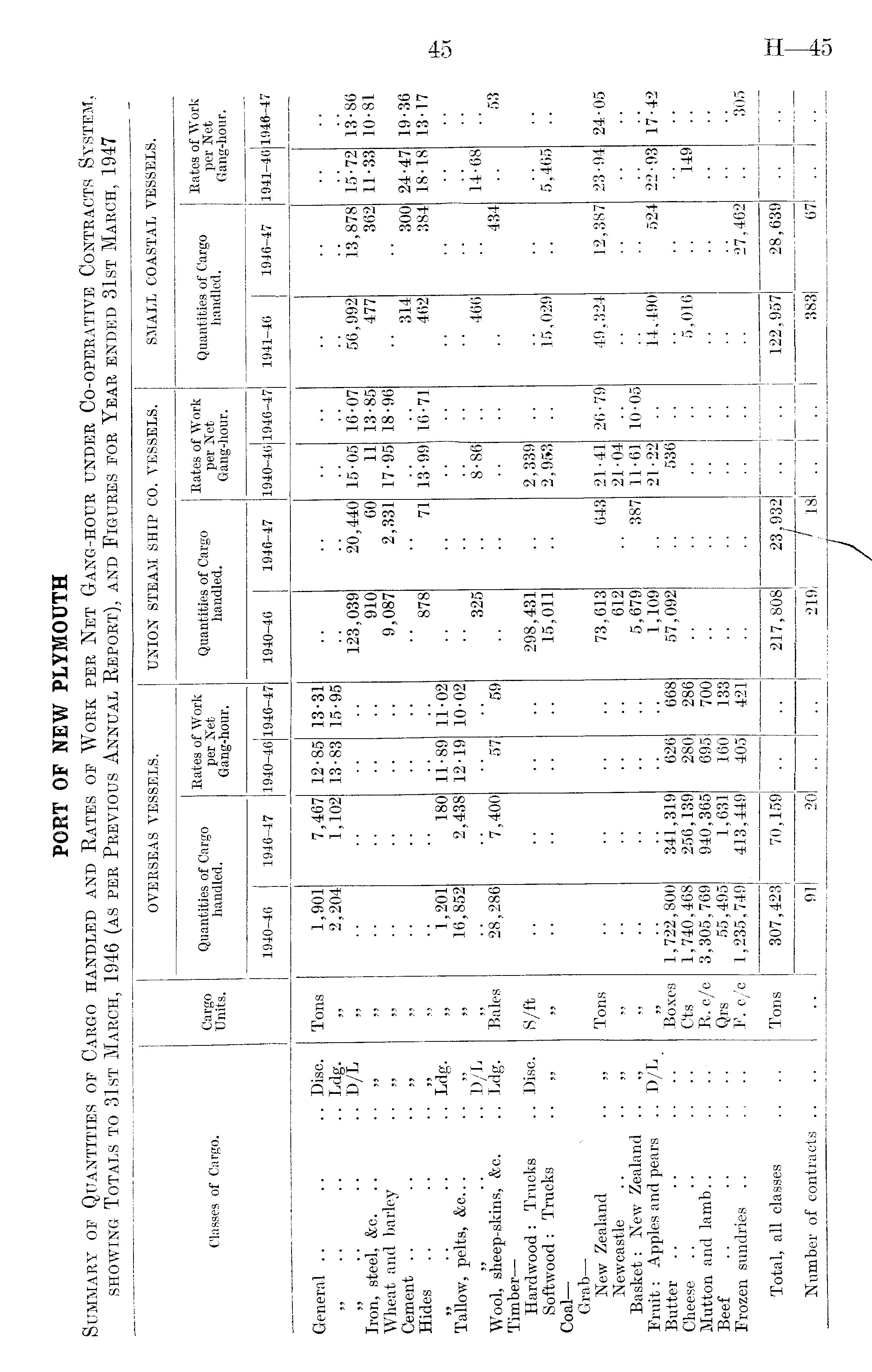 PORT OF NEW PLYMOUTH Summary of Quantities of Cargo handled and Rates of Work per Net Gang-hour under Co-operative Contracts System, showing Totals to 31st March, 1946 (as per Previous Annual Report), and Figures for Year ended 31st March, 1947