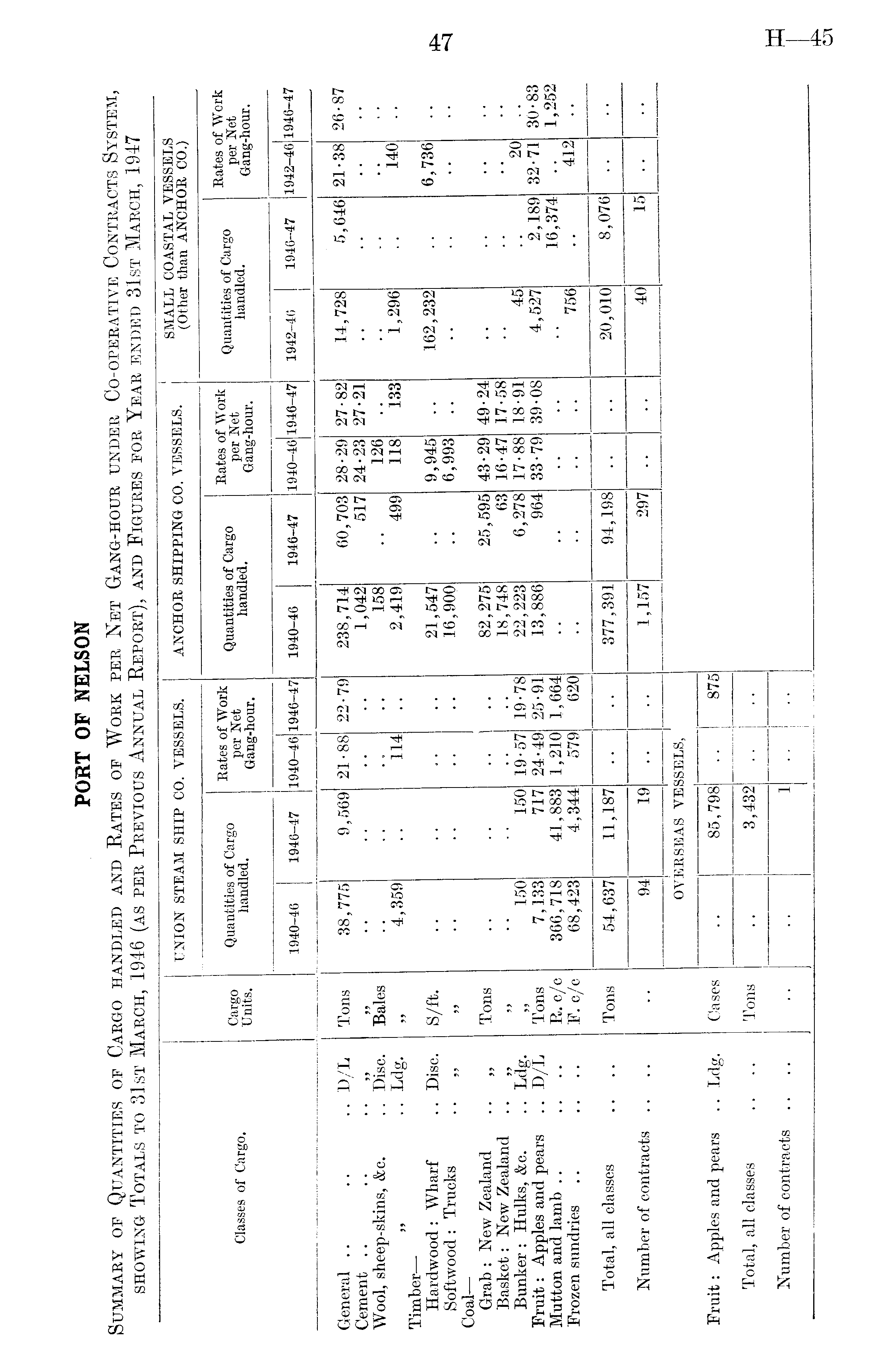 PORT OF NELSON Summary of Quantities of Cargo handled and Rates of Work per Net Gang-hour under Co-operative Contracts System, showing Totals to 31st March, 1946 (as per Previous Annual Report), and Figures for Year ended 31st March, 1947