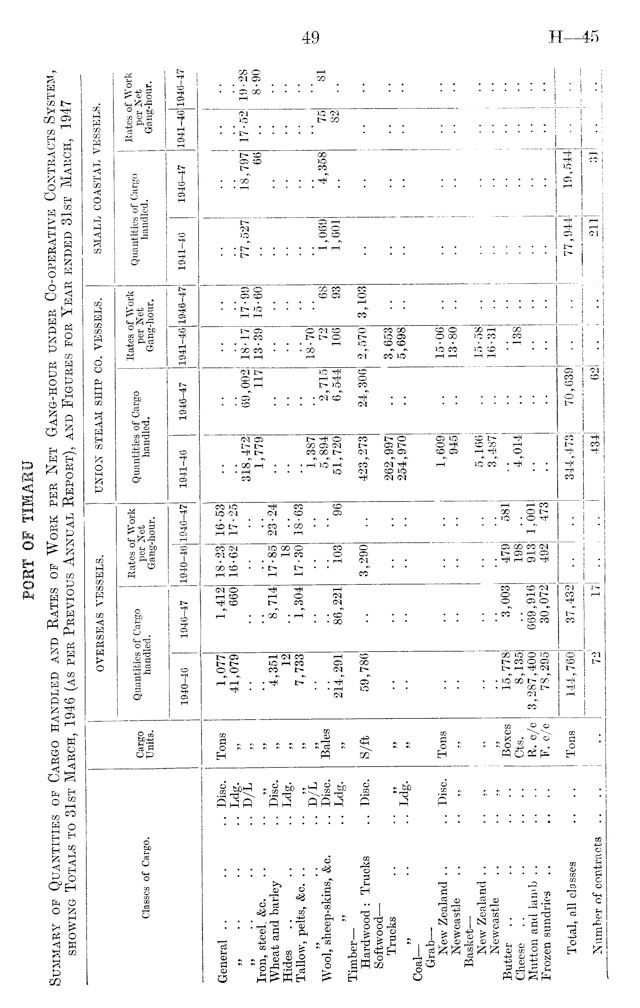 PORT OF TIMARU Summary of Quantities of Cargo handled and Rates of Work per Net Gang-hour under Co-operative Contracts System, showing Totals to 31st March, 1946 (as per Previous Annual Report), and Figures for Year ended 31st March, 1947