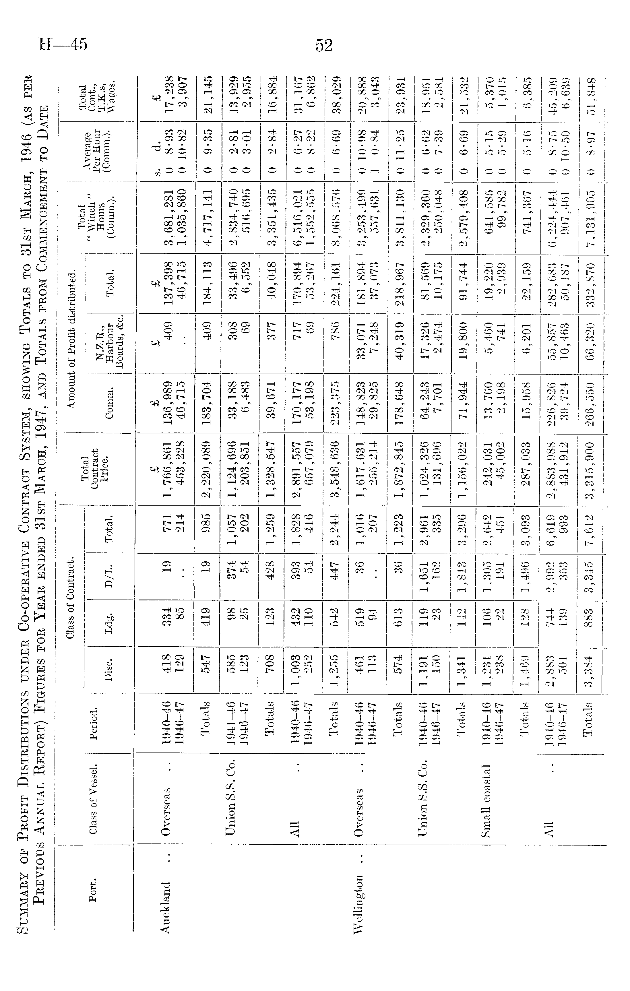 Class of Vessel. Period. Class of Contract. Total Contract Price. Amount of Profit distributed. Total " Winch " Hours (Comm.). Average Per Hour (Comm.). Total Port. Disc. Ldg. D/L. Total. Comm. N.Z.R., Harbour Boards, &c. Total. Cont., T.K.s, Wages. Auckland Overseas Union S.S. Co. All Overseas Union S.S. Co. Small coastal All 1940-46 1946-47 Totals 1941-46 1946-47 Totals 1940-46 1946-47 Totals 1940-46 1946-47 Totals 1940-46 1946-47 Totals 1940-46 1946-47 Totals 1940-46 1946-47 Totals 418 129 334 85 19 771 214 £ 1,766,861 453,228 £ 136,989 46,715 £ 409 £ 137,398 46,715 3,681,281 1,035,860 s. d. 0 8-93 0 10-82 £ 17,238 3,907 547 419 19 985 2,220,089 183,704 409 184,113 4,717,141 0 9-35 21,145 585 123 98 25 374 54 1,057 202 1,124,696 203,851 33,188 6,483 308 69 33,496 6,552 2,834,740 516,695 0 2-81 0 3-01 13,929 2,955 708 123 428 1,259 1,328,547 39,671 377 40,048 3,351,435 0 2-84 16,884 1,003 252 432 110 393 54 1,828 416 2,891,557 657,079 170,177 53,198 717 69 170,894 53,267 6,516,021 1,552,555 0 6-27 0 8-22 31,167 6,862 1,255 542 447 2,244 3,548,636 223,375 786 224,161 8,068,576 0 6-69 38,029 Wellington .. 461 113 519 94 36 1,016 207 1,617,631 255,214 148,823 29,825 33,071 7,248 181,894 37,073 3,253,499 557,631 0 10-98 1 0-84 20,888 3,043 574 613 36 1,223 1,872,845 178,648 40,319 218,967 3,811,130 0 11-25 23,931 1,191 150 119 23 1,651 162 2,961 335 1,024,326 131,696 64,243 7,701 17,326 2,474 81,569 10,175 2,329,360 250,048 0 6-62 0 7-39 18,951 2,581 1,341 142 1,813 3,296 1,156,022 71,944 19,800 91,744 2,579,408 0 6-69 21,532 1,231 238 106 22 1,305 191 2,642 451 242,031 45,002 13,760 2,198 5,460 741 19,220 2,939 641,585 99,782 0 5-15 0 5-29 5,370 1,015 1,469 128 1,496 3,093 287,033 15,958 6,201 22,159 741,367 0 5-16 6,385 2,883 501 744 139 2,992 353 6,619 993 2,883,988 431,912 226,826 39,724 55,857 10,463 282,683 50,187 6,224,444 907,461 0 8-75 0 10-50 45,209 6,639 3,384 883 3,345 7,612 3,315,900 266,550 66,320 332,870 7,131,905 0 8-97 51,848