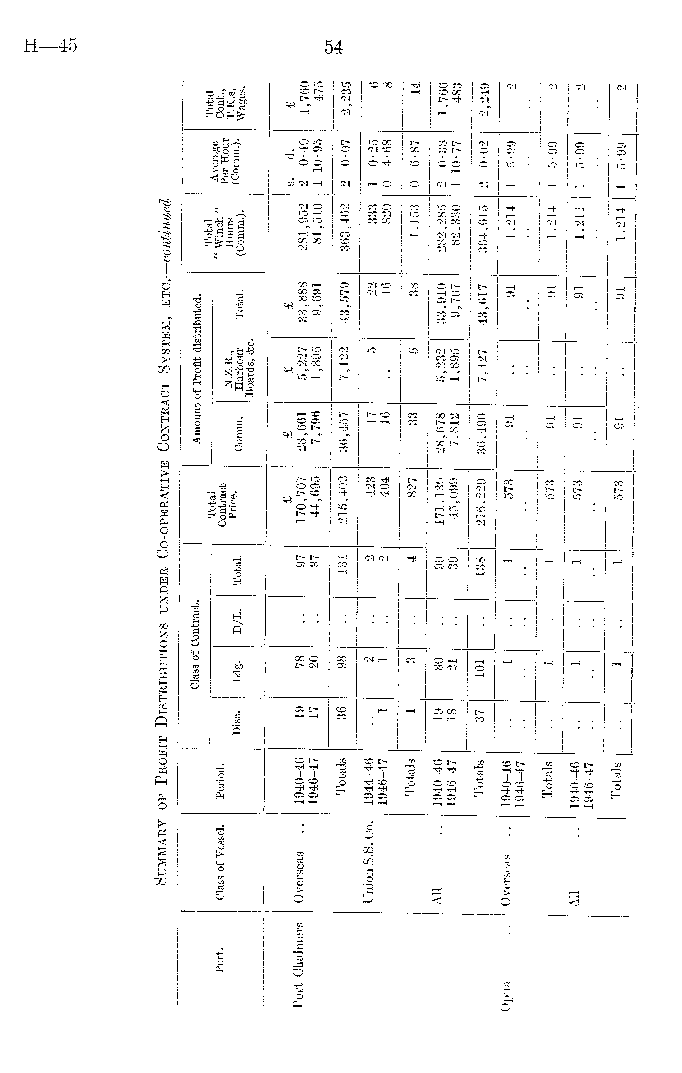 Class of Vessel. Period. Class of Contract. Total Contract Price. Amount of Profit distributed. Total " Winch " Hours (Comm.). Average Per Hour (Comm.). Total Cont., T.K.s, Wages. Port. Disc. Ldg. D/L. Total. Comm. N.Z.R., Harbour Boards, &c Total. Port Chalmers Overseas Union S.S. Co. All Overseas .. All 1940-46 1946-47 Totals 1944-46 1946-47 Totals 1940-46 1946-47 Totals 1940-46 1946-47 Totals 1940-46 1946-47 Totals 19 17 78 20 97 37 £ 170,707 44,695 £ 28,661 7,796 £ 5,227 1,895 £ 33,888 9,691 281,952 81,510 s. d. 2 0-40 1 10-95 £ 1,760 475 36 98 134 215,402 36,457 7,122 43,579 363,462 2 0-07 2,235 1 2 1 2 2 423 404 17 16 5 22 16 333 820 1 0-25 0 4-68 6 8 1 3 4 827 33 5 38 1,153 0 6-87 14 19 18 80 21 99 39 171,130 45,099 28,678 7,812 5,232 1,895 33,910 9,707 282,285 82,330 2 0-38 1 10-77 1,766 483 37 101 138 216,229 36,490 7,127 43,617 364,615 2 0-02 2,249 Opua 1 1 573 91 91 1,214 1 5-99 2 1 1 573 91 91 1,214 1 5-99 2 1 1 573 91 91 1,214 1 5-99 2 1 1 573 91 91 1,214 1 5-99 2