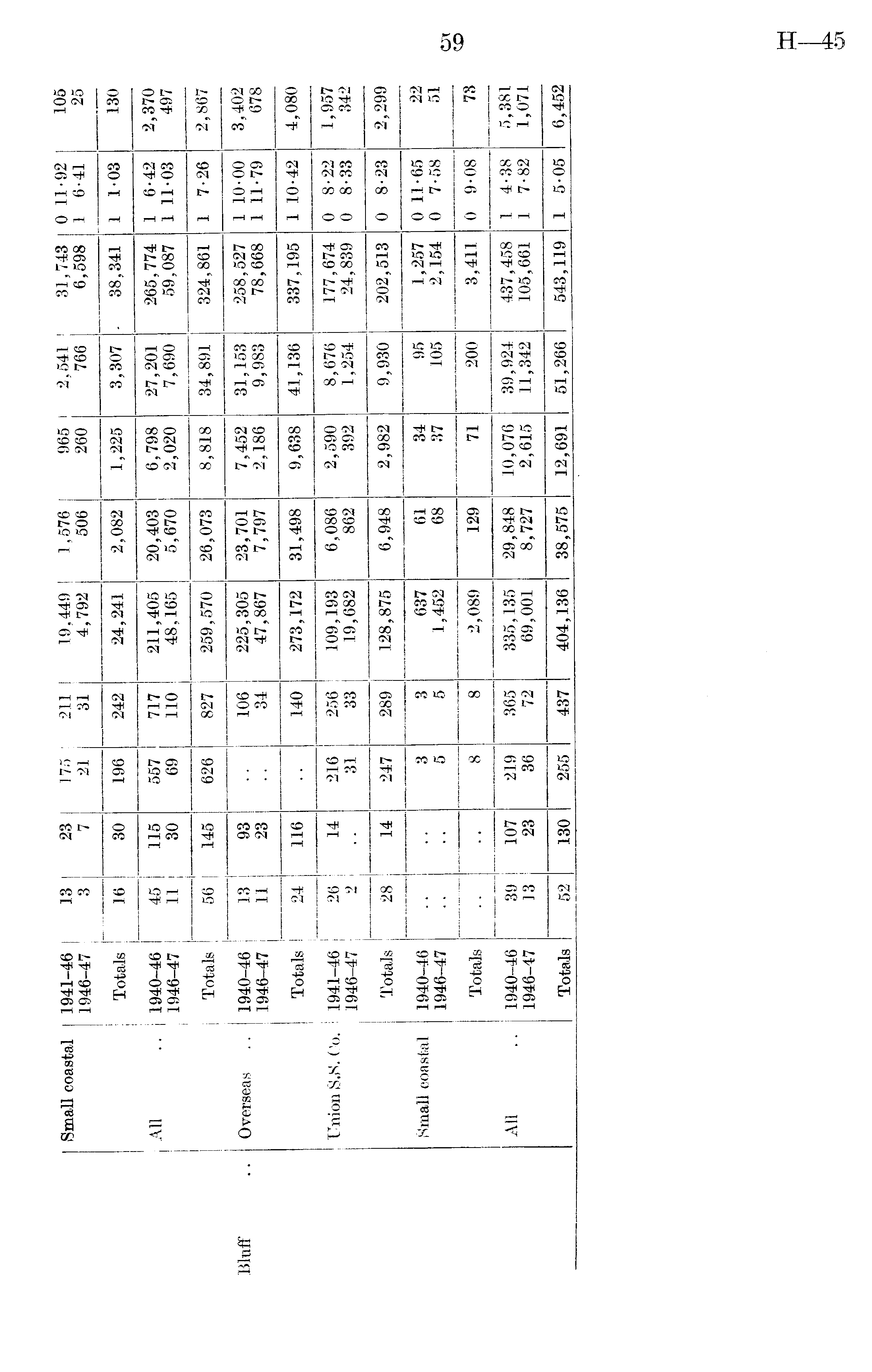 Small coastal All Overseas Union S.S. Co. Small coastal All 1941-46 1946-47 Totals 1940-46 1946-47 Totals 1940-46 1946-47 Totals 1941-46 1946-47 Totals 1940-46 1946-47 Totals 1940-46 1946-47 Totals 13 3 23 7 175 21 211 31 19,449 4,792 1,576 506 965 260 2,541 766 31,743 6,598 0 11-92 1 6-41 105 25 16 30 196 242 24,241 2,082 1,225 3,307 - 38,341 1 1-03 130 45 11 115 30 557 69 717 110 211,405 48,165 20,403 5,670 6,798 2,020 27,201 7,690 265,774 59,087 1 6-42 1 11-03 2,370 497 56 145 626 827 259,570 26,073 8,818 34,891 324,861 1 7-26 2,867 Bluff 13 11 93 23 106 34 225,305 47,867 23,701 7,797 7,452 2,186 31,153 9,983 258,527 78,668 1 10-00 1 11-79 3,402 678 24 116 140 273,172 31,498 9,638 41,136 337,195 1 10-42 4,080 26 2 14 216 31 256 33 109,193 19,682 6,086 862 2,590 392 8,676 1,254 177,674 24,839 0 8-22 0 8-33 1,957 342 28 14 247 289 128,875 6,948 2,982 9,930 202,513 0 8-23 2,299 3 5 3 5 637 1,452 61 68 34 37 95 105 1,257 2,154 0 11-65 0 7-58 22 51 8 8 2,089 129 71 200 3,411 0 9-08 73 39 13 107 23 219 36 365 72 335,135 69,001 29,848 8,727 10,076 2,615 39,924 11,342 437,458 105,661 1 4-38 1 7-82 5,381 1,071 52 130 255 437 404,136 38,575 12,691 51,266 543,119 1 5-05 6,452