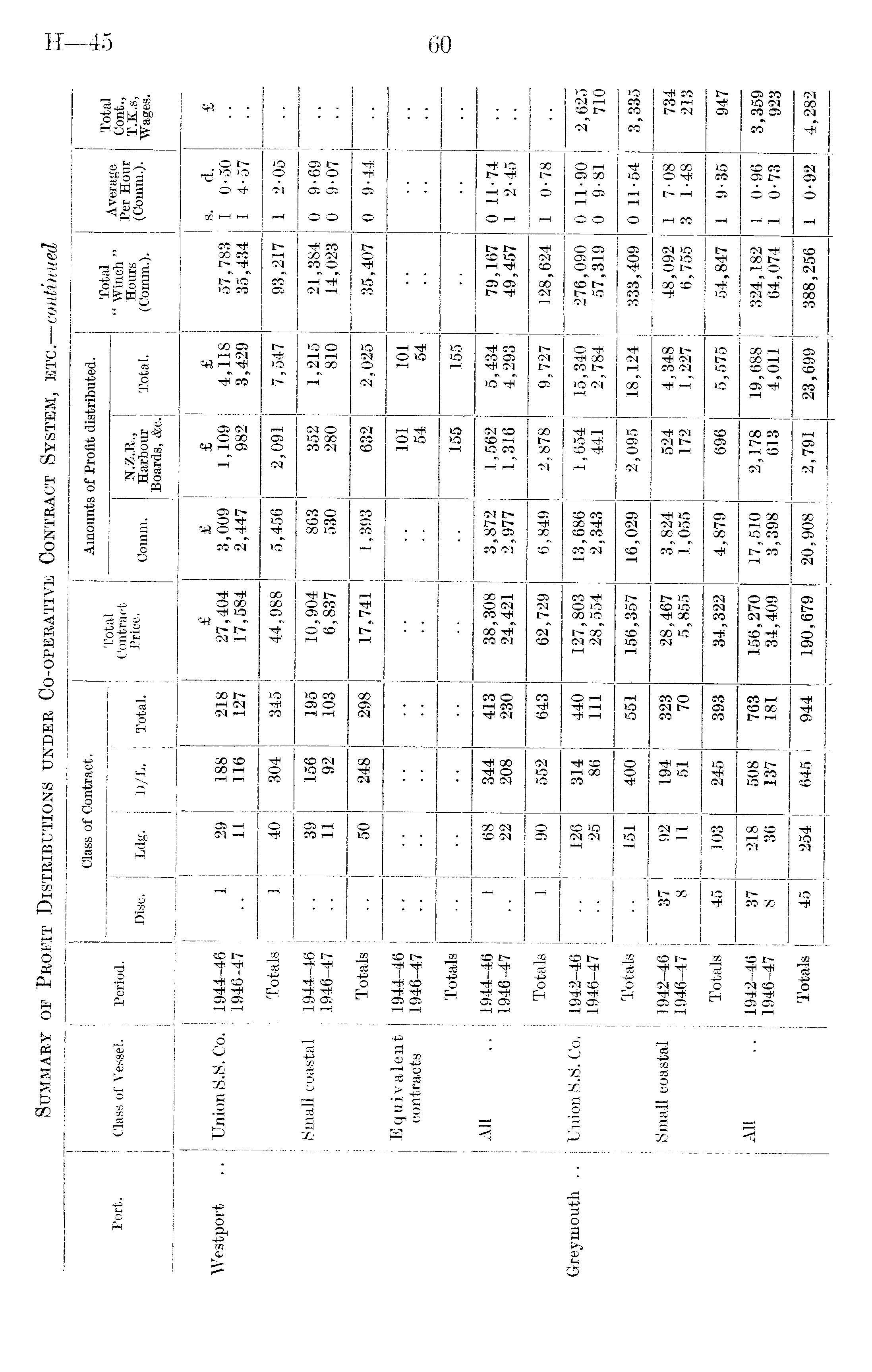 Class of Vessel. Period. Class of Contract. Total Contract Price. Amounts of Profit distributed. Total " Winch " Hours (Comm.). Average Per Hour (Comm.). Total Port. Disc. Ldg. D/L. Total. Coinrn. Harbour Boards, &c. Total. Cont., T.K.s, Wages. Westport Union S.S. Co. Small coastal Equivalent contracts All Union S.S. Co. Small coastal All 1944-46 1946-47 Totals 1944-46 1946-47 Totals 1944-46 1946-47 Totals 1944-46 1946-47 Totals 1942-46 1946-47 Totals 1942-46 1946-47 Totals 1942-46 1946-47 Totals 1 29 11 188 116 218 127 £ 27,404 17,584 £ 3,009 2,447 £ 1,109 982 £ 4,118 3,429 57,783 35,434 s. d. 1 0-50 1 4-57 £ 1 40 304 345 44,988 5,456 2,091 7,547 93,217 1 2-05 39 11 156 92 195 103 10,904 6,837 863 530 352 280 1,215 810 21,384 14,023 0 9-69 0 9-07 50 248 298 17,741 1,393 632 2,025 35,407 0 9-44 101 54 101 54 155 155 1 68 22 344 208 413 230 38,308 24,421 3,872 2,977 1,562 1,316 5,434 4,293 79,167 49,457 0 11-74 1 2-45 1 90 552 643 62,729 6,849 2,878 9,727 128,624 1 0-78 Greymouth .. 126 25 314 86 440 111 127,803 28,554 13,686 2,343 1,654 441 15,340 2,784 276,090 57,319 0 11-90 0 9-81 2,625 710 151 400 551 156,357 16,029 2,095 18,124 333,409 0 11-54 3,335 37 8 92 11 194 51 323 70 28,467 5,855 3,824 1,055 524 172 4,348 1,227 48,092 6,755 1 7-08 3 1-48 734 213 45 103 245 393 34,322 4,879 696 5,575 54,847 1 9-35 947 37 8 218 36 508 137 763 181 156,270 34,409 17,510 3,398 2,178 613 19,688 4,011 324,182 64,074 1 0-96 1 0-73 3,359 923 45 254 645 944 190,679 20,908 2,791 23,699 388,256 1 0-92 4,282