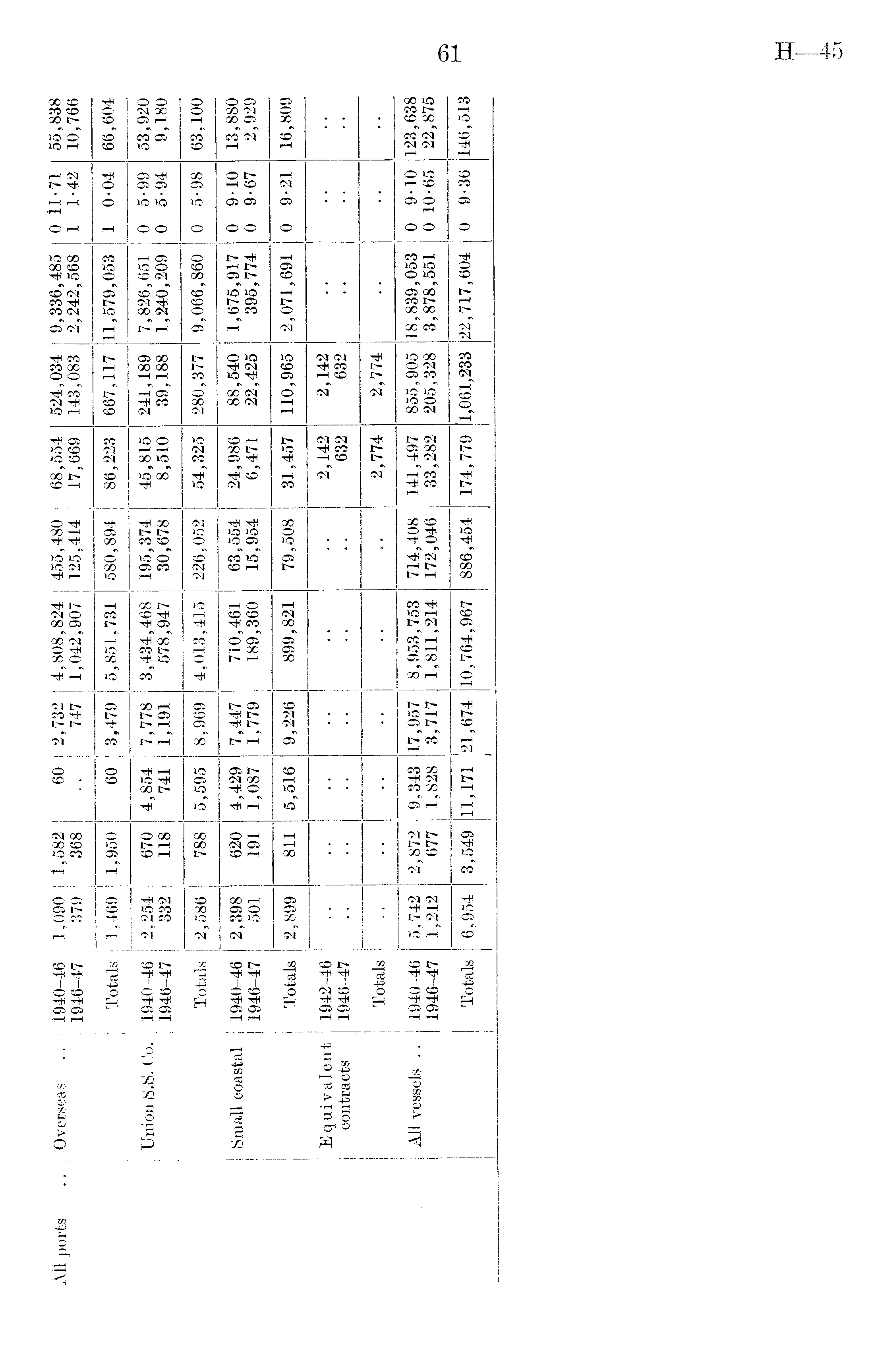 All ports Overseas Union S.S. Co. (Small coastal Equivalent contracts All vessels . . 1940-46 1946-47 Totals 1940-46 1946-47 Totals 1940-46 1946-47 Totals 1942-46 1946-47 Totals 1940-46 1946-47 Totals 1,090 379 1,582 368 60 2,732 747 4,808,824 1,042,907 455,480 125,414 68,554 17,669 524,034 143,083 9,336,485 2,242,568 0 1 11-71 1-42 55,838 10,766 1,469 1,950 60 3,479 5,851,731 580,894 86,223 667,117 11,579,053 1 0-04 66,604 2,254 332 670 118 4,854 741 7,778 1,191 3,434,468 578,947 195,374 30,678 45,815 8,510 241,189 39,188 7,826,651 1,240,209 0 0 5-99 5-94 53,920 9,180 2,586 788 5,595 8,969 4,013,415 226,052 54,325 280,377 9,066,860 0 5-98 63,100 2,398 501 620 191 4,429 1,087 7,447 1,779 710,461 189,360 63,554 15,954 24,986 6,471 88,540 22,425 1,675,917 395,774 0 0 9-10 9-67 13,880 2,929 2,899 811 5,516 9,226 899,821 79,508 31,457 110,965 2,071,691 0 9-21 16,809 2,142 632 2,142 632 2,774 2,774 5,742 1,212 2,872 677 9,343 1,828 17,957 3,717 8,953,753 1,811,214 714,408 172,046 141,497 33,282 855,905 205,328 18,839,053 3,878,551 0 0 9-10 10-65 123,638 22,875 6,954 3,549 11,171 21,674 10,764,967 886,454 174,779 1,061,233 22,717,604 0 9-36 146,513