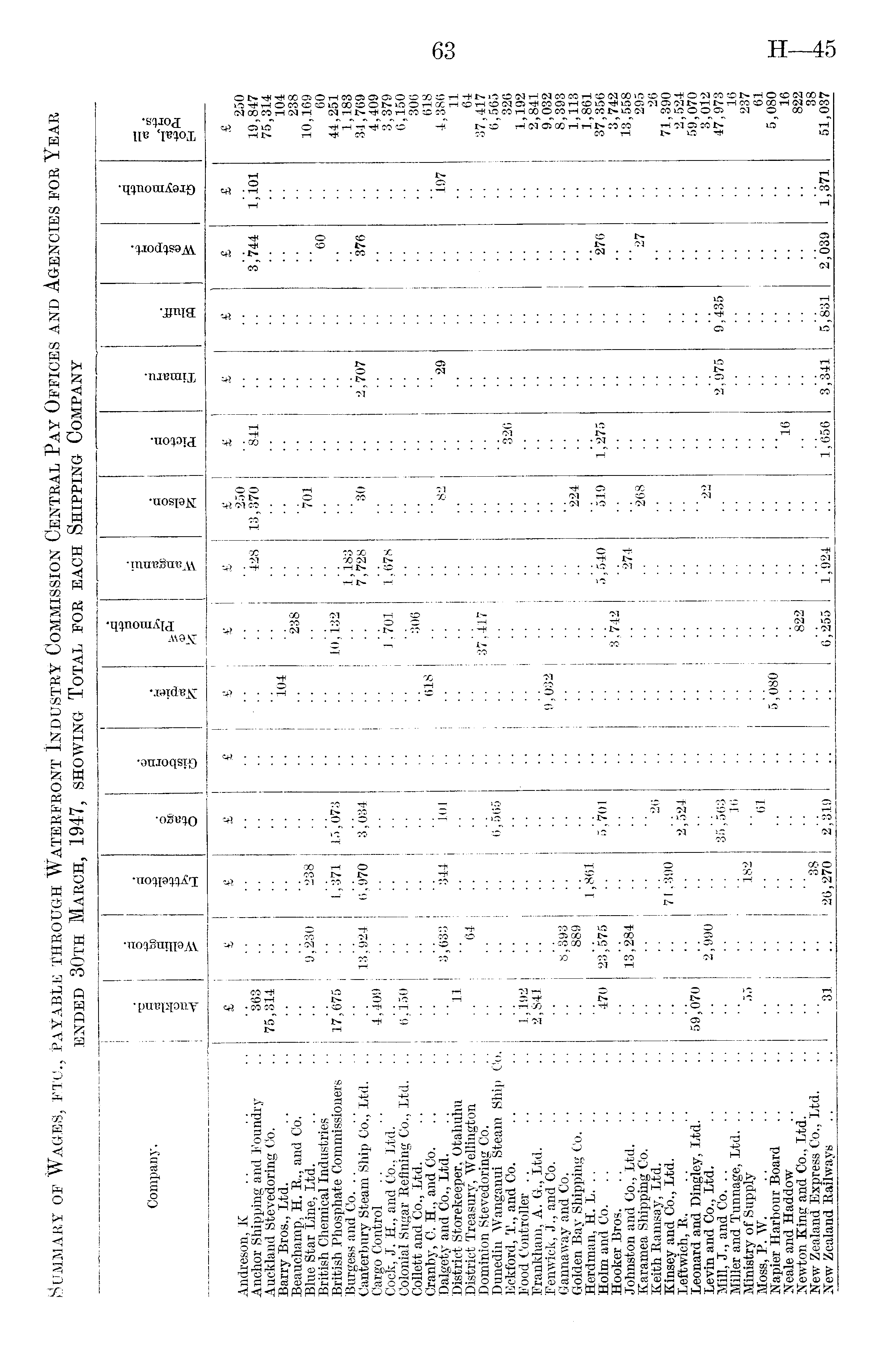 Summary of Wages, etc., payable through Waterfront Industry Commission Central Pay Offices and Agencies for Year ended 30th March, 1947, showing Total for each Shipping Company