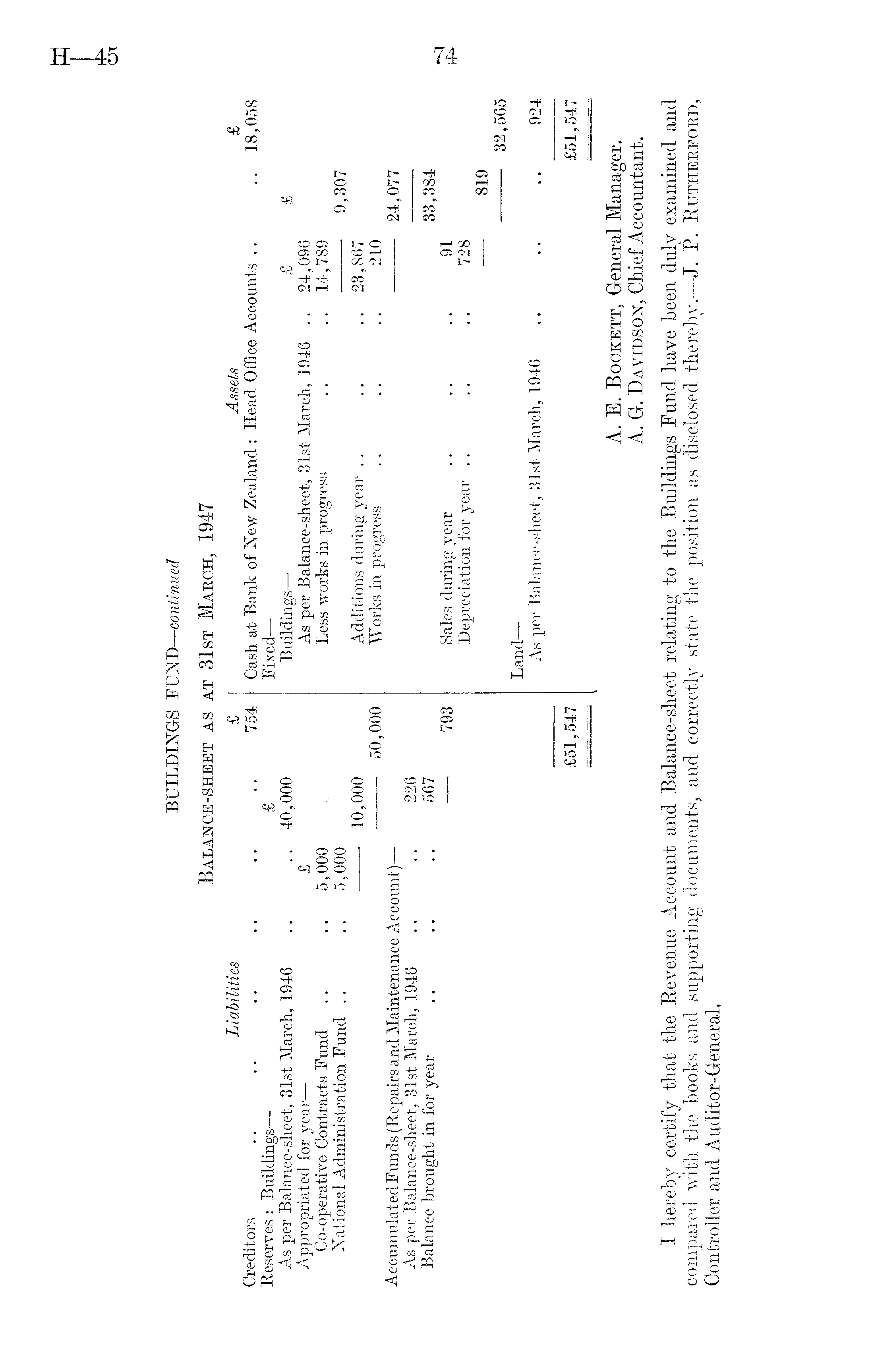 BUILDINGS FUND—continued Balance-sheet as at 31st March, 1947 Liabilities £ Assets £ Creditors .. .. .. .. .. .. 754 Cash at Bank of New Zealand: Head Office Accounts .. .. 18,058 Reserves: Buildings—■ £ Fixed— As per Balance-sheet, 31st March, 1946 .. .. 40,000 Buildings— £ £ Appropriated for year— £ As per Balance-sheet, 31st March, 1.946 .. 24,096 Co-operative Contracts Fund .. .. 5,000 , Less works in progress .. .. 14,789 National Administration Fund .. .. 5,000 9,307 lO,OOO Additions during year . . .. .. 23,867 • 50,000 Works in progress .. .. .. 210 Accumulated Funds (Repairs and Maintenance Account)— 24,077 As per Balance-sheet, 31st March, 1946 .. .. 226 Balance brought in for year .. .. .. 567 33,384 - 793 Sales during year .. .. .. 91 Depreciation for year .. .. .. 728 Bl9 32,565 Land— As per Balance-sheet, 31st March, 1946 .. .. .. 924 £51,547 £51,547 A. E. Bockett, General Manager. A. G. Davidson, Chief Accountant. I hereby certify that the Revenue Account and Balance-sheet relating to the Buildings Fund have been duly examined and compared with the books and supporting documents, and correctly state the position as disclosed thereby.— J. P. Rutherford, Controller and Auditor-General.