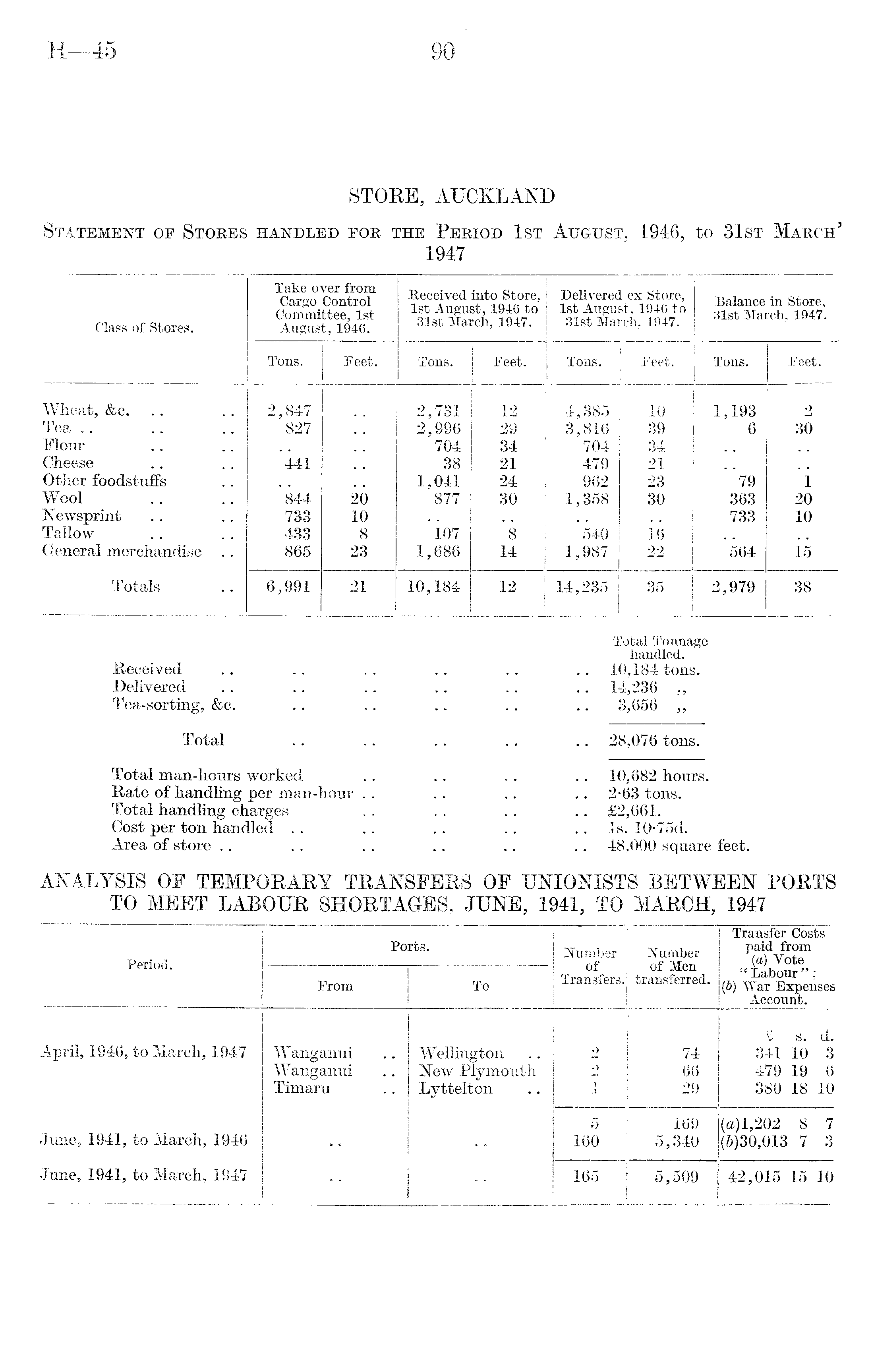 Class of Stores. Take over from Cargo Control Committee, 1st August, 1946. Received into Store, 1st August, 1946 to 31st March, 1947. Delivered ex Store, 1st August, 1940 to 31st March, 1947. Balance in Store, 31st March, 1947. Tons. Feet. Tons. Feet. Tons. Feet. Tons. Feet. Wheat, &c. 2,847 2,731 12 4,385 10 1,193 2 Tea .. 827 2,996 29 3,816 39 6 30 Flour 704 34 704 34 Cheese 441 38 21 479 21 Other foodstiiffs 1,041 24 962 23 79 1 Wool 844 20 877 30 1,358 30 363 20 Newsprint 733 10 733 10 Tallow 433 8 107 8 540 16 General merchandise . 865 23 1,686 14 1,987 22 564 15 Totals 6,991 21 10,184 12 14,235 35 2,979 38