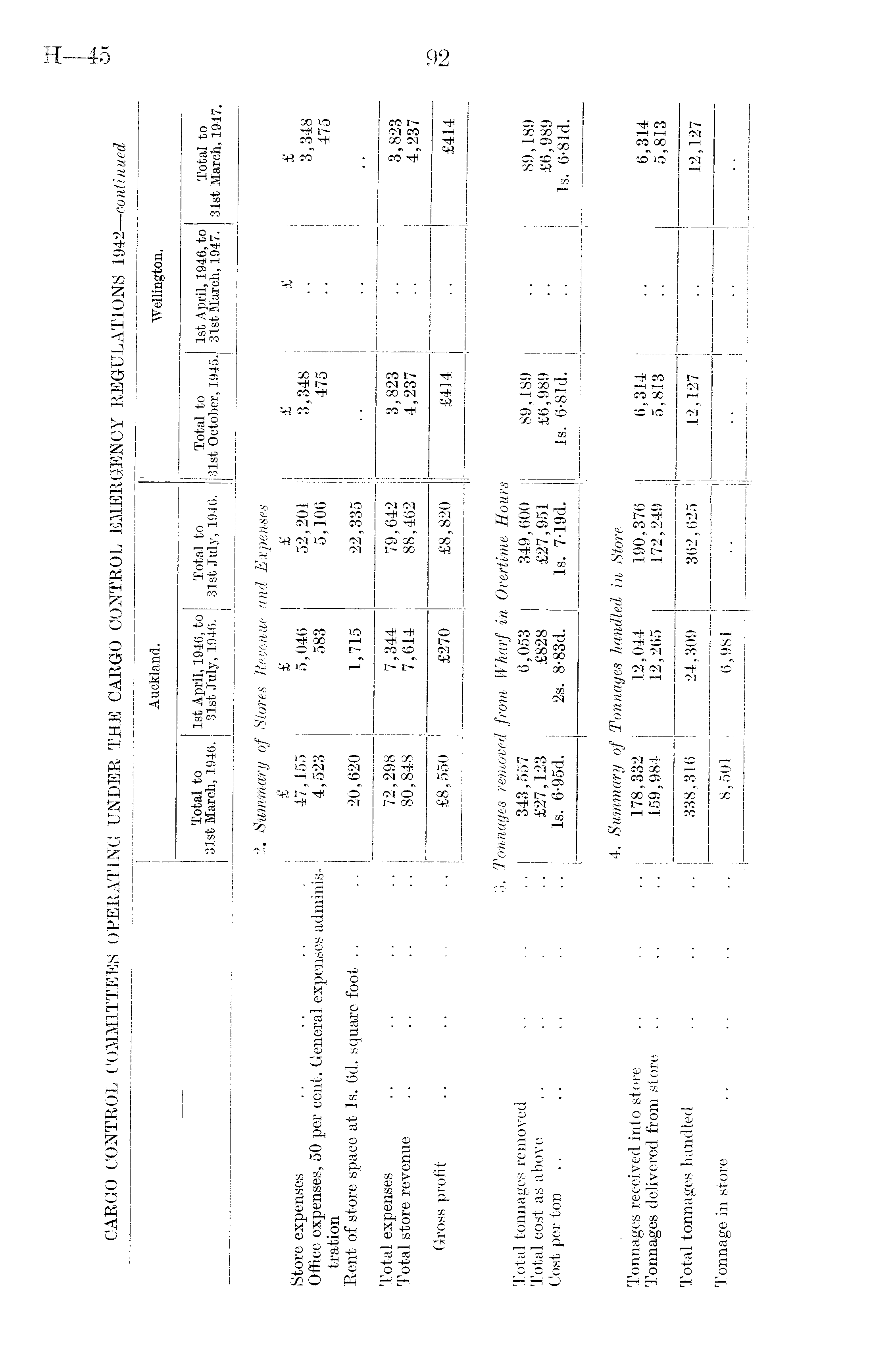 Auckland. ! Wellington. Total to 31st March, 1946. 1st April, 1946, to 31st July, 1946. Total to 31st July, 1946. | Total to 31st October, 1945. 1st April, 1946, to 31st March, 1947. Total to 31st March, 1947. Store expenses Office expenses, 50 per cent. General expenses administration Rent of store space at Is. Od. square foot 2. Summary of Stores Revenue, and Expenses £ £ £ 47,155 5,046 52,201 4,523 583 5,106 20,620 1,715 22,335 £ 3,348 475 £ £ 3,348 475 Total expenses Total store revenue 72,298 80,848 7,344 7,614 79,642 88,462 3,823 4,237 3,823 4,237 Gross profit £8,550 £270 £8,820 £414 £414 3. 1 Total tonnages removed Total cost as above Cost per ton 'onnages removed 343,557 £27,123 Is. 6-95d. from Wharf in 6,053 £828 2s. 8-83d. Overtime Hours 349,600 £27,951 Is. 7-19d. 89,189 £6,989 Is. 6-81d. 89,189 £6,989 Is. 6-81d. Tonnages received into store Tonnages delivered from store 4. Summary of Tonnages handled in Store 178,332 12,044 190,376 159,984 12,265 172,249 6,314 5,813 6,314 5,813 Total tonnages handled 338,316 24,309 362,625 12,127 12,127 Tonnage in store 8,501 6,98.1