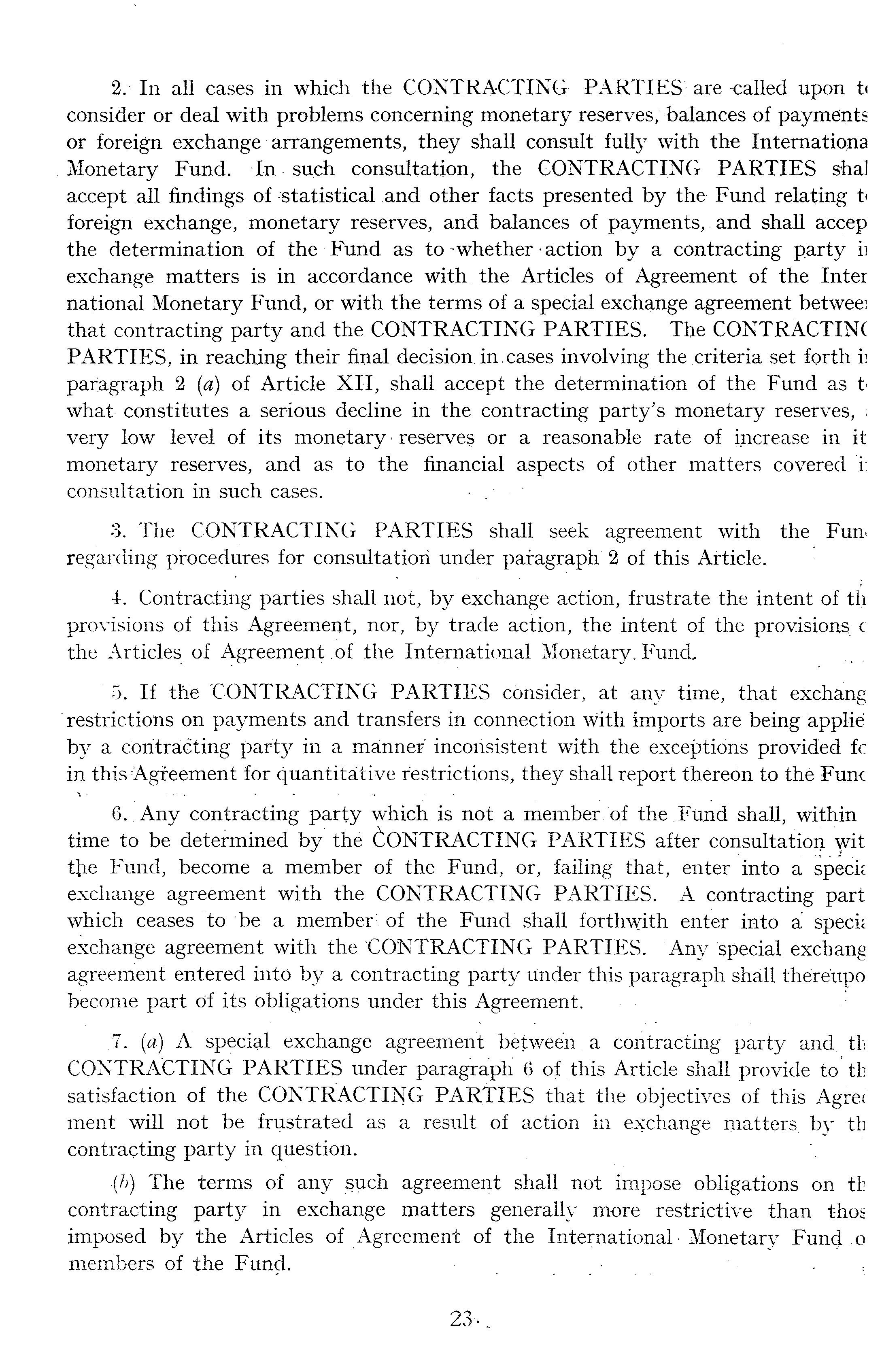 2. In all cases in which the CONTRACTING PARTIES are-called upon t» consider or deal with problems concerning monetary reserves, balances of payments or foreign exchange arrangements, they shall consult fully with the Internationa Monetary Fund. In such consultation, the CONTRACTING PARTIES shal accept all findings of statistical and other facts presented by the Fund relating t< foreign exchange, monetary reserves, and balances of payments,. and shall accep the determination of the Fund as to-whether action by a contracting party ii exchange matters is in accordance with the Articles of Agreement of the Inter national Monetary Fund, or with the terms of a special exchange agreement betweei that contracting party and the CONTRACTING PARTIES. The CONTRACTIN( PARTIES, in reaching their final decision, in.cases involving the criteria set forth h paragraph 2 (a) of Article XII, shall accept the determination of the Fund as t what constitutes a serious decline in the contracting party's monetary reserves, ; very low level of its monetary • reserves or a reasonable rate of increase in it monetary reserves, and as to the financial aspects of other matters covered i: consultation in such cases. - 3. The CONTRACTING PARTIES shall seek agreement with the Fun regarding procedures for consultation under paragraph 2 of this Article. 4. Contracting parties shall not, by exchange action, frustrate the intent of th provisions of this Agreement, nor, by trade action, the intent of the provisions c the Articles of Agreement .of the International Monetary. Fund, 5. If the "CONTRACTING PARTIES consider, at any time, that exchang restrictions on payments and transfers in connection with imports are being applie by a Contracting party in a manner inconsistent with the exceptions provided fc in this Agreement for quantitative restrictions, they shall report thereon to the Func 6. , Any contracting party which is not a member, of the .Fund shall, within time to be determined by the (CONTRACTING PARTIES after consultation wit Fund, become a member of the Fund, or, failing that, enter into a specie exchange agreement with the CONTRACTING PARTIES. A contracting part which ceases to be a member of the Fund shall forthwith enter into a speci; exchange agreement with the CONTRACTING PARTIES. Any special exchang agreement entered into by a contracting party under this paragraph shall thereupo become part of its obligations under this Agreement. ,7. (a) A special exchange agreement between a contracting party and. th CONTRACTING PARTIES under paragraph 6 of this Article shall provide to th satisfaction of the CONTRACTING PARTIES that the objectives of this Agre< ment will not be frustrated as a result of action in exchange matters, by th contracting party in question. {b). The terms of any such agreement shall not impose obligations on th contracting party in exchange matters generally more restrictive than t-hos imposed by the Articles of Agreement of the International Monetary Fund o members of the Fund. .