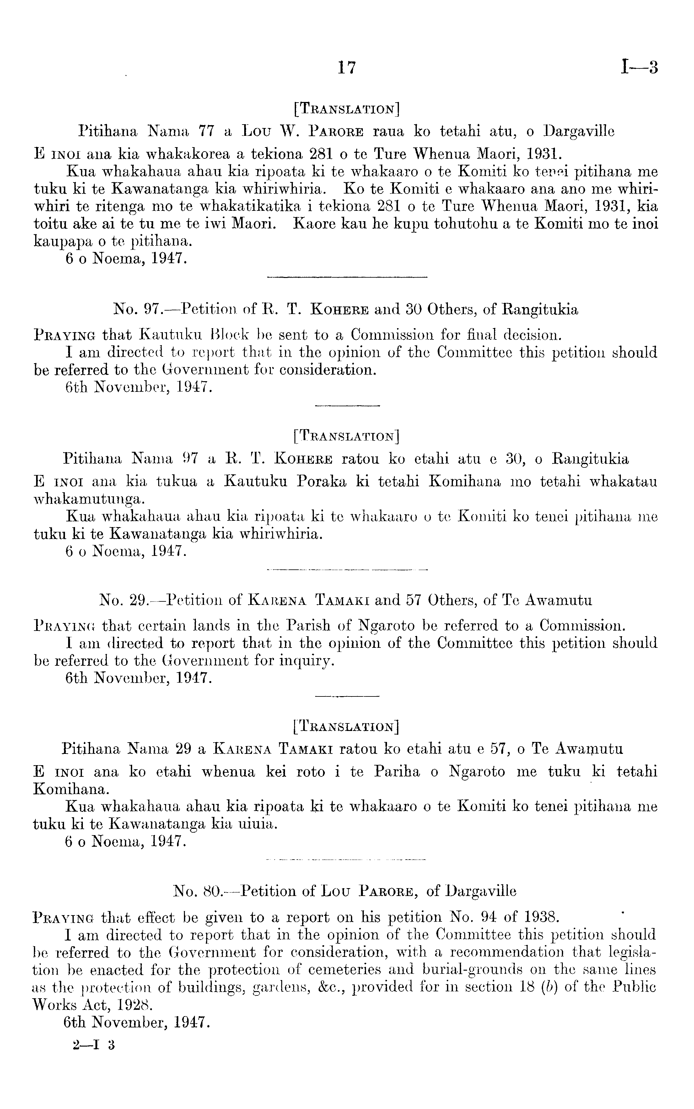[Translation] Pitihana Nama 77 a Lou W. Parore raua ko tetahi atu, o Dargaville E inoi ana kia whakakorea a tekiona 281 o te Ture Whenua Maori, 1931. Kua whakahaua ahau kia ripoata kite whakaaro o te Komiti ko tenei pitihana me tuku kite Kawanatanga kia whiriwhiria. Ko te Komiti e whakaaro ana ano me whiriwhiri te ritenga mo te whakatikatika i tekiona 281 o te Ture Whenua Maori, 1931, kia toitu ake ai te tu mete iwi Maori. Kaore kau he kupu tohutohu ate Komiti mo te inoi kaupapa o te pitihana. 6 o Noema, 1947. No. 97.—Petition of R. T. Kohere and 30 Others, of Rangitukia Praying that Kautuku Block be sent to a Commission for final decision, I am directed to report that in the opinion of the Committee this petition should be referred to the Government for consideration. 6th November, 1947. [Translation] Pitihana Nama 97 a R. T. Kohere ratou ko etahi atu e 30, o Rangitukia E inoi ana kia tukua a Kautuku Poraka ki tetahi Komihana mo tetahi whakatau whakamutunga. Kua whakahaua ahau kia ripoata kite whakaaro o te Komiti ko tenei pitihana me tuku kite Kawanatanga kia whiriwhiria. 6 o Noema, 1947. No. 29. —Petition of Karena Tamaki and 57 Others, of Te Awamutu Praying that certain lands in the Parish of Ngaroto be referred to a Commission. I am directed to report that in the opinion of the Committee this petition should be referred to the Government for inquiry. 6th November, 1947. [Translation] Pitihana Nama 29 a Karena Tamaki ratou ko etahi atu e 57, o Te Awamutu E inoi ana ko etahi whenua kei roto i te Pariha o Ngaroto me tuku ki tetahi Komihana. Kua whakahaua ahau kia ripoata kite whakaaro o te Komiti ko tenei pitihana me tuku kite Kawanatanga kia uiuia. 6 o Noema, 1947. No. 80. —Petition of Lou Parore, of Dargaville Praying that effect be given to a report on his petition No. 94 of 1938. I am directed to report that in the opinion of the Committee this petition should be referred to the Government for consideration, with a recommendation that legislation be enacted for the protection of cemeteries and burial-grounds on the same lines as the protection of buildings, gardens, &c., provided for in section 18 (b) of the Public Works Act, 1928. 6th November, 1947. 2—l 3
