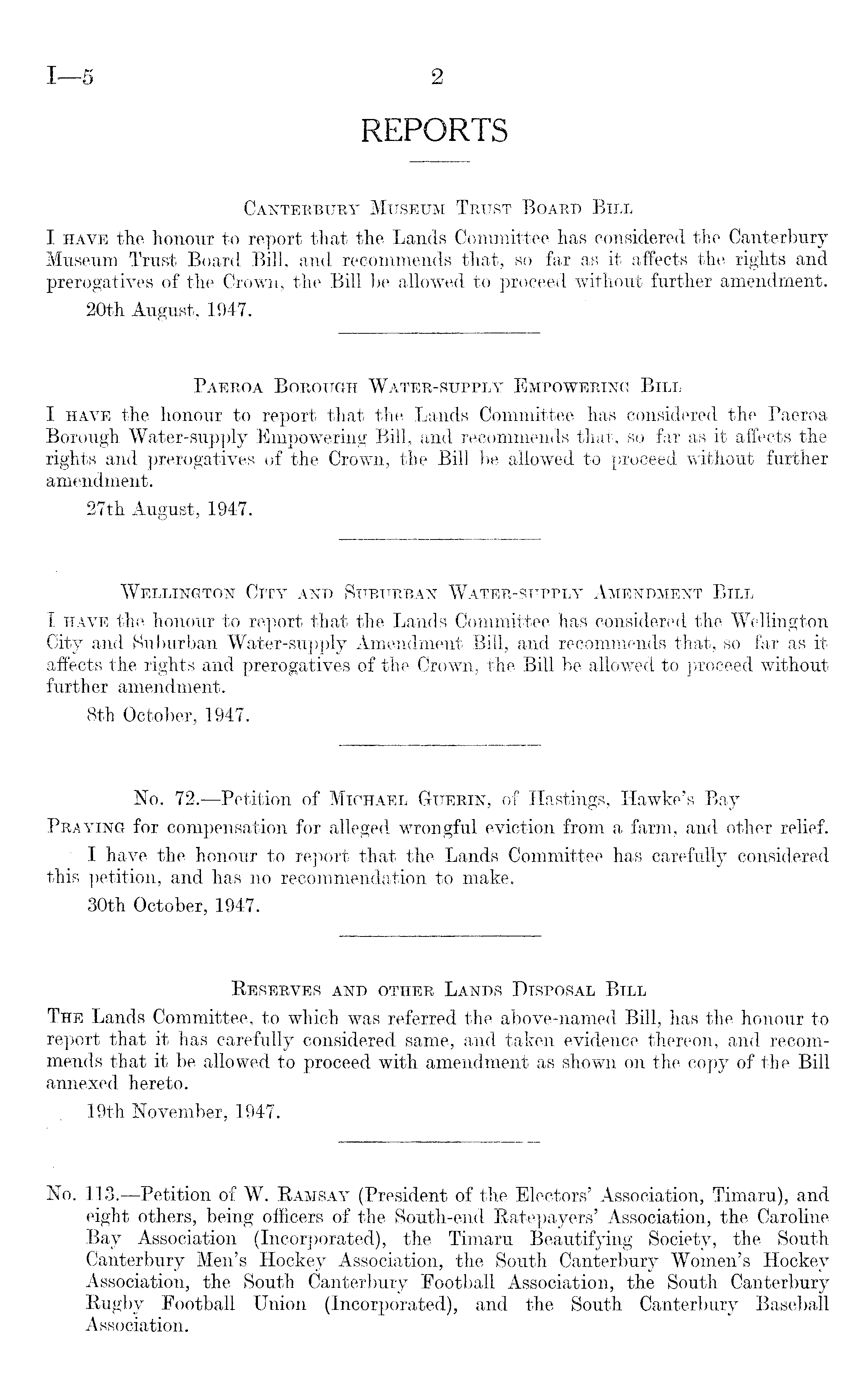 REPORTS Canterbury Museum Trust Board Bill I have the honour to report that the Lands Committee has considered the Canterbury Museum Trust Board Bill, and recommends that, so far as it affects the rights and prerogatives of the Crown, the Bill be allowed to proceed without further amendment. 20th August, 1947. Paeroa Borough Water-supply Empowering Bill I have the honour to report that the Lands Committee has considered the Paeroa Borough Water-supply Empowering Bill, and recommends that, so far as it affects the rights and prerogatives of the Crown, the Bill be allowed to proceed without further amendment. 27th August, 1947. Wellington City and Suburban Water-supply Amendment Bill I have the honour to report that the Lands Committee has considered the Wellington City and Suburban Water-supply Amendment Bill, and recommends that, so far as it affects the rights and prerogatives of the Crown, the Bill be allowed to proceed without further amendment. Bth October, 1947. No. 72.—Petition of Michael Guerin, of Hastings, Hawke's Bay Praying for compensation for alleged wrongful eviction from a farm, and other relief. I have the honour to report that the Lands Committee has carefully considered this petition, and has no recommendation to make. 30th October, 1947. Reserves and other Lands Disposal Bill The Lands Committee, to which was referred the above-named Bill, has the honour to report that it has carefully considered same, and taken evidence thereon, and recommends that it be allowed to proceed with amendment as shown on the copy of the Bill annexed hereto. 19th November, 1947. No. 113. —Petition of W. Ramsay (President of the Electors' Association, Timaru), and eight others, being officers of the South-end Ratepayers' Association, the Caroline Bay Association (Incorporated), the Timaru Beautifying Society, the South Canterbury Men's Hockey Association, the South Canterbury Women's Hockey Association, the South Canterbury Football Association, the South Canterbury Rugby Football Union (Incorporated), and the South Canterbury Baseball Association.