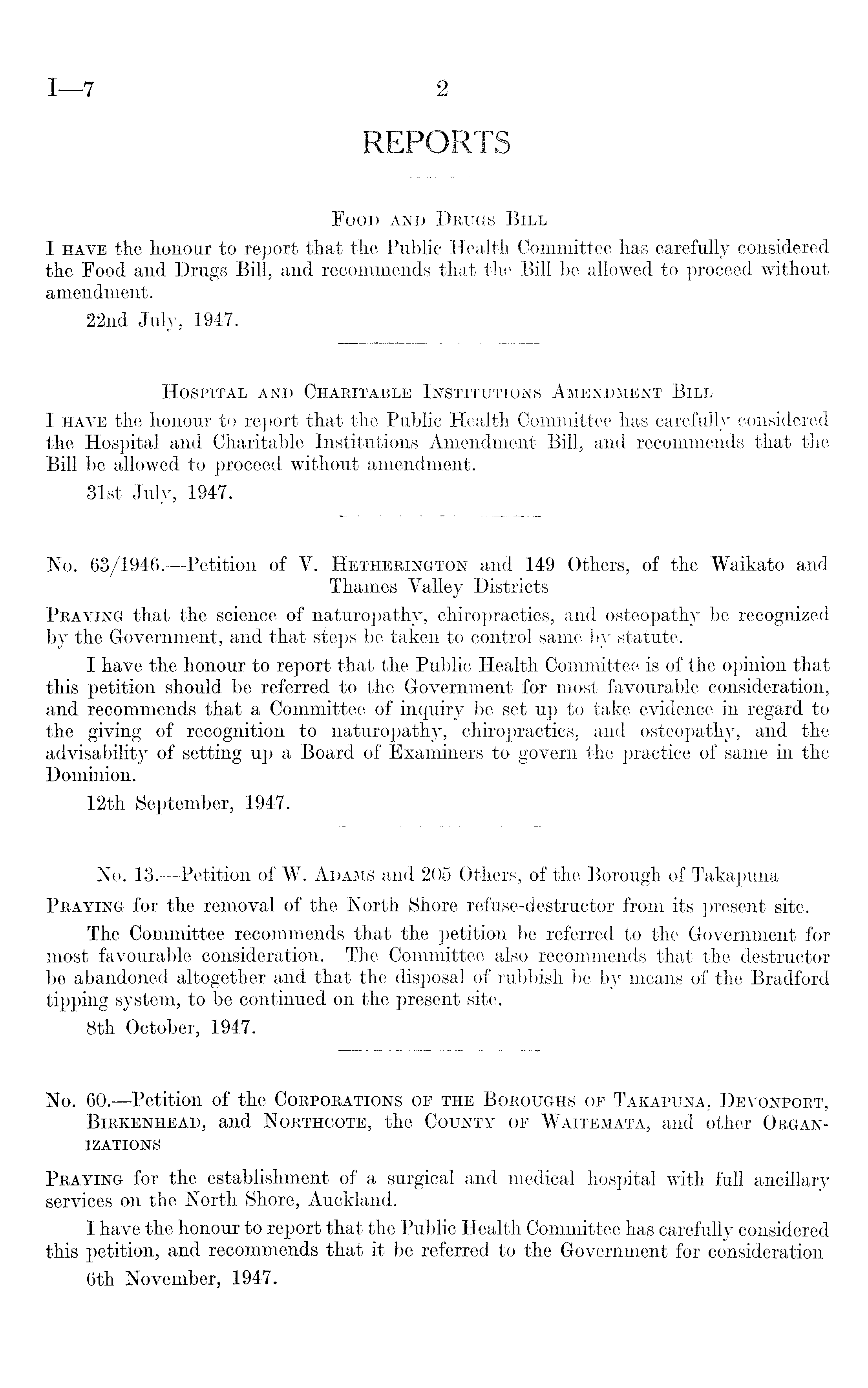 REPORTS Food and Drugs Bill I have the honour to report that the Public Health Committee has carefully considered the Food and Drugs Bill, and recommends that the Bill be allowed to proceed without amendment. 22nd July, 1947. Hospital and Charitable Institutions Amendment Bill I have the honour to report that the Public Health Committee has carefully considered the Hospital and Charitable Institutions Amendment Bill, and recommends that the Bill be allowed to proceed without amendment. 31st July, 1947. No. 63/1946. —Petition of V. Hetherington and 149 Others, of the Waikato and Thames Valley Districts Praying that the science of naturopathy, ehiropractics, and osteopathy be recognized by the Government, and that steps be taken to control same by statute. I have the honour to report that the Public Health Committee is of the opinion that this petition should be referred to the Government for most favourable consideration, and recommends that a Committee of inquiry be set up to take evidence in regard to the giving of recognition to naturopathy, ehiropractics, and osteopathy, and the advisability of setting up a Board of Examiners to govern the practice of same in the Dominion. 12th September, 1947. No. 13. —Petition of W. Adams and 205 Others, of the Borough of Takapuna Praying for the removal of the North Shore refuse-destructor from its present site. The Committee recommends that the petition be referred to the Government for most favourable consideration. The Committee also recommends that the destructor be abandoned altogether and that the disposal of rubbish be by means of the Bradford tipping system, to be continued on the present site. Bth October, 1947. No. 60.—Petition of the Corporations of the Boroughs op Takapuna, Devonport, » Birkenhead, and Northcote, the County op Waitemata, and other Organizations Praying for the establishment of a surgical and medical hospital with full ancillary services on the North Shore, Auckland. I have the honour to report that the Public Health Committee has carefully considered this petition, and recommends that it be referred to the Government for consideration 6th November, 1947.