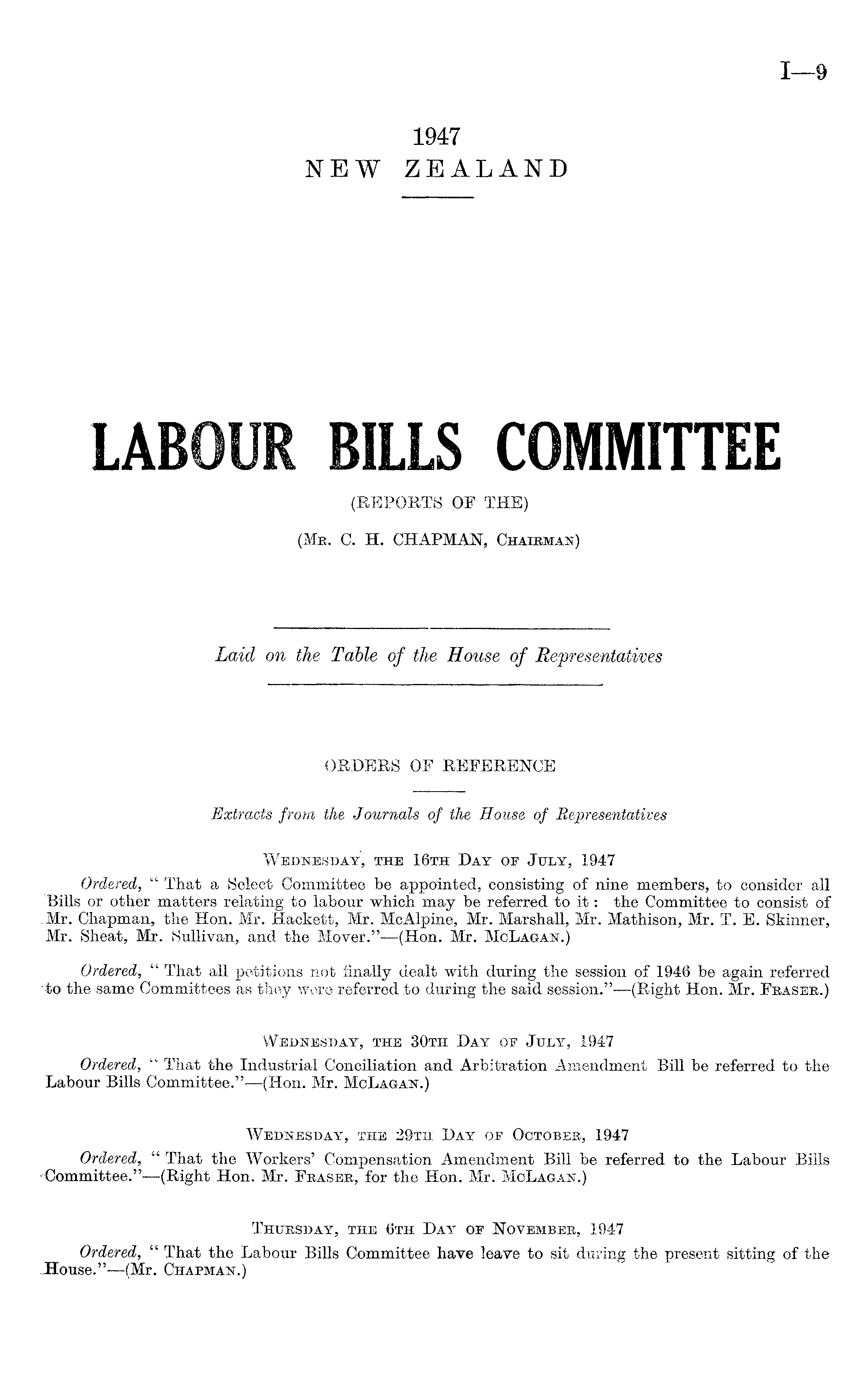 Extracts from the Journals of the House of Representatives Wednesday* the 16th Day of July, 1947 Ordered, " That a Select Committee be appointed, consisting of nine members, to consider all Bills or other matters relating to labour which may be referred to it: the Committee to consist of Mr. Chapman, the Hon. Mr. Hackett, Mr. McAlpine, Mr. Marshall, Mr. Mathison, Mr. T. E. Skinner, Mr. Sheat, Mr. Sullivan, and the Mover."—(Hon. Mr. McLagan.) Ordered, " That all petitions not finally dealt with during the session of 1946 be again referred to the same Committees as they were referred .to during the said session."—(Right Hon. Mr. Fraser.) Wednesday, the 30th Day of July, 1947 Ordered, " That the Industrial Conciliation and Arbitration Amendment Bill be referred to the Labour Bills Committee."—(Hon. Mr. McLagan.) Wednesday, the 29th Day of October, 1947 Ordered, " That the Workers' Compensation Amendment Bill be referred to the Labour Bills Committee." —(Right Hon. Mr. Eraser, for the Hon. Mr. McLagan.) Thursday, the 6th Day of November, 1947 Ordered, " That the Labour Bills Committee have leave to sit during the present sitting of the -House."—(Mr. Chapman.)