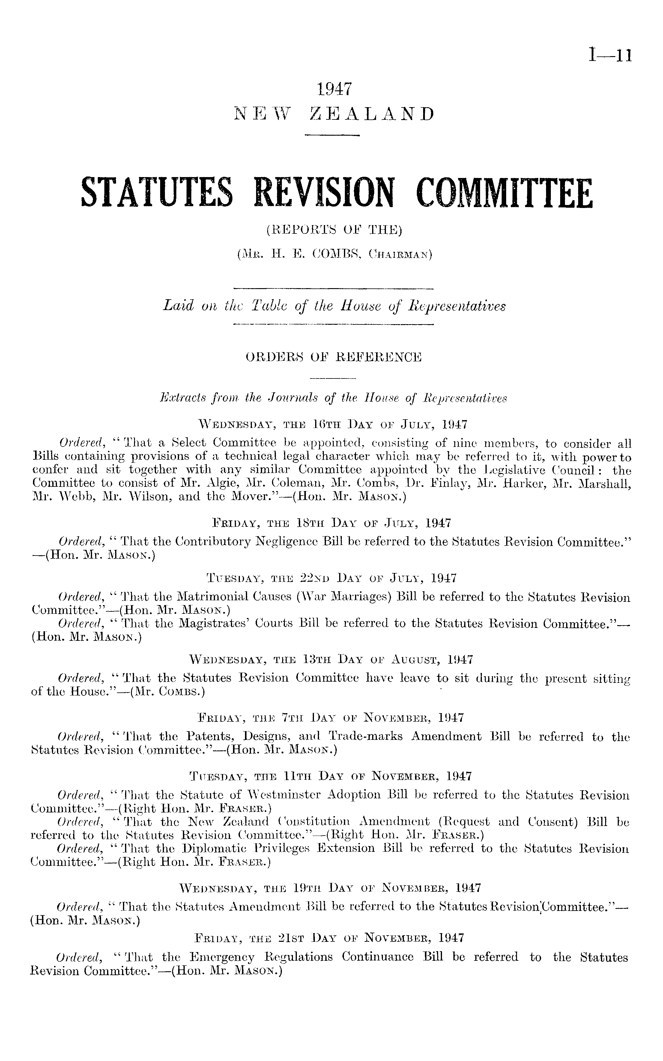 ORDERS OF REFERENCE Extracts from the Journals of the House of Representatives Wednesday, the 16th Day of July, 1947 Ordered, " That a Select Committee be appointed, consisting of nine members, to consider all Bills containing provisions of a technical legal character which may be referred to it, with power to confer and sit together with any similar Committee appointed by the Legislative Council: the Committee to consist of Mr. Algie, Mr. Coleman, Mr. Combs, Dr. Finlay, Mr. Harker, Mr. Marshall, Mr. Webb, Mr. Wilson, and the Mover."—(Hon. Mr. Mason.) Friday, the 18th Day of July, 1947 Ordered, " That the Contributory Negligence Bill be referred to the Statutes Revision Committee." —(Hon. Mr. Mason.) Tuesday, the 22nd Day of July, 1947 Ordered, " That the Matrimonial Causes (War Marriages) Bill be referred to the Statutes Revision Committee."—(Hon. Mr. Mason.) Ordered, " That the Magistrates' Courts Bill be referred to the Statutes Revision Committee."— (Hon. Mr. Mason.) Wednesday, the 13th Day of August, 1947 Ordered, " That the Statutes Revision Committee have leave to sit during the present sitting of the House."—(Mr. Combs.) Friday, the 7th Day of November, 1947 Ordered, " That the Patents, Designs, and Trade-marks Amendment Bill be referred to the Statutes Revision Committee."—(Hon. Mr. Mason.) Tuesday, the 11th Day of November, 1947 Ordered, " That the Statute of Westminster Adoption Bill be referred to the Statutes Revision Committee."—(Right Hon. Mr. Fraser.) Ordered, " That the New Zealand Constitution Amendment (Request and Consent) Bill be referred to the Statutes Revision Committee." —(Right Hon. Mr. Fraser.) Ordered, " That the Diplomatic Privileges Extension Bill bo referred to the Statutes Revision Committee."—(Right Hon. Mr. Fraser.) Wednesday, the 19th Day of November, 1947 Ordered, " That the Statutes Amendment Bill be referred to the Statutes Revision Committee."— (Hon. Mr. Mason.) Friday, the 21st Day of November, 1947 Ordered, " That the Emergency Regulations Continuance Bill be referred to the Statutes Revision Committee."—(Hon. Mr. Mason.)