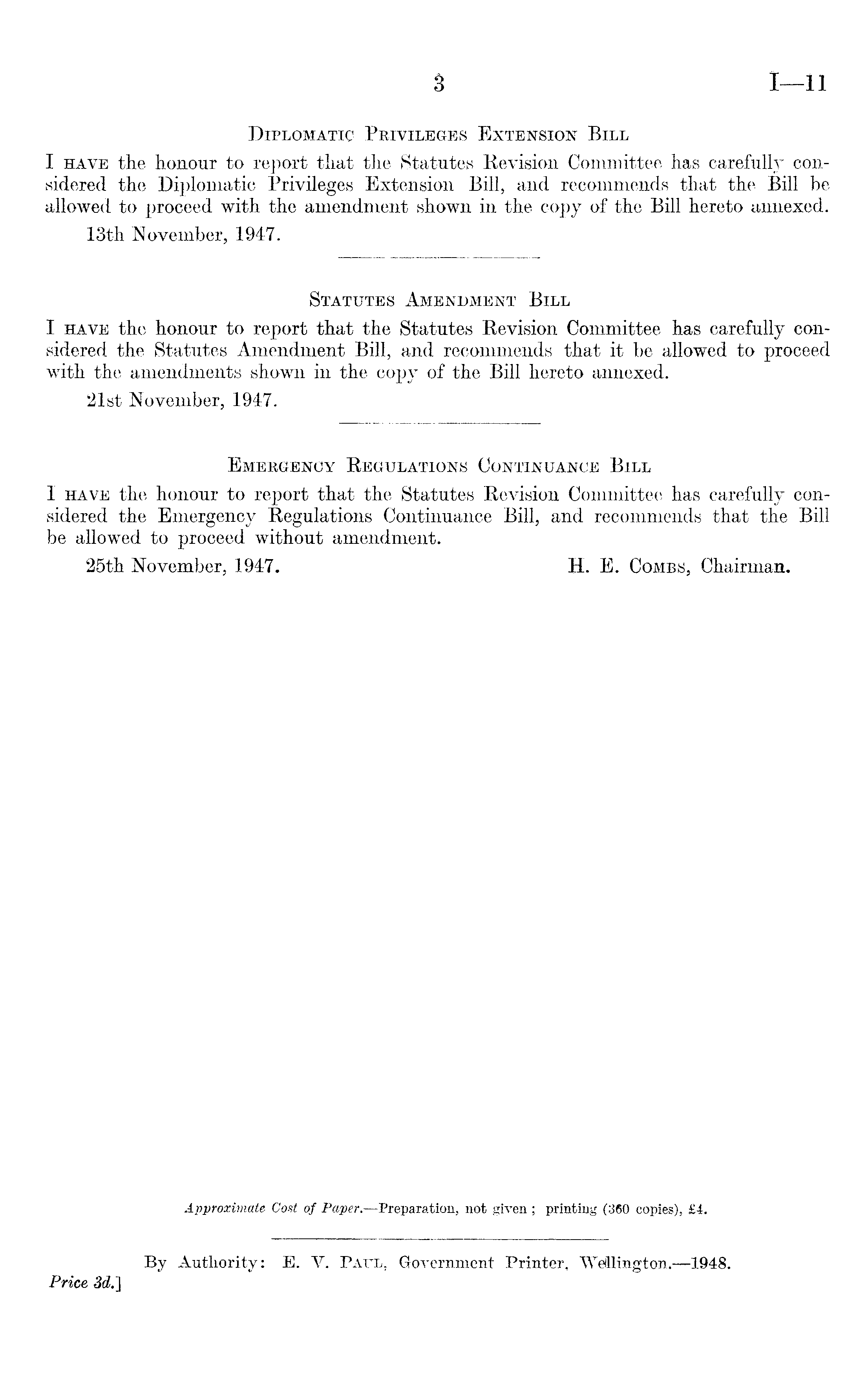 Diplomatic Privileges Extension Bill I have the honour to report that the Statutes Revision Committee has carefully considered the Diplomatic Privileges Extension Bill, and recommends that the Bill be allowed to proceed with the amendment shown in the copy of the Bill hereto annexed. 13th November, 1947. Statutes Amendment Bill I have the honour to report that the Statutes Revision Committee has carefully considered the Statutes Amendment Bill, and recommends that it be allowed to proceed with the amendments shown in the copy of the Bill hereto annexed. 21st November, 1947. Emergency Regulations Continuance Bill I have the honour to report that the Statutes Revision Committee has carefully considered the Emergency Regulations Continuance Bill, and recommends that the Bill be allowed to proceed without amendment. 25th November, 1947. H. E. Combs, Chairman.