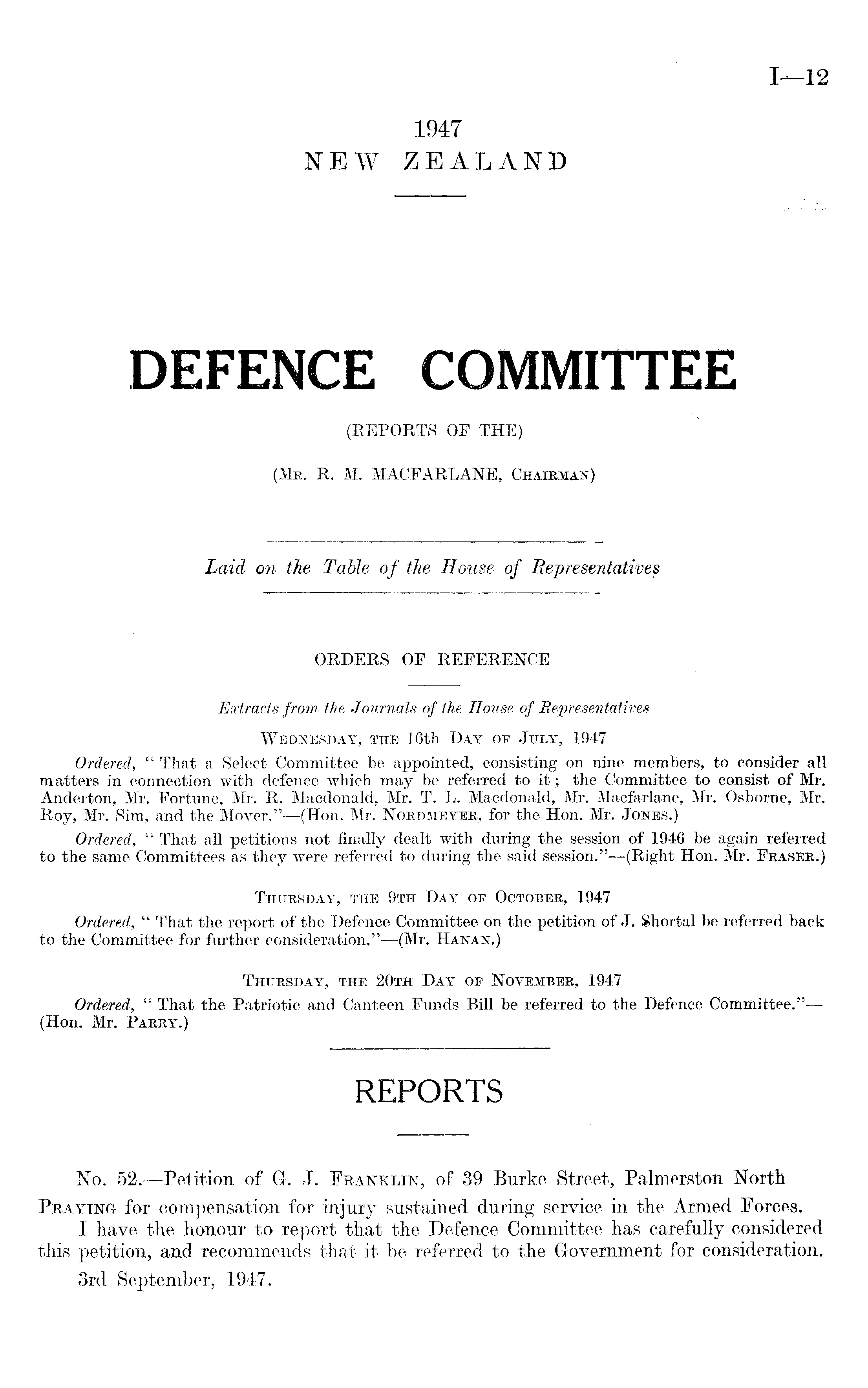 ORDERS OF REFERENCE Extracts from the Journals of the House of Representatives Wednesday, the 16th Day op July, 1947 Ordered, " That a Select Committee be appointed, consisting on nine members, to consider all matters in connection with defence which may be referred to it; the Committee to consist of Mr. Anderton, Mr. Fortune, Mr. R. Macdonald, Mr. T. L. Macdonald, Mr. Macfarlane, Mr. Osborne, Mr. Roy, Mr. Sim, and the Mover."—(Hon. Mr. Nordmeyer, for the Hon. Mr. Jones.) Ordered, " That all petitions not finally dealt with during the session of 1946 be again referred to the same Committees as they were referred to during the said session." —(Right Hon. Mr. Fraser.) Thursday, the 9th Day of October, 1947 Ordered, " That the report of the Defence Committee on the petition of J. Shortal be referred back to the Committee for further consideration."—(Mr. Hanan.) Thursday, the 20th Day of November, 1947 Ordered, " That the Patriotic and Canteen Funds Bill be referred to the Defence Comfliittee."— (Hon. Mr. Parry.) REPORTS No. 52.—Petition of G. J. Franklin, of 39 Burke Street, Palmerston North Praying for compensation for injury sustained during service in the Armed Forces, I have the honour to report that the Defence Committee has carefully considered this petition, and recommends that it be referred to the Government for consideration. 3rd September, 1947.