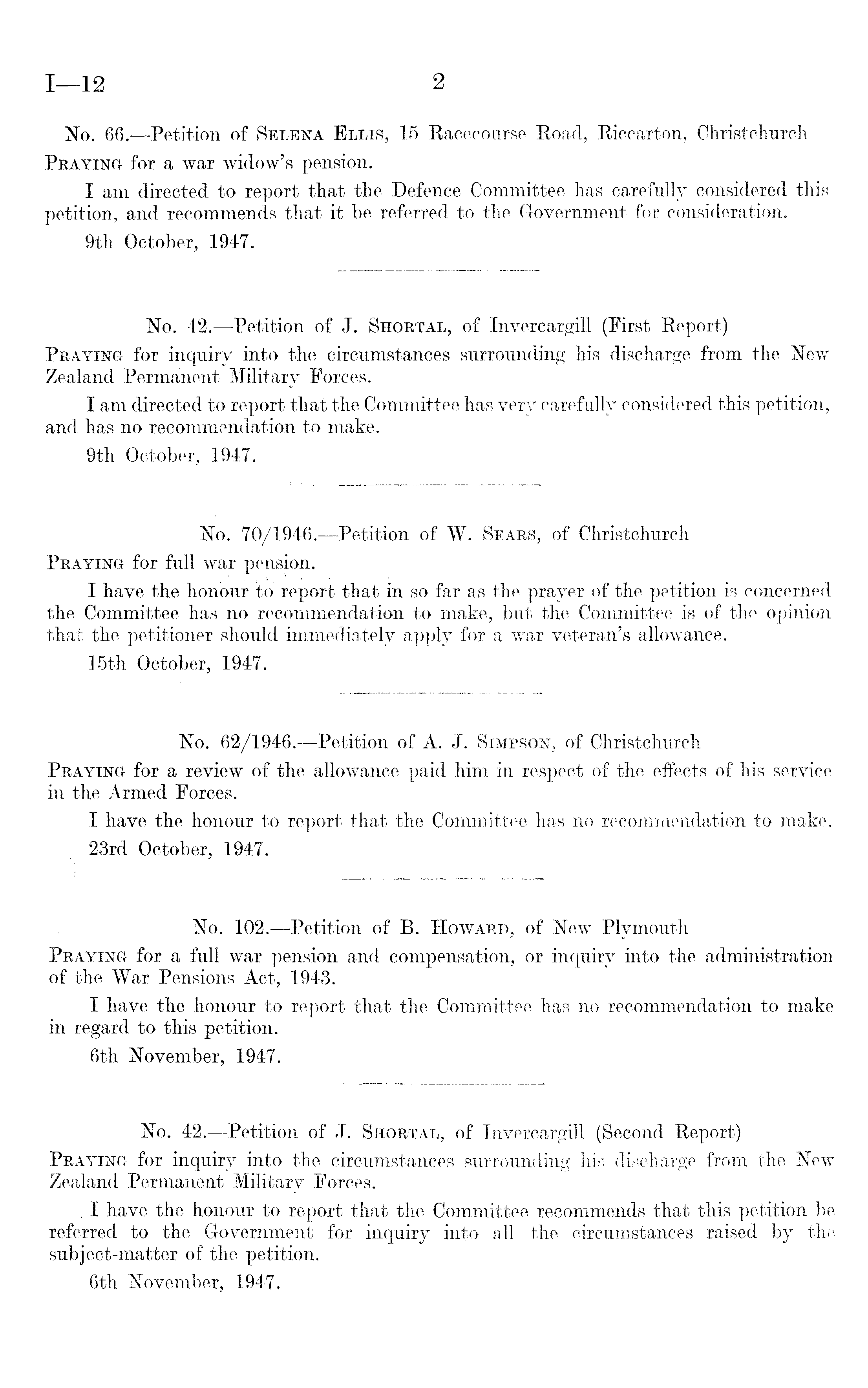 No. 66.—Petition of Selena Ellis, 15 Racecourse Road, Riccarton, Christchurch Praying for a war widow's pension. I am directed to report that the Defence Committee has carefully considered this petition, and recommends that it be referred to the Government for consideration. 9th October, 1947. No. 42. —Petition of J. Shortal, of Invercargill (First Report) Praying for inquiry into the circumstances surrounding his discharge from the New Zealand Permanent Military Forces. I am directed to report that the Committee has very carefully considered this petition, and has no recommendation to make. 9th October, 1947. No. 70/1946. —Petition of W. Sears, of Christchurch Praying for full war pension. I have the honour to report that in so far as the prayer of the petition is concerned the Committee has no recommendation to make, but the Committee is of the opinion that the petitioner should immediately apply for a war veteran's allowance. 15th October, 1947. No. 62/1946. —Petition of A. J. Simpson, of Christchurch Praying for a review of the allowance paid him in respect of the effects of his service in the Armed Forces. I have the honour to report that the Committee has no recommendation to make. 23rd October, 1947. No. 102. —Petition of B. Howard, of New Plymouth Praying for a full war pension and compensation, or inquiry into the administration of the War Pensions Act, 1943. I have the honour to report that the Committee has no recommendation to make in regard to this petition. 6th November, 1947. No. 42.—Petition of J. Shortal, of Invercargill (Second Report) Praying for inquiry into the circumstances surrounding his discharge from the New Zealand Permanent Military Forces. , I have the honour to report that the Committee recommends that this petition be referred to the Government for inquiry into all the circumstances raised by the subject-matter of the petition. 6th November, 1947.