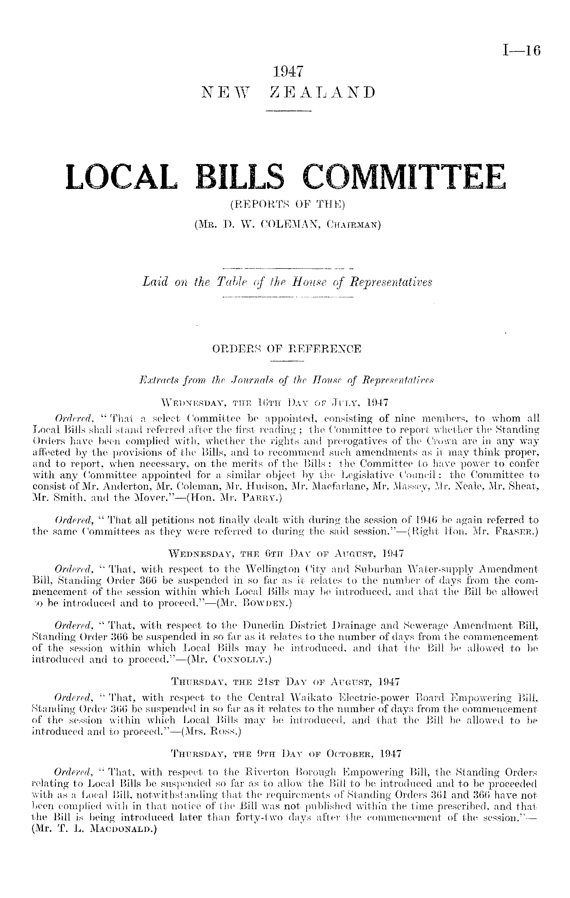 Extracts from the Journals of the House of Representatives Wednesday, the 16th Day of July, 1947 Ordered, " That a select Committee be appointed, consisting of nine members, to whom all Local Bills shall stand referred after the first reading ; the Committee to report whether the Standing Orders have been complied with, whether the rights and prerogatives of the Crown are in any way affected by the provisions of the Bills, and to recommend such amendments as it may think proper, and to report, when necessary, on the merits of the Bills: the Committee to have power to confer with any Committee appointed for a similar object by the Legislative Council: the Committee to consist of Mr. Anderton, Mr. Coleman, Mr. Hudson, Mr. Macfarlane, Mr. Massey, Mr. Neale, Mr. Sheat, Mr. Smith, and the Mover." —(Hon. Mr. Parry.) Ordered, " That all petitions not finally dealt with during the session of 1946 be again referred to the same Committees as they were referred to during the said session." —(Right Hon. Mr. Eraser.) Wednesday, the 6th Day or August, 1947 Ordered, " That, with respect to the Wellington City and Suburban Water-supply Amendment Bill, Standing Order 366 be suspended in so far as it relates to the number of days from the commencement of the session within which Local Bills may be introduced, and that the Bill be allowed ho be introduced and to proceed."-—(Mr. Bowden.) Ordered, " That, with respect to the Dunedin District Drainage and Sewerage Amendment Bill, Standing Order 366 be suspended in so far as it relates to the number of days from the commencement of the session within which Local Bills may be introduced, and that the Bill be allowed to be introduced and to proceed."—(Mr. Connolly.) Thursday, the 21st Day op August, 1947 Ordered, " That, with respect to the Central Waikato Electric-power Board Empowering Bill, Standing Order 366 be suspended in so far as it relates to the number of days from the commencement of the session within which Local Bills may be introduced, and that the Bill be allowed to be introduced and to proceed."—(Mrs. Ross.) Thursday, the 9th Day of October, 1947 Ordered, " That, with respect to the Riverton Borough Empowering Bill, the Standing Orders relating to Local Bills be suspended so far as to allow the Bill to be introduced and to be proceeded with as a Local Bill, notwithstanding that the requirements of Standing Orders 361 and 366 have not been complied with in that notice of the Bill was not published within the time prescribed, and that the Bill is being introduced later than forty-two days after the commencement of the session."— (Mr. T. L. Macdonald.)