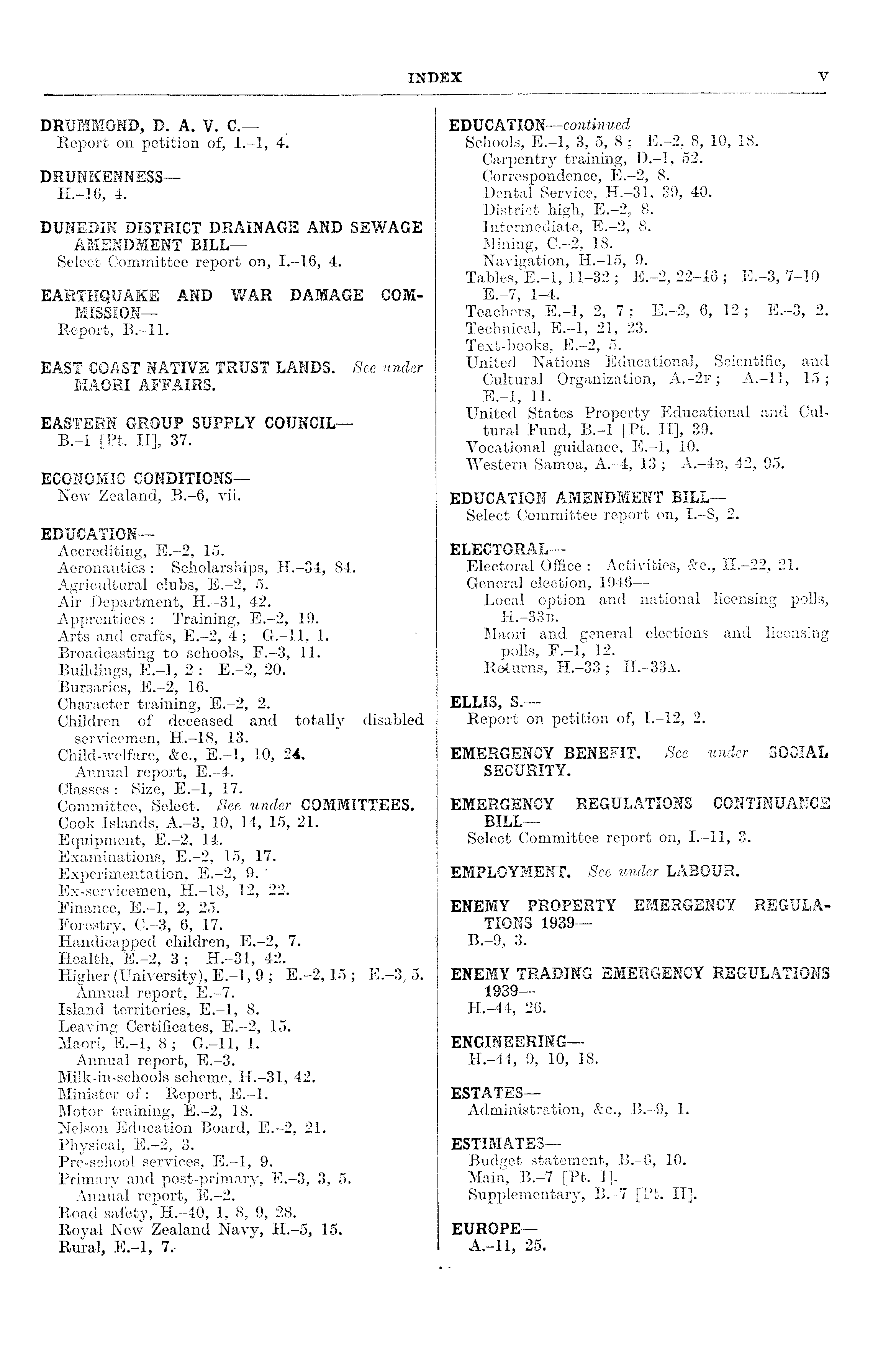 EDUCATION —continued Schools, E.-l, 3, 5, 8 ; E.-2, 8, 10, 18. Carpentry training, D.-l, 52. Correspondence, E.-2, 8. Dental Service, H.-31, 39, 40. District high, E.-2, 8. Intermediate, E.-2, 8. Mining, C.-2, 18. Navigation, H.-15, 9. Tables, E.-l, 11-32 ; E.-2, 22-46 ; E.-3, 7-10 E.-7, 1-4. Teachers, E.-l, 2, 7; E.-2, 6, 12; E.-3, 2. Technical, E.-l, 21, 23. Text-books, E.-2, 5. United Nations Educational, Scientific, and Cultural Organization, A.-2f; A.-11, 15; E.-l, 11. United States Property Educational and Cultural Fund, 8.-l [Pt. ll], 39. Vocational guidance, E.-l, 10. Western Samoa, A.-4, 13 ; A.-4b, 42, 95. EDUCATION AMENDMENT BILL— Select Committee report on, 1.-8, 2. ELECTORAL— Electoral Office : Activities, &c., H.-22, 21. General election, 1946 Local option and national licensing polls, H.-33b. Maori and general elections and licensing polls, F.-l, 12. Returns, H.-33 ; H.-33a. ELLIS, S.— Report on petition of, 1.-12, 2. EMERGENCY BENEFIT. See under SOCIAL SECURITY. EMERGENCY REGULATIONS CONTINUANCE BILL— Select Committee report on, 1.-11, 3. EMPLOYMENT. See under LABOUR. ENEMY PROPERTY EMERGENCY" REGULATIONS 1939 8.-9, 3. ENEMY TRADING EMERGENCY REGULATIONS 1939 11.-44, 28. ENGINEERING— H.-44, 9, 10, 18. ESTATES— Administration, &c., 8.-9, 1. ESTIMATES— Budget statement, 8.-6, 10. Main, 8.-7 [Pt. I]. Supplementary, 8.-7 [Pt. ll]. EUROPE— A.-11, 25,