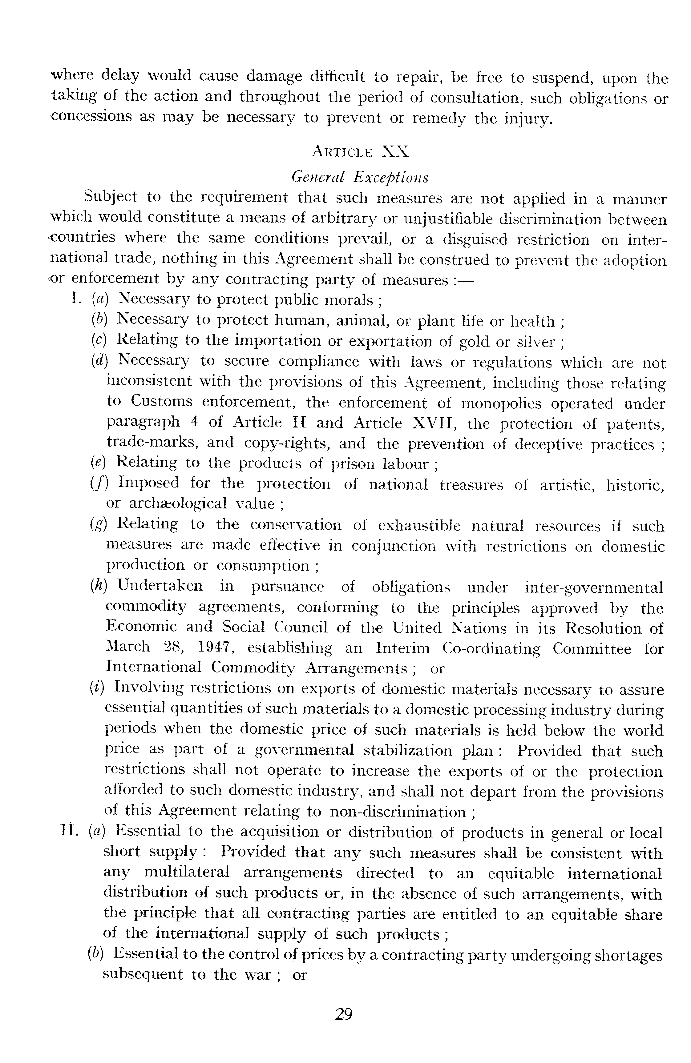 where delay would cause damage difficult to repair, be free to suspend, upon the taking of the action and throughout the period of consultation, such obligations or concessions as may be necessary to prevent or remedy the injury. Article XX General Exceptions Subject to the requirement that such measures are not applied in a manner which would constitute a means of arbitrary or unjustifiable discrimination between countries where the same conditions prevail, or a disguised restriction on international trade, nothing in this Agreement shall be construed to prevent the adoption or enforcement by any contracting party of measures : I. (a) Necessary to protect public morals ; (b) Necessary to protect human, animal, or plant life or health ; (c) Relating to the importation or exportation of gold or silver ; (d) Necessary to secure compliance with laws or regulations which are not inconsistent with the provisions of this Agreement, including those relating to Customs enforcement, the enforcement of monopolies operated under paragraph 4 of Article II and Article XVII, the protection of patents, trade-marks, and copy-rights, and the prevention of deceptive practices ; (e) Relating to the products of prison labour ; (/) Imposed for the protection of national treasures of artistic, historic, or archaeological value ; (g) Relating to the conservation of exhaustible natural resources if such measures are made effective in conjunction with restrictions on domestic production or consumption ; (h) Undertaken in pursuance of obligations under inter-governmental commodity agreements, conforming to the principles approved by the Economic and Social Council of the United Nations in its Resolution of March 28, 1947, establishing an Interim Co-ordinating Committee for International Commodity Arrangements ; or (i) Involving restrictions on exports of domestic materials necessary to assure essential quantities of such materials to a domestic processing industry during periods when the domestic price of such materials is held below the world price as part of a governmental stabilization plan : Provided that such restrictions shall not operate to increase the exports of or the protection afforded to such domestic industry, and shall not depart from the provisions of this Agreement relating to non-discrimination ; 11. (a) Essential to the acquisition or distribution of products in general or local short supply : Provided that any such measures shall be consistent with any multilateral arrangements directed to an equitable international distribution of such products or, in the absence of such arrangements, with the principle that all contracting parties are entitled to an equitable share of the international supply of such products ; (b) Essential to the control of prices by a contracting party undergoing shortages subsequent to the war ; or