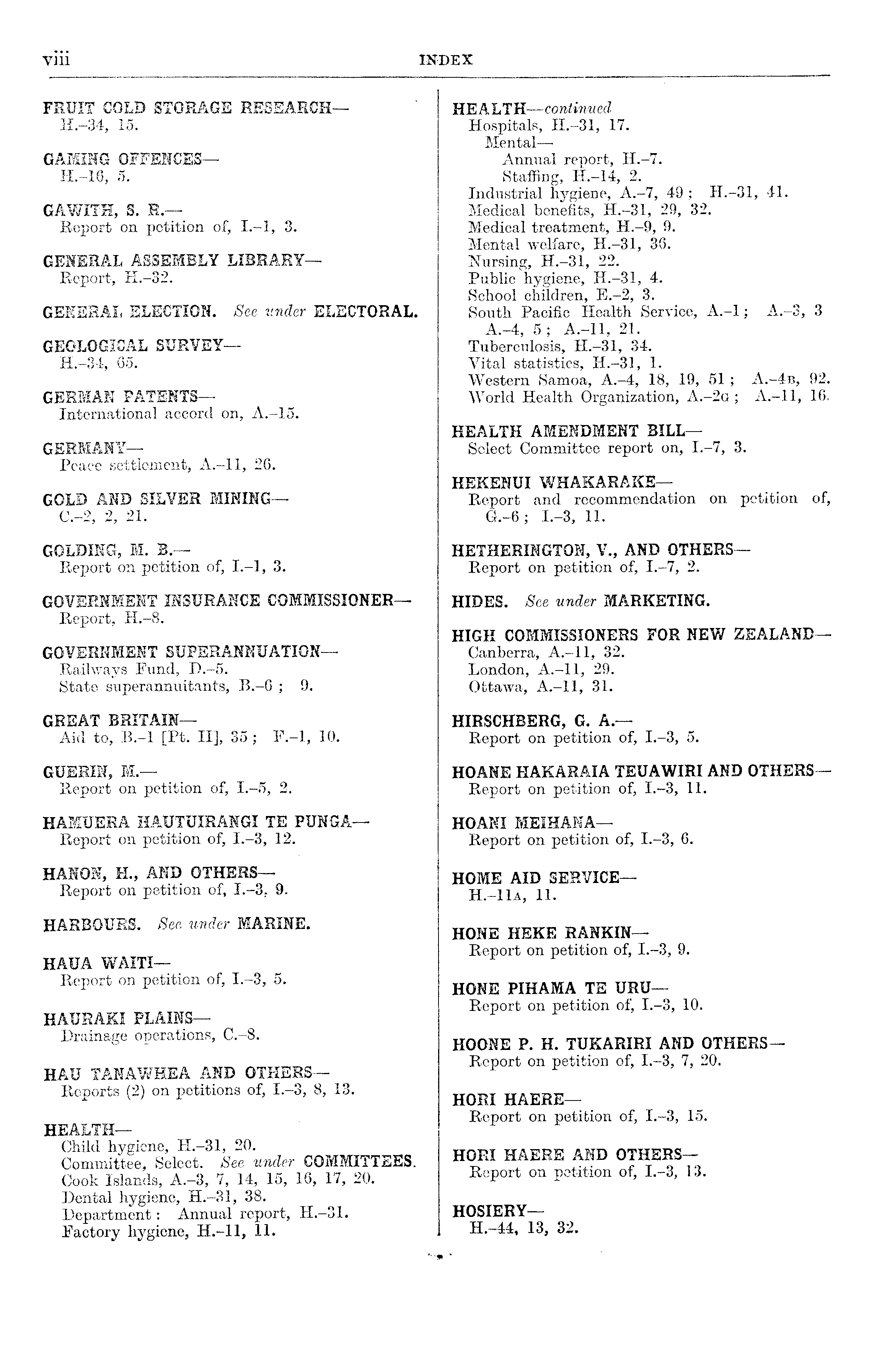 FRUIT COLD STORAGE RESEARCH— H.-34, 15. GAMING OFFENCES—-11.-16, 5. GAWITH, S. R.— Report on petition of, 1.-l, 3. GENERAL ASSEMBLY LIBRARY— Report, H.-32. GENERAL ELECTION. See under ELECTORAL. GEOLOGICAL SURVEY— H.-34, 65. GERMAN PATENTS— International accord on, A.-15. GERMANY— Peace settlement, A.-11, 26. GOLD AND SILVER MINING— C.-2, 2, 21. GOLDING, M. B.— Report on petition of, 1.-l, 3. GOVERNMENT INSURANCE COMMISSIONER— Report, H.-8. GOVERNMENT SUPERANNUATION— Railways Fund, D.-5. State superannuitants, 8.-6 ; 9. GREAT BRITAIN— Aid to, 8.-l [Pt. ll], 35 ; F.-l, 10. GUERIN, M.— Report on petition of, 1.-5, 2. HAMUERA HAUTUIRANGI TE PUNGA— Report on petition of, 1.-3, 12. HANQN, H., AND OTHERS— Report on petition of, 1.-3. 9. HARBOURS. See under MARINE. HAUA WAITI — Report on petition of, 1.-3, 5. HAURAKI PLAINS— Drainage operations, C.-8. HAU TANAWHEA AND OTHERS— Reports (2) on petitions of, 1.-3, 8, 13. HEALTH— Child hygiene, H.-31, 20. Committee, Select. See under COMMITTEES. Cook Islands, A.-3, 7, 14, 15, 1.6, 17, 20. Dental hygiene, H.-31, 38. Department: Annual report, H.-31. Factory hygiene, H.-11, 11.