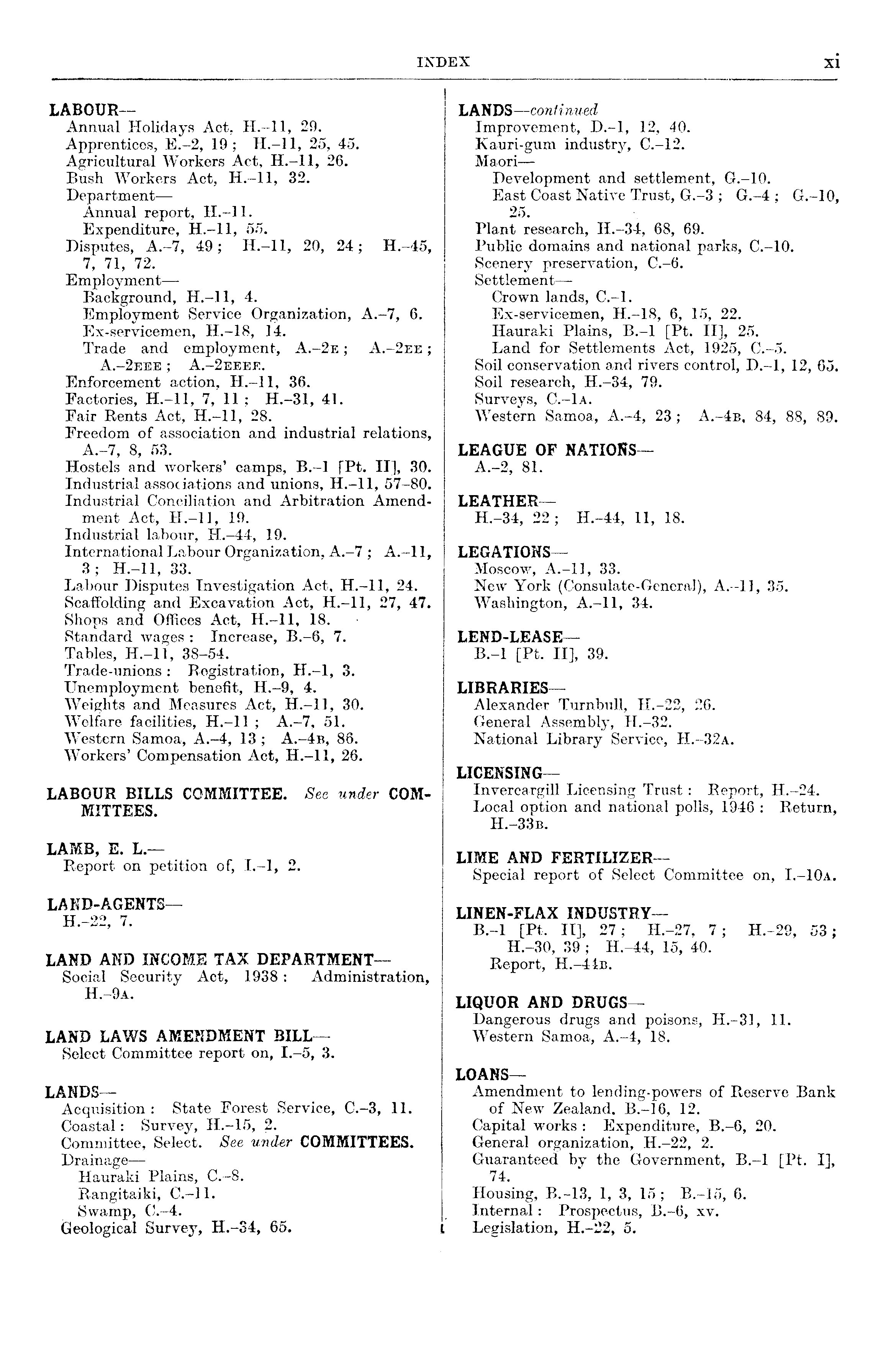 LABOUR— Annual Holidays Act, H.-11, 29. Apprentices, E.-2, 19; TI.-11, 25, 45. Agricultural Workers Act, H.-11, 26. Bush Workers Act, H.-11, 32. Department— Annual report, H.-11. Expenditure, H.-11, 55. Disputes, A.-7, 49; H.-11, 20, 24; H.-45, 7, 71, 72. Employment Background, H.-11, 4. Employment Service Organization, A.-7, 6. Ex-servicemen, H.-18, 14. Trade and employment, A.-2e ; A.-2ee ; A.-2eee ; A.-2eeee. Enforcement action. H.-11, 36. Factories, H.-11, 7, 11 ; H.-31, 41. Fair Rents Act, H.-11, 28. Freedom of association and industrial relations, A.-7, 8, 53. Hostels and workers' camps, 8.-l [Pt. ll], 30. Industrial associations and unions, H.-11, 57-80. Industrial Conciliation and Arbitration Amendment Act, H.-11, 19. Industrial labour, H.-44, 19. International Labour Organization, A.-7 ; A.-l 1, 3; H.-11, 33. Labour Disputes Investigation Act, H.-11, 24. Scaffolding and Excavation Act, H.-11, 27, 47. Shops and Offices Act, H.-11, 18. Standard wages : Increase, 8.-6, 7. Tables, H.-11, 38-54. Trade-unions : Registration, H.-l, 3. Unemployment benefit, H.-9, 4. Weights and Measures Act, H.-11, 30. Welfare facilities, H.-ll ; A.-7, 51. Western Samoa, A.-4, 13 ; A.-4b, 86. Workers' Compensation Act, H.-11, 26. LABOUR BILLS COMMITTEE. See under COMMITTEES. LAMB, E. L.— Report on petition of, 1.-l, 2. LAND-AGENTS— H.-22, 7. LAND AND INCOME TAX DEPARTMENT— Social Security Act, 1938 : Administration, H.-9a. LAND LAWS AMENDMENT BILL— Select Committee report on, 1.-5, 3. LANDS— Acquisition : State Forest Service, C.-3, 11. Coastal: Survey, H.-l 5, 2. Committee, Select. See under COMMITTEES. Drainage— Hauraki Plains, C.—B. Rangitaiki, C.-11. Swamp, C.-4. Geological Survey, H.-34, 65,