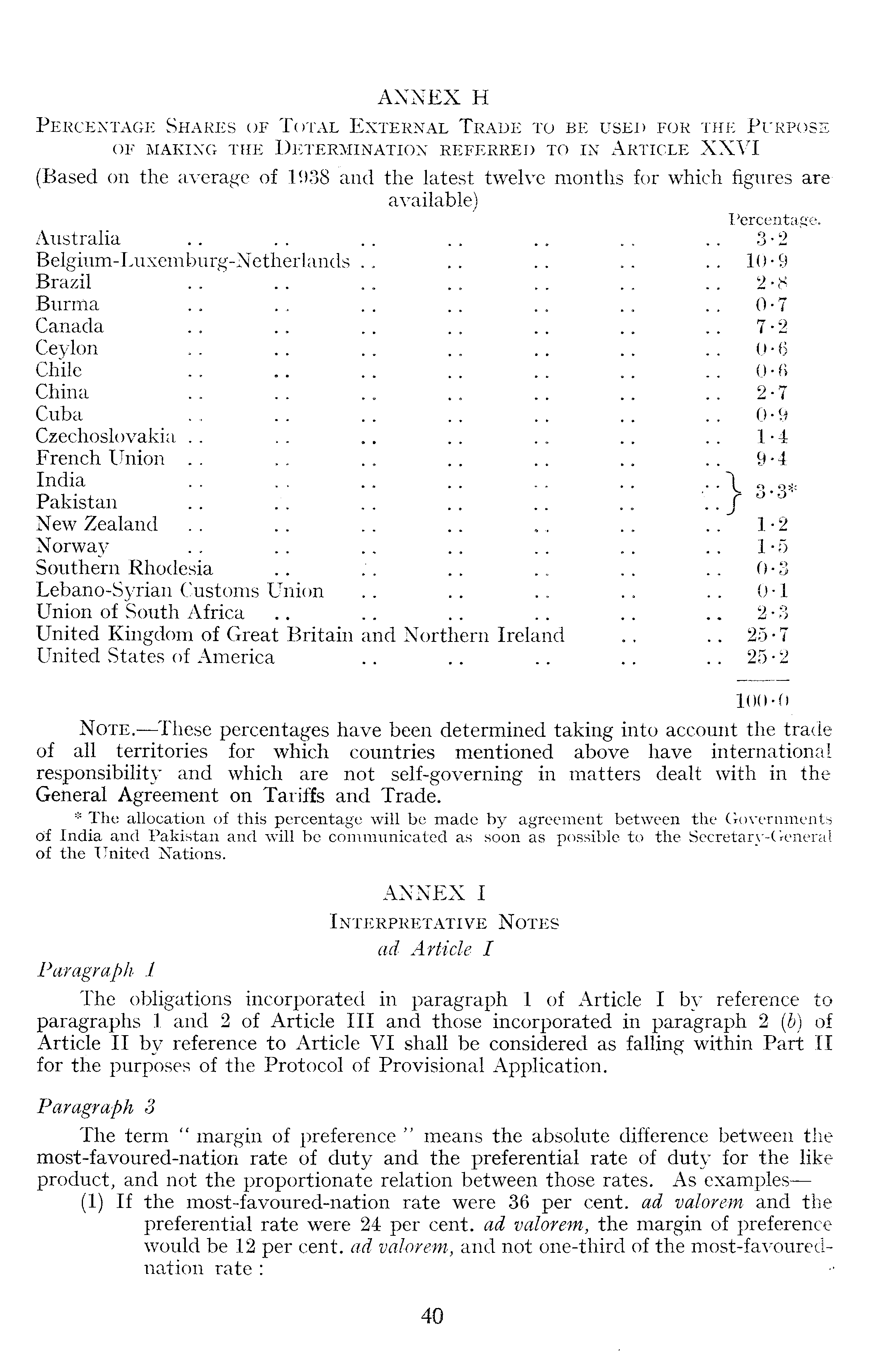 ANNEX H Percentage Shares of Total External Trade to be used for the Purpose OF MAKING THE DETERMINATION REFERRED TO IN ARTICLE XXVI (Based on the average of 1938 and the latest twelve months for which figures are available) Percentage. Australia .. .. .. .. .. .. .. 3*2 Belgium-Luxemburg-Netherlands .. .. .. .. ..10-9 Brazil .. .. .. .. .. .. .. 2-8 Burma .. . „ .. .. .. .. .. 0-7 Canada .. .. .. .. .. .. .. 7-2 Ceylon .. .. .. .. .. .. .. o*6 Chile .. .. .. .. .. .. ..0-6 China .. . . .. .. .. .. .. 2-7 Cuba .. .. .. .. .. .. .. 0-9 Czechoslovakia . . , . .. . . .. .. .. 1-4 French Union .. .. .. .. .. .. ..9*4 India . . . . .. .. . . .. ..\ „ Pakistan .. . . .. .. .. .. . f ° a New Zealand . . .. .. .. .. .. .. I*2 Norway .. .. .. .. .. .. 1 -5 Southern Rhodesia . . .. .. .. .. .. 0-3 Lebano-Syrian Customs Union .. .. .. .. .. 0-1 Union of South Africa .. .. .. .. .. .. 2-3 United Kingdom of Great Britain and Northern Ireland .. .. 25-7 United States of America .. .. .. .. .. 25 • 2 100-0^ Note.—These percentages have been determined taking into account the trade of all territories for which countries mentioned above have international responsibility and which are not self-governing in matters dealt with in the General Agreement on Tariffs and Trade. * The allocation of this percentage will be made by agreement between the Governments of India and Pakistan and will be communicated as soon as possible to the Secretary-General of the United Nations. ANNEX I Interpretative Notes ad Article I Paragraph 1 The obligations incorporated in paragraph 1 of Article I by reference to paragraphs 1 and 2of Article 111 and those incorporated in paragraph 2 (b) of Article II by reference to Article VI shall be considered as falling within Part II for the purposes of the Protocol of Provisional Application. Paragraph 3 The term " margin of preference " means the absolute difference between the most-favoured-nation rate of duty and the preferential rate of duty for the like product, and not the proportionate relation between those rates. As examples—(l) If the most-favoured-nation rate were 36 per cent, ad valorem and the preferential rate were 24 per cent, ad valorem, the margin of preference would be 12 per cent, ad valorem, and not one-third of the most-favoured-nation rate :