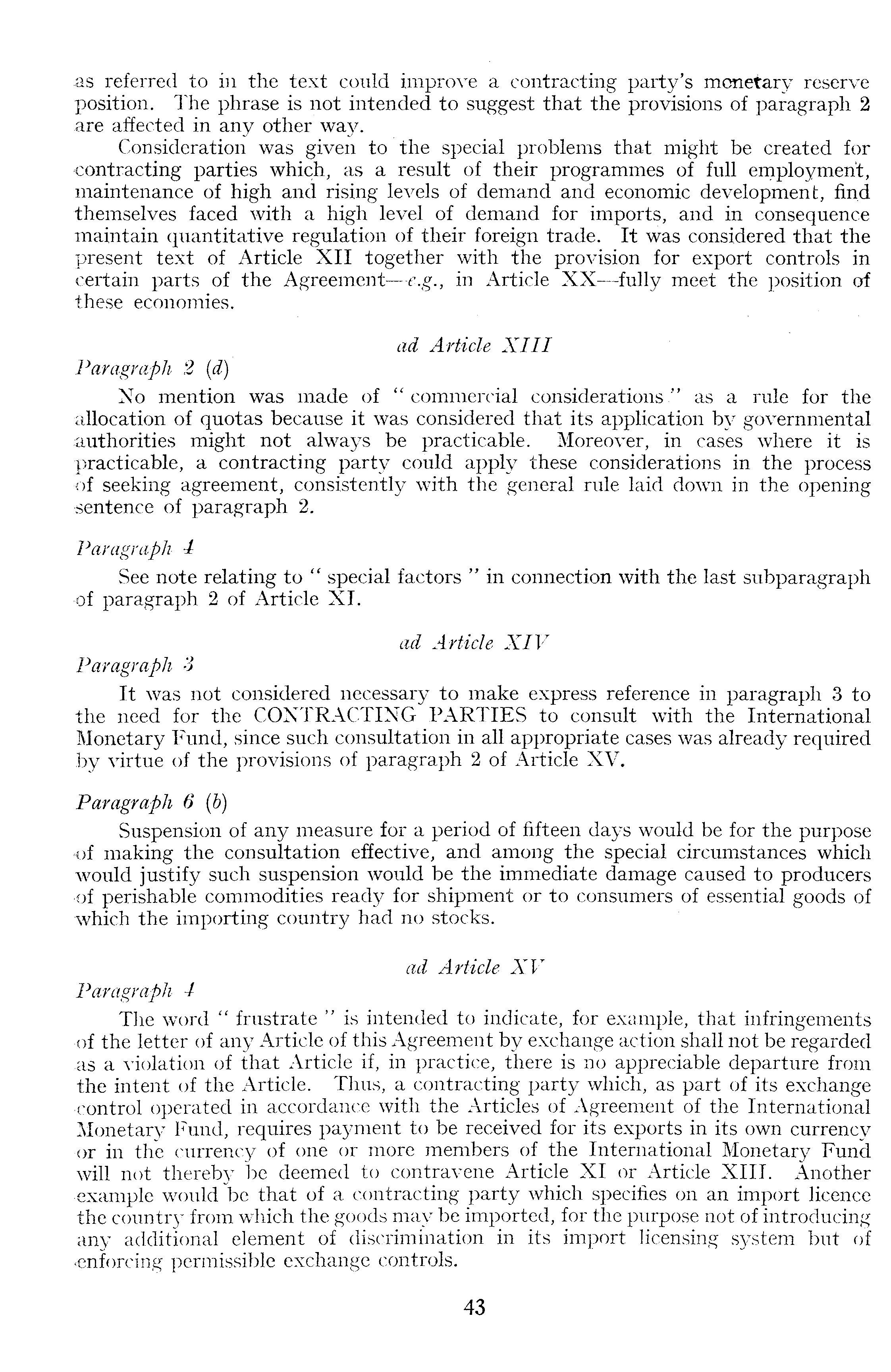 as referred to in the text could improve a contracting party's monetary reserve position. The phrase is not intended to suggest that the provisions of paragraph 2 are affected in any other way. Consideration was given to the special problems that might be created for contracting parties which, as a result of their programmes of full employment, maintenance of high and rising levels of demand and economic development, find themselves faced with a high level of demand for imports, and in consequence maintain quantitative regulation of their foreign trade. It was considered that the present text of Article XII together with the provision for export controls in certain parts of the Agreement—-e.g., in Article XX —fully meet the position of these economies. ad Article XIII Paragraph 2 {d) No mention was made of " commercial considerations " as a rule for the allocation of quotas because it was considered that its application by governmental authorities might not always be practicable. Moreover, in cases where it is practicable, a contracting party could apply these considerations in the process •of seeking agreement, consistently with the general rule laid down in the opening sentence of paragraph 2. Paragraph 4 See note relating to " special factors " in connection with the last subparagraph •of paragraph 2 of Article XI. ad Article XIV Paragraph 3 It was not considered necessary to make express reference in paragraph 3 to the need for the CONTRACTING PARTIES to consult with the International Monetary Fund, since such consultation in all appropriate cases was already required by virtue of the provisions of paragraph 2 of Article XV. Paragraph 6 (b) Suspension of any measure for a period of fifteen days would be for the purpose of making the consultation effective, and among the special circumstances which would justify such suspension would be the immediate damage caused to producers •of perishable commodities ready for shipment or to consumers of essential goods of which the importing country had no stocks. ad Article XV Paragraph 4 The word " frustrate " is intended to indicate, for example, that infringements ■of the letter of any Article of this Agreement by exchange action shall not be regarded as a violation of that Article if, in practice, there is no appreciable departure from the intent of the Article. Thus, a contracting party which, as part of its exchange ■control operated in accordance with the Articles of Agreement of the International Monetary Fund, requires payment to be received for its exports in its own currency •or in the currency of one or more members of the International Monetary Fund will not thereby be deemed to contravene Article XI or Article XIII. Another ■example would be that of a contracting party which specifies on an import licence the country from which the goods may be imported, for the purpose not of introducing any additional element of discrimination in its import licensing system but of -enforcing permissible exchange controls.