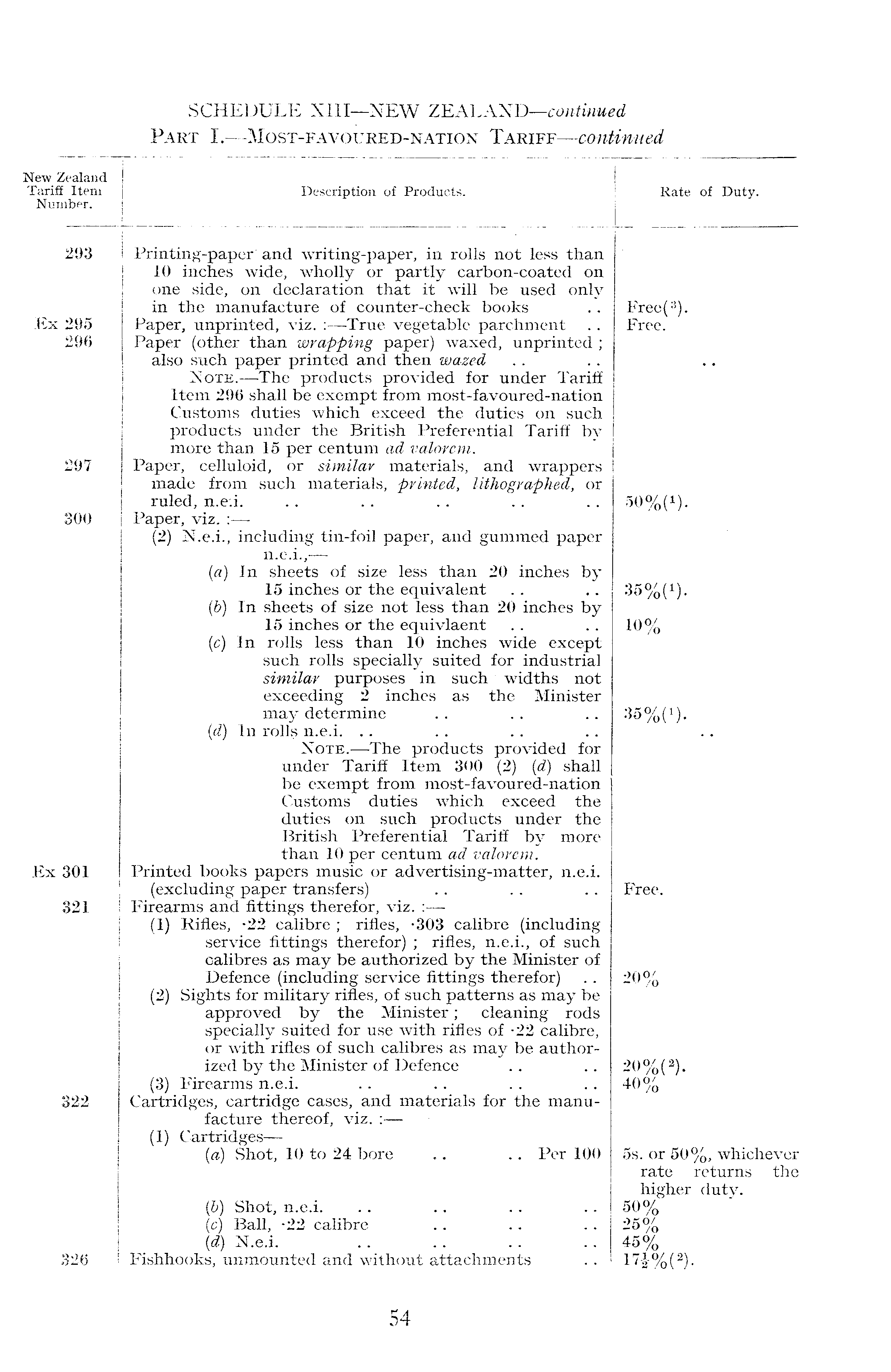 New Zealand Tariff Item Number. Description of Products. Rate of Duty. 293 Ex 295 296 297 300 Printing-paper and writing-paper, in rolls not less than 10 inches wide, wholly or partly carbon-coated on one side, on declaration that it will be used only in the manufacture of counter-check books Paper, unprinted, viz. :—True vegetable parchment Paper (other than wrapping paper) waxed, unprinted ; also such paper printed and then wazed Note.—The products provided for under Tariff Item 296 shall be exempt from most-favoured-nation Customs duties which exceed the duties on such products under the British Preferential Tariff by more than 15 per centum ad valorem. Paper, celluloid, or similar materials, and wrappers made from such materials, printed, lithographed, or ruled, n.e-.i. . . . . . . . . Paper, viz. :— (2) N.e.i., including tin-foil paper, and gummed paper n.e.i.,— (a) In sheets of size less than 20 inches by 15 inches or the equivalent (b) In sheets of size not less than 20 inches by 15 inches or the equivlaent (c) In rolls less than 10 inches wide except such rolls specially suited for industrial similar purposes in such widths not exceeding 2 inches as the Minister may determine (d) In rolls n.e.i. Note.—The products provided for under Tariff Item 300 (2) (d) shall be exempt from most-favoured-nation Customs duties which exceed the duties on such products under the British Preferential Tariff by more than 10 per centum ad valorem. Printed books papers music or advertising-matter, n.e.i. (excluding paper transfers) Firearms and fittings therefor, viz. :■ — (1) Rifles, -22 calibre ; rifles, -303 calibre (including service fittings therefor) ; rifles, n.e.i., of such calibres as may be authorized by the Minister of Defence (including service fittings therefor) (2) Sights for military rifles, of such patterns as may be approved by the Minister; cleaning rods specially suited for use with rifles of -22 calibre, or with rifles of such calibres as may be authorized by the Minister of Defence (3) Firearms n.e.i. Cartridges, cartridge cases, and materials for the manufacture thereof, viz. :— (1) Cartridges— (а) Shot, 10 to 24 bore .. .. Per 100 (б) Shot, n.e.i. (c) Ball, -22 calibre (d) N.e.i. Fishhooks, unmounted and without attachments Free( 3 ). Free. 50%(i). Ex 301 321 322 326 35%(i). 10% 35%(i). Free. 20% 20 %■(*). 40% 5s. or 50%, whichever rate returns the higher duty. 50% 25% 45% m%n-