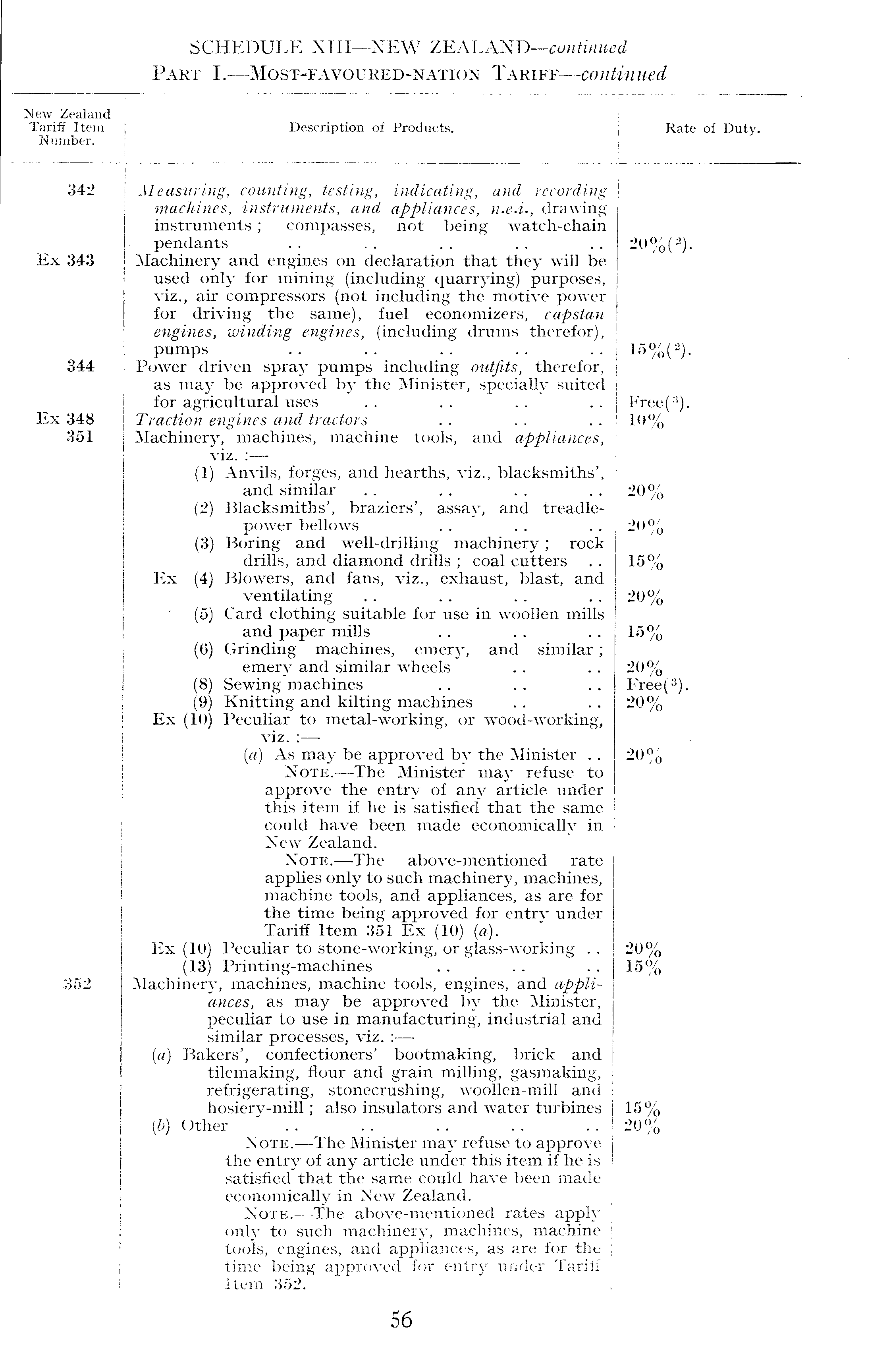 New Zealand Tariff Item Number. Description of Products. Rate of Duty. 342 Ex 343 344 Ex 348 351 Measuring, counting, testing, indicating, and recording machines, instruments, and appliances, n.e.i., drawing instruments; compasses, not being watch-chain pendants Machinery and engines on declaration that they will be used only for mining (including quarrying) purposes, viz., air compressors (not including the motive power for driving the same), fuel economizers, capstan engines, winding engines, (including drums therefor), pumps Power driven spray pumps including outfits, therefor, as may be approved by the Minister, specially suited for agricultural uses Traction engines and tractors . . . . Machinery, machines, machine tools, and appliances, 20% ( 2 ). 15%( 2 ) - Free ( 3 ). 10% (1) Anvils, forges, and hearths, viz., blacksmiths', and similar (2) Blacksmiths', braziers', assay, and treadlepower bellows (3) Boring and well-drilling machinery; rock drills, and diamond drills ; coal cutters Ex (4) Blowers, and fans, viz., exhaust, blast, and ventilating (5) Card clothing suitable for use in woollen mills and paper mills (6) Grinding machines, emery, and similar; emery and similar wheels (8) Sewing machines (9) Knitting and kilting machines Ex (10) Peculiar to metal-working, or wood-working, viz. : — (a) As may be approved by the Minister .. Note. —-The Minister may refuse to approve the entry of any article under this item if he is satisfied that the same could have been made economically in New Zealand. Note. —The above-mentioned rate applies only to such machinery, machines, machine tools, and appliances, as are for the time being approved for entry under Tariff Item 351 Ex (10) (a). Ex (10) Peculiar to stone-working, or glass-working . . (13) Printing-machines Machinery, machines, machine tools, engines, and appliances, as may be approved by the Minister, peculiar to use in manufacturing, industrial and similar processes, viz. :— (а) Bakers', confectioners' bootmaking, brick and tilemaking, flour and grain milling, gasmaking, refrigerating, stonecrushing, woollen-mill and hosiery-mill; also insulators and water turbines (б) Other iNote.- —The Minister may refuse to approve the entry of any article under this item if he is satisfied that the same could have been made economically in New Zealand. Note.—The above-mentioned rates apply only to such machinery, machines, machine tools, engines, and appliances, as are for the time being approved for entry under Tariff ! Item 352. 1 20% 20% 15% 20% 15% 20% Free( 3 ). 20% 352 J 1 20% 20% 15% 15% 20%