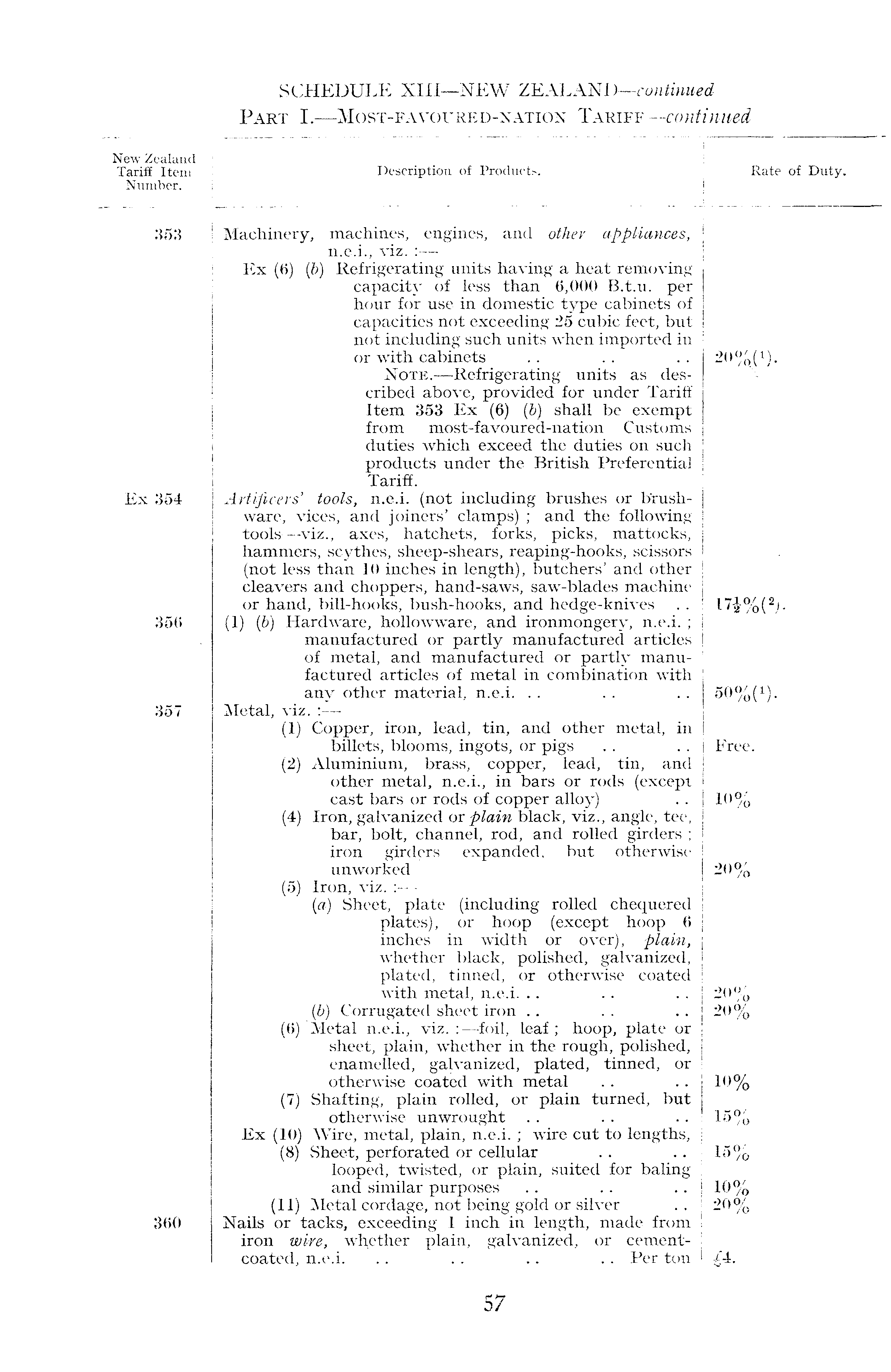 New Zealand I Tariff Item Description of Products. Rate of Duty. Number. 353 Machinery, machines, engines, and other appliances, n.e.i., viz. :— Ex (6) (b) Refrigerating units having a heat removing capacity of less than 6,000 B.t.u. per hour for use in domestic type cabinets of capacities not exceeding 25 cubic feet, but not including such units when imported in or with cabinets 20%( 1 ). 'Note. —Refrigerating units as described above, provided for under Tariff Item 353 Ex (6) (b) shall be exempt from most-favoured-nation Customs duties , which exceed the duties on such products under the British Preferential Tariff. Ex 354 Artificers' tools, n.e.i. (not including brushes or brushware, vices, and joiners' clamps) ; and the following tools—viz., axes, hatchets, forks, picks, mattocks, hammers, scythes, sheep-shears, reaping-hooks, scissors (not less than 10 inches in length), butchers' and other cleavers and choppers, hand-saws, saw-blades machine or hand, bill-hooks, bush-hooks, and hedge-knives 17i%( 2 ). 356 (1) (b) Hardware, hollowware, and ironmongery, n.e.i. ; manufactured or partly manufactured articles of metal, and manufactured or partly manufactured articles of metal in combination with any other material, n.e.i. 50%( 1 ). 357 Metal, viz. :— (1) Copper, iron, lead, tin, and other metal, in billets, blooms, ingots, or pigs Free. (2) Aluminium, brass, copper, lead, tin, and other metal, n.e.i., in bars or rods (except cast bars or rods of copper alloy) 10% (4) Iron, galvanized or plain black, viz., angle, tee, bar, bolt, channel, rod, and rolled girders ; iron girders expanded, but otherwise unworked 20% (5) Iron, viz. :— (a) Sheet, plate (including rolled chequered plates), or hoop (except hoop 6 inches in width or over), plain, whether black, polished, galvanized, plated, tinned, or otherwise coated with metal, n.e.i. .. .. 20% (b) Corrugated sheet iron 20% (6) Metal n.e.i., viz. :—foil, leaf ; hoop, plate or sheet, plain, whether in the rough, polished, enamelled, galvanized, plated, tinned, or otherwise coated with metal 10% (7) Shafting, plain rolled, or plain turned, but otherwise unwrought 15% Ex (10) Wire, metal, plain, n.e.i. ; wire cut to lengths, (8) Sheet, perforated or cellular 15% looped, twisted, or plain, suited for baling and similar purposes 10% (11) Metal cordage, not being gold or silver 20% 360 Nails or tacks, exceeding 1 inch in length, made from iron wire, whether plain, galvanized, or cementcoated, n.e.i. .. .. .. .. Per ton £4.
