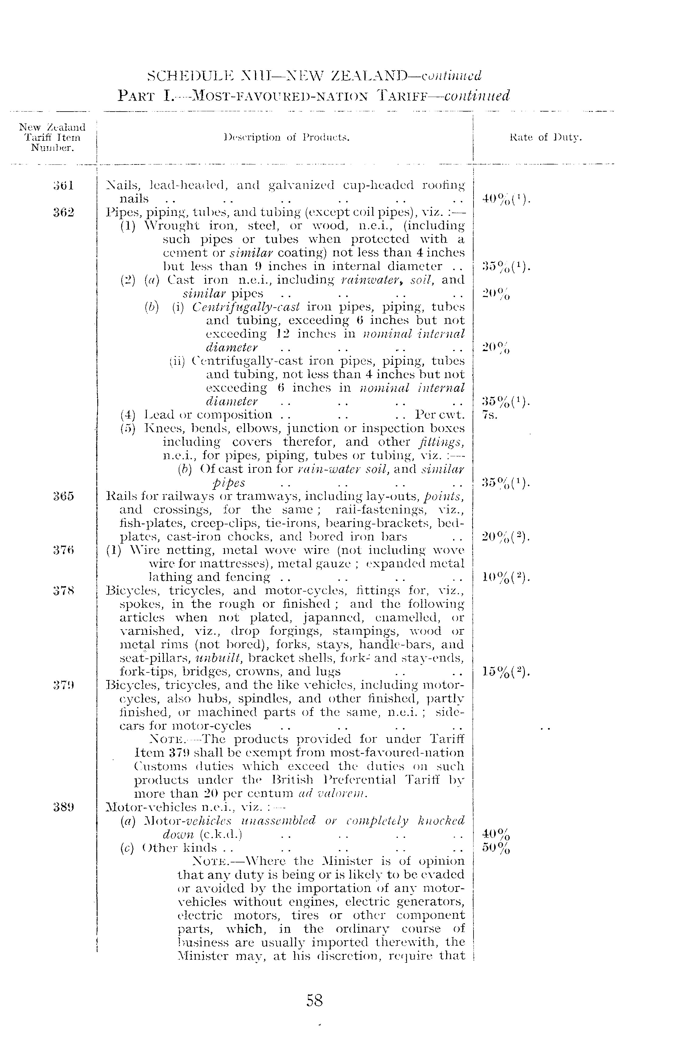 New Zealand Tariff Item Description of Products. Rate of Duty. Number. 361 Nails, lead-headed, and galvanized cup-headed roofing 1 nails 40%( 1 ). 362 Pipes, piping, tubes, and tubing (except coil pipes), viz. :— (1) Wrought iron, steel, or wood, n.e.i., (including such pipes or tubes when protected with a cement or similar coating) not less than 4 inches but less than 9 inches in internal diameter . . 35%( 1 )- (2) (a) Cast iron n.e.i., including rainwater» soil, and similar pipes 20% (b) (i) Centrifugally-cast iron pipes, piping, tubes i and tubing, exceeding 6 inches but not exceeding 12 inches in nominal internal diameter 20% (ii) Centrifugally-cast iron pipes, piping, tubes and tubing, not less than 4 inches but not exceeding 6 inches in nominal internal diameter 35%(i). (4) Lead or composition . . . . . . Per cwt. 7s. (5) Knees, bends, elbows, junction or inspection boxes including covers therefor, and other fittings, n.e.i., for pipes, piping, tubes or tubing, viz. :— (b) Of cast iron for rain-water soil, and similar pipes 35%( 1 ). 365 Rails for railways or tramways, including lay-outs, points, and crossings, for the same ; rail-fastenings, viz., fish-plates, creep-clips, tie-irons, bearing-brackets, bedplates, cast-iron chocks, and bored iron bars 20,%P). 376 (1) Wire netting, metal wove wire (not including wove wire for mattresses), metal gauze ; expanded metal lathing and fencing 10%( 2 ). 378 Bicycles, tricycles, and motor-cycles, fittings for, viz., spokes, in the rough or finished ; and the following articles when not plated, japanned, enamelled, or varnished, viz., drop forgings, stampings, wood or metal rims (not bored), forks, stays, handle-bars, and seat-pillars, unbuilt, bracket shells, fork- and stay-ends, fork-tips, bridges, crowns, and lugs 15%( 2 ). 379 Bicycles, tricycles, and the like vehicles, including motorcycles, also hubs, spindles, and other finished, partly finished, or machined parts of the same, n.e.i. ; sidecars for motor-cycles Note.—The products provided for under Tariff Item 379 shall be exempt from most-favoured-nation Customs duties which exceed the duties on such products under the British Preferential Tariff by more than 20 per centum ad valorem. 389 Motor-vehicles n.e.i., viz. :— (a) Motor-vehicles unassembled or completely knocked down (c.k.d.) . . . . . . ... 40% (c) Other kinds 50% Note.—Where the Minister is of opinion that any duty is being or is likely to be evaded or avoided by the importation of any motorvehicles without engines, electric generators, electric motors, tires or other component parts, which, in the ordinary course of business are usually imported therewith, the Minister may, at his discretion, require that