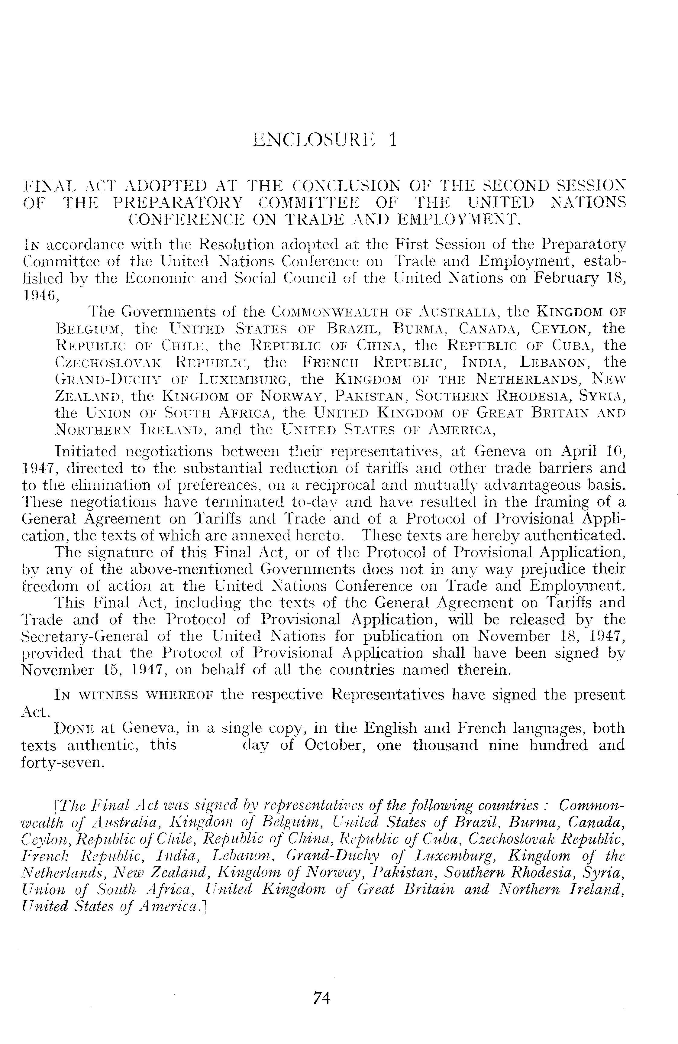 ENCLOSURE 1 FINAL ACT ADOPTED AT THE CONCLUSION OF THE SECOND SESSION OF THE PREPARATORY COMMITTEE OF THE UNITED NATIONS CONFERENCE ON TRADE AND EMPLOYMENT. In accordance with the Resolution adopted at the First Session of the Preparatory Committee of the United Nations Conference on Trade and Employment, established by the Economic and Social Council of the United Nations on February 18, 1946, The Governments of the Commonwealth of Australia, the Kingdom of Belgium, the United States of Brazil, Burma, Canada, Ceylon, the Republic of Chile, the Republic of China, the Republic of Cuba, the Czechoslovak Republic, the French Republic, India, Lebanon, the Grand-Duchy of Luxemburg, the Kingdom of the Netherlands, New Zealand, the Kingdom of Norway, Pakistan, Southern Rhodesia- Syria, the Union of South Africa, the United Kingdom of Great Britain and Northern Ireland, and the United States of America, Initiated negotiations between their representatives, at Geneva on April 10, 1947, directed to the substantial reduction of tariffs and other trade barriers and to the elimination of preferences, on a reciprocal and mutually advantageous basis. These negotiations have terminated to-day and have resulted in the framing of a General Agreement on Tariffs and Trade and of a Protocol of Provisional Application, the texts of which are annexed hereto. These texts are hereby authenticated. The signature of this Final Act, or of the Protocol of Provisional Application, by any of the above-mentioned Governments does not in any way prejudice their freedom of action at the United Nations Conference on Trade and Employment. This Final Act, including the texts of the General Agreement on Tariffs and Trade and of the Protocol of Provisional Application, will be released by the Secretary-General of the United Nations for publication on November 18, 1947, provided that the Protocol of Provisional Application shall have been signed by November 15, 1947, on behalf of all the countries named therein. In witness whereof the respective Representatives have signed the present Act. Done at Geneva, in a single copy, in the English and French languages, both texts authentic, this day of October, one thousand nine hundred and forty-seven. [The Final Act was signed by representatives of the following countries : Commonwealth of Australia, Kingdom of Belguim, United States of Brazil, Burma, Canada, Ceylon, Republic of Chile, Republic of China, Republic of Cuba, Czechoslovak Republic, French Republic, India, Lebanon, Grand-Duchy of Luxemburg, Kingdom of the Netherlands, New Zealand, Kingdom of Norway, Pakistan, Southern Rhodesia, Syria, Union of South Africa, United Kingdom of Great Britain and Northern Ireland, United States of America.]