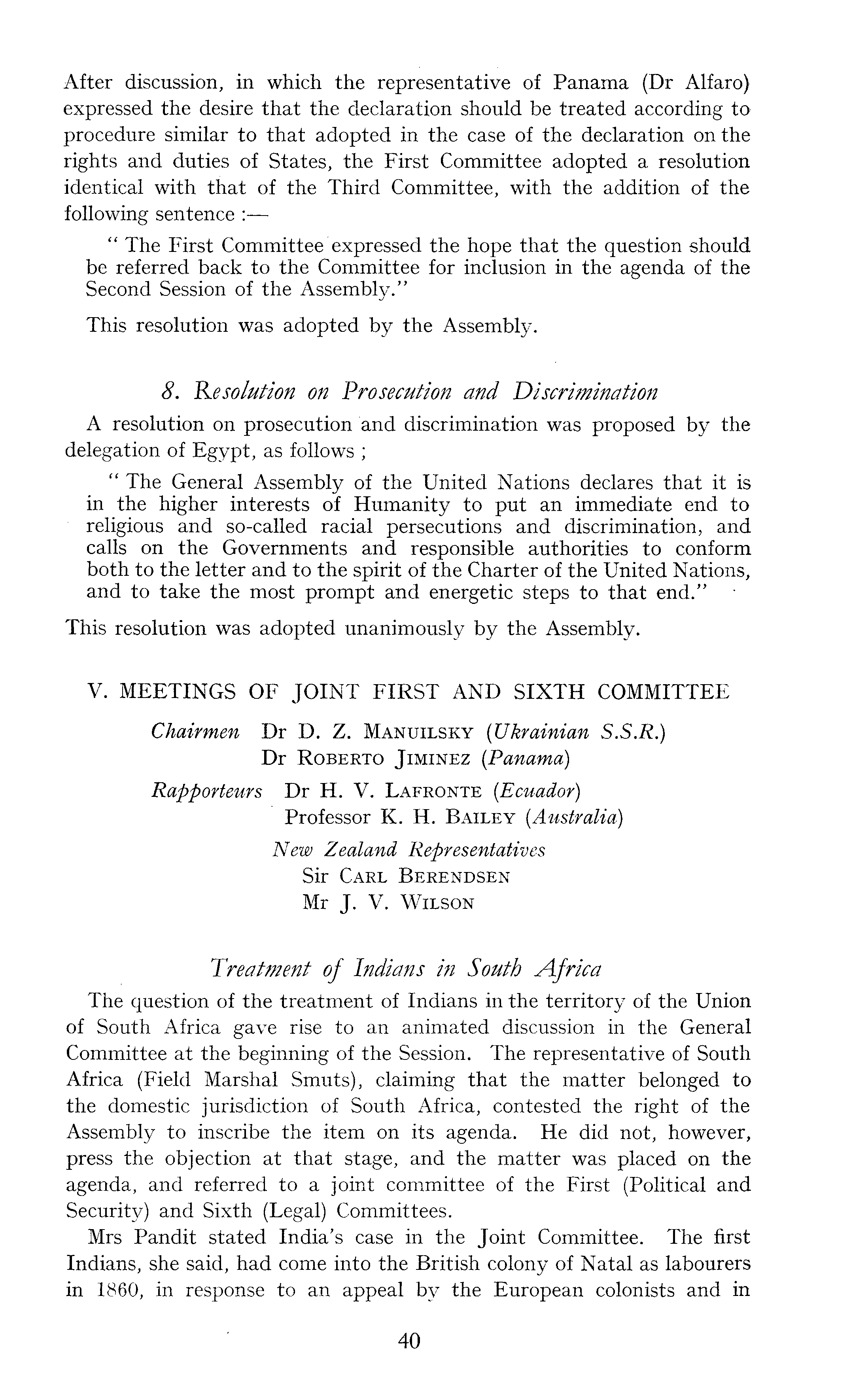 After discussion, in which the representative of Panama (Dr Alfaro) expressed the desire that the declaration should be treated according to procedure similar to that adopted in the case of the declaration on the rights and duties of States, the First Committee adopted a resolution identical with that of the Third Committee, with the addition of the following sentence : " The First Committee expressed the hope that the question should be referred back to the Committee for inclusion in the agenda of the Second Session of the Assembly." This resolution was adopted by the Assembly. 8. Resolution on Prosecution and Discrimination A resolution on prosecution and discrimination was proposed by the delegation of Egypt, as follows ; " The General Assembly of the United Nations declares that it is in the higher interests of Humanity to put an immediate end to religious and so-called racial persecutions and discrimination, and calls on the Governments and responsible authorities to conform both to the letter and to the spirit of the Charter of the United Nations, and to take the most prompt and energetic steps to that end." This resolution was adopted unanimously by the Assembly. V. MEETINGS OF JOINT FIRST AND SIXTH COMMITTEE Chairmen Dr D. Z. Manuilsky (Ukrainian S.S.R.) Dr Roberto Jiminez (Panama) Rapporteurs Dr H. V. Lafronte (Ecuador) Professor K. H. Bailey (Australia) New Zealand Representatives Sir Carl Berendsen Mr J. V. Wilson Treatment of Indians in South Africa The question of the treatment of Indians in the territory of the Union of South Africa gave rise to an animated discussion in the General Committee at the beginning of the Session. The representative of South Africa (Field Marshal Smuts), claiming that the matter belonged to the domestic jurisdiction of South Africa, contested the right of the Assembly to inscribe the item on its agenda. He did not, however, press the objection at that stage, and the matter was placed on the agenda, and referred to a joint committee of the First (Political and Security) and Sixth (Legal) Committees. Mrs Pandit stated India's case in the Joint Committee. The first Indians, she said, had come into the British colony of Natal as labourers in 1860, in response to an appeal by the European colonists and in