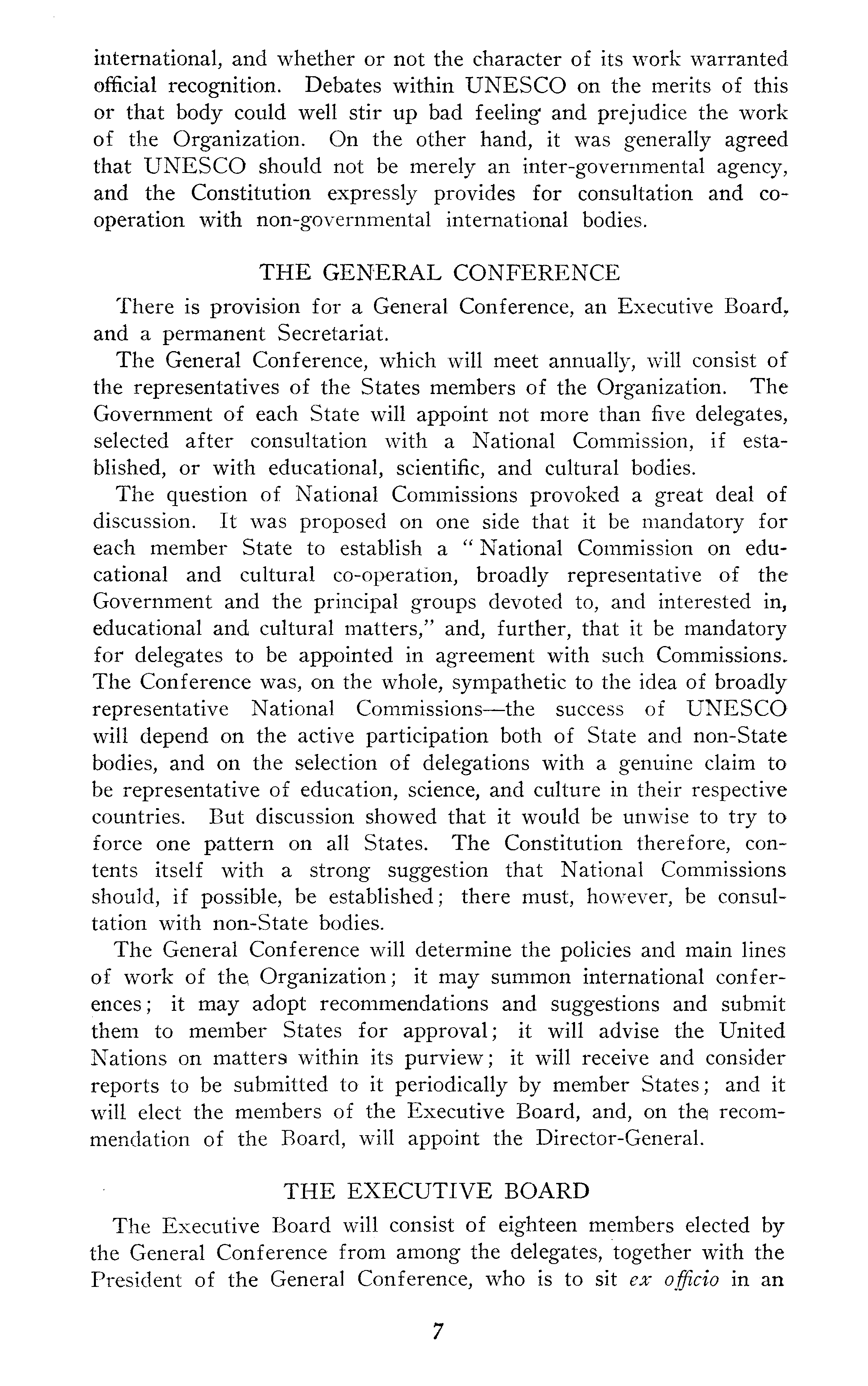 international, and whether or not the character of its work warranted official recognition. Debates within UNESCO on the merits of this or that body could well stir up bad feeling* and prejudice the work of the Organization. On the other hand, it was generally agreed that UNESCO should not be merely an inter-governmental agency, and the Constitution expressly provides for consultation and cooperation with non-governmental international bodies. THE GENERAL CONFERENCE There is provision for a General Conference, an Executive Board,, and a permanent Secretariat. The General Conference, which will meet annually, will consist of the representatives of the States members of the Organization. The Government of each State will appoint not more than five delegates, selected after consultation with a National Commission, if established, or with educational, scientific, and cultural bodies. The question of National Commissions provoked a great deal of discussion. It was proposed on one side that it be mandatory for each member State to establish a " National Commission on educational and cultural co-operation, broadly representative of the Government and the principal groups devoted to, and interested in, educational and cultural matters," and, further, that it be mandatory for delegates to be appointed in agreement with such Commissions, The Conference was, on the whole, sympathetic to the idea of broadly representative National Commissions —the success of UNESCO will depend on the active participation both of State and non-State bodies, and on the selection of delegations with a genuine claim to be representative of education, science, and culture in their respective countries. But discussion showed that it would be unwise to try to force one pattern on all States. The Constitution therefore, contents itself with a strong suggestion that National Commissions should, if possible, be established; there must, however, be consultation with non-State bodies. The General Conference will determine the policies and main lines of work of the Organization; it may summon international conferences; it may adopt recommendations and suggestions and submit them to member States for approval; it will advise the United Nations on matters within its purview; it will receive and consider reports to be submitted to it periodically by member States; and it will elect the members of the Executive Board, and, on the recommendation of the Board, will appoint the Director-General. THE EXECUTIVE BOARD The Executive Board will consist of eighteen members elected by the General Conference from among the delegates, together with the President of the General Conference, who is to sit ex officio in an
