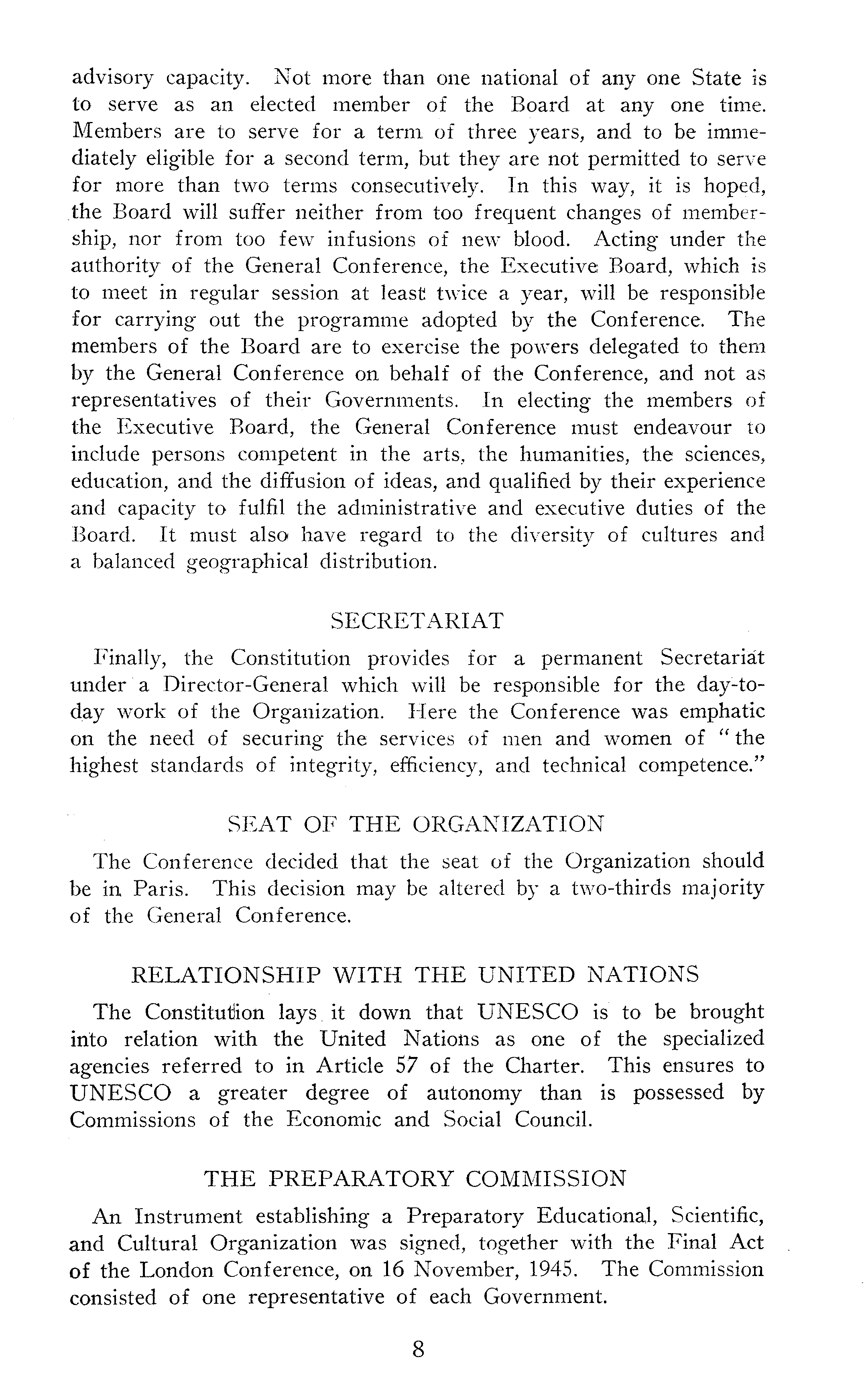 advisory capacity. Not more than one national of any one State is to serve as an elected member of the Board at any one time. Members are to serve for a term of three years, and to be immediately eligible for a second term, but they are not permitted to serve for more than two terms consecutively. In this way, it is hoped, the Board will suffer neither from too frequent changes of membership, nor from too few infusions of new blood. Acting under the authority of the General Conference, the Executive Board, which is to meet in regular session at least twice a year, will be responsible for carrying out the programme adopted by the Conference. The members of the Board are to exercise the powers delegated to them by the General Conference on behalf of the Conference, and not as representatives of their Governments. In electing the members of the Executive Board, the General Conference must endeavour to include persons competent in the arts, the humanities, the sciences, education, and the diffusion of ideas, and qualified by their experience and capacity to fulfil the administrative and executive duties of the Board. It must also have regard to the diversity of cultures and a balanced geographical distribution. SECRETARIAT Finally, the Constitution provides for a permanent Secretariat under a Director-General which will be responsible for the day-to-day work of the Organization. Here the Conference was emphatic on the need of securing the services of men and women of " the highest standards of integrity, efficiency, and technical competence." SEAT OF THE ORGANIZATION The Conference decided that the seat of the Organization should be in Paris. This decision may be altered by a two-thirds majority of the General Conference. RELATIONSHIP WITH THE UNITED NATIONS The Constitution lays.it down that UNESCO is to be brought into relation with the United Nations as one of the specialized agencies referred to in Article 57 of the Charter. This ensures to UNESCO a greater degree of autonomy than is possessed by Commissions of the Economic and Social Council. THE PREPARATORY COMMISSION An Instrument establishing a Preparatory Educational, Scientific, and Cultural Organization was signed, together with the Final Act of the London Conference, on 16 November, 1945. The Commission consisted of one representative of each Government.