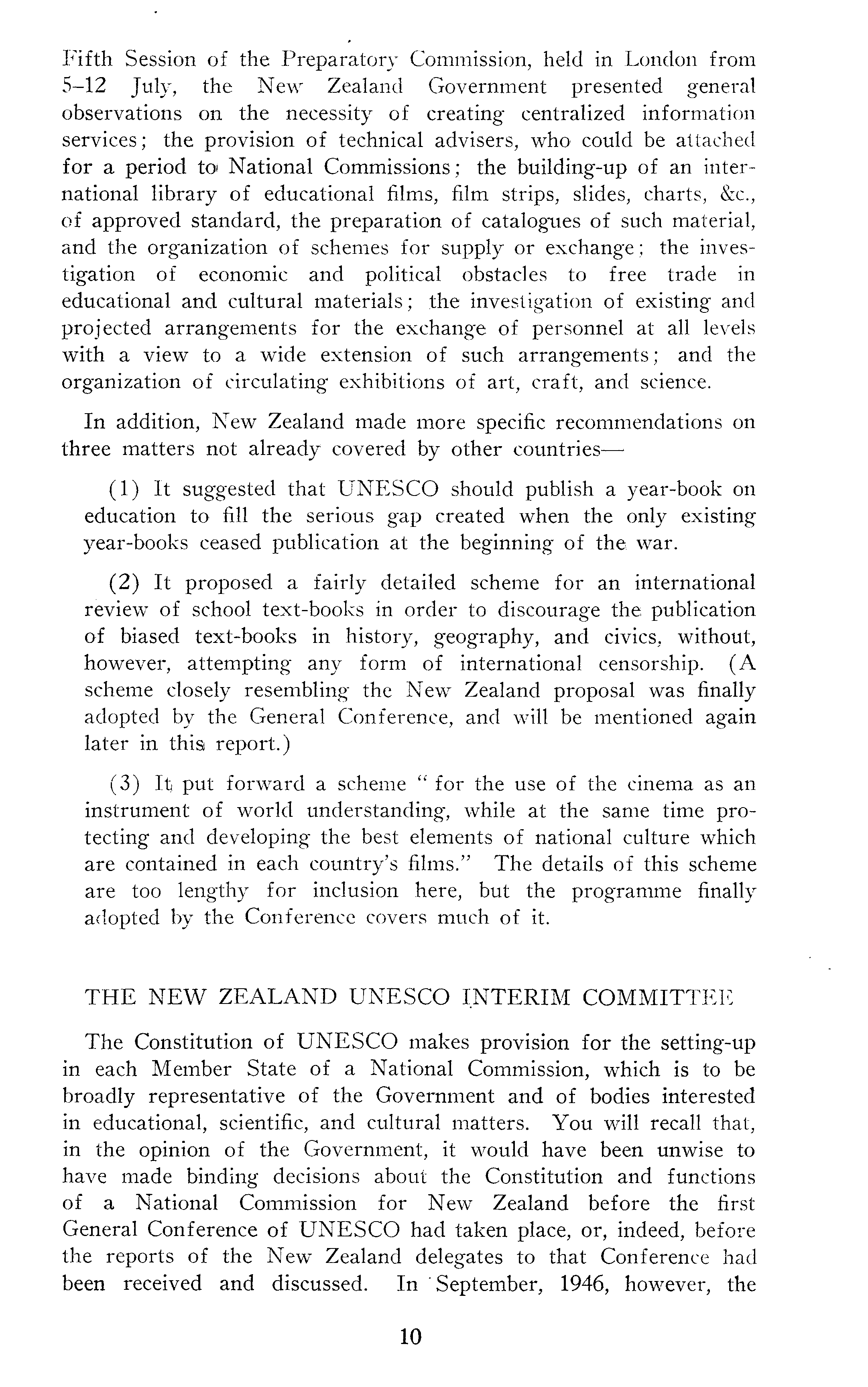Fifth Session of the Preparatory Commission, held in London from 5-12 July, the New Zealand Government presented general observations on the necessity of creating centralized information services; the provision of technical advisers, who could be attached for a period tot National Commissions; the building-up of an international library of educational films, film strips, slides, charts, &c., of approved standard, the preparation of catalogues of such material, and the organization of schemes for supply or exchange; the investigation of economic and political obstacles to free trade in educational and cultural materials; the investigation of existing and projected arrangements for the exchange of personnel at all levels with a view to a wide extension of such arrangements; and the organization of circulating exhibitions of art, craft, and science. In addition, New Zealand made more specific recommendations on three matters not already covered by other countries — (1) It suggested that UNESCO should publish a year-book on education to fill the serious gap created when the only existing year-books ceased publication at the beginning of the war. (2) It proposed a fairly detailed scheme for an international review of school text-books in order to discourage the publication of biased text-books in history, geography, and civics, without, however, attempting any form of international censorship. (A scheme closely resembling the New Zealand proposal was finally adopted by the General Conference, and will be mentioned again later in this report.) (3) It; put forward a scheme " for the use of the cinema as an instrument of world understanding, while at the same time protecting and developing the best elements of national culture which are contained in each country's films." The details of this scheme are too lengthy for inclusion here, but the programme finally adopted by the Conference covers much of it. THE NEW ZEALAND UNESCO INTERIM COMMITTEE The Constitution of UNESCO makes provision for the setting-up in each Member State of a National Commission, which is to be broadly representative of the Government and of bodies interested in educational, scientific, and cultural matters. You will recall that, in the opinion of the Government, it would have been unwise to have made binding decisions about the Constitution and functions of a National Commission for New Zealand before the first General Conference of UNESCO had taken place, or, indeed, before the reports of the New Zealand delegates to that Conference had been received and discussed. In September, 1946, however, the