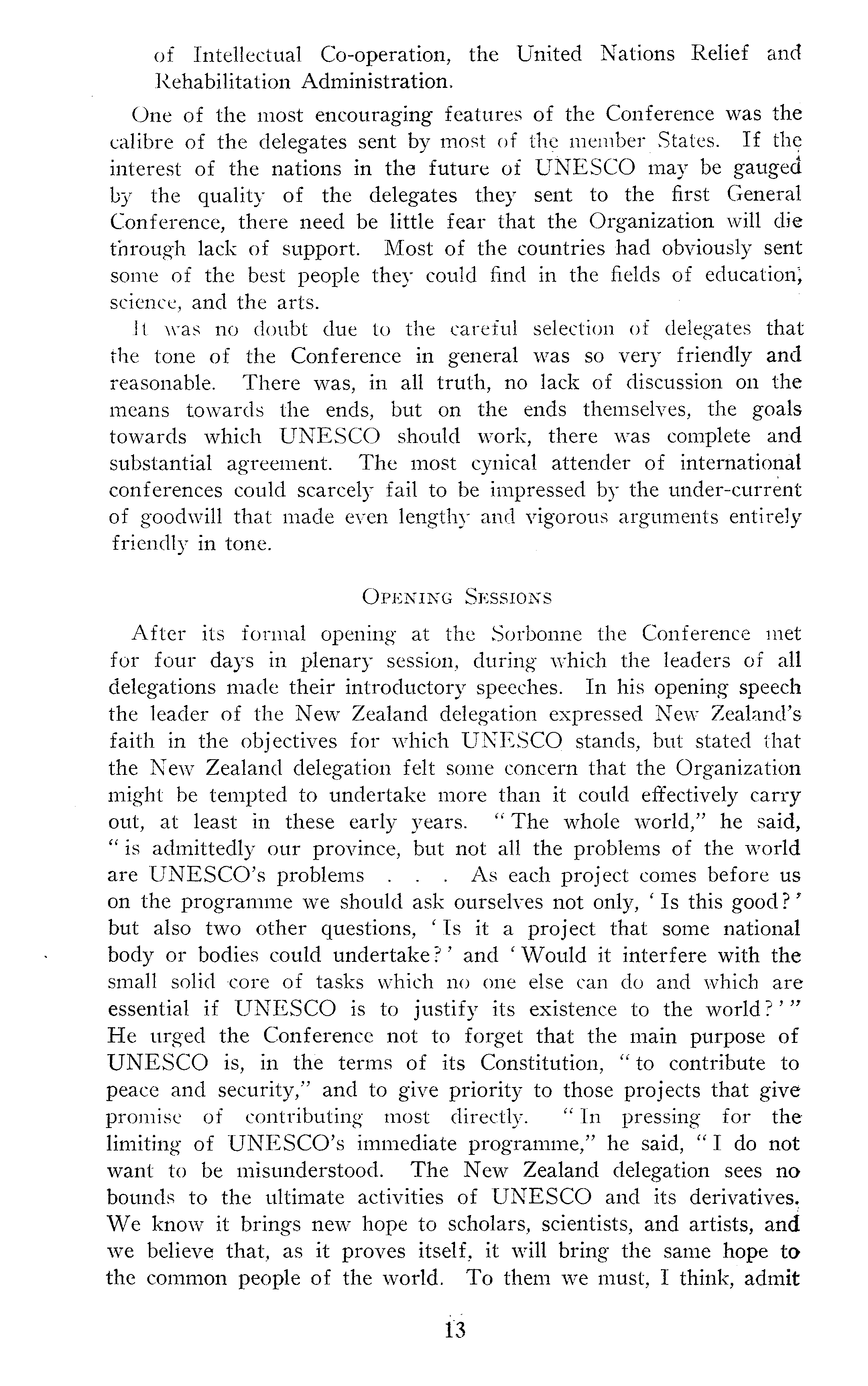 of Intellectual Co-operation, the United Nations Relief and Rehabilitation Administration. One of the most encouraging features of the Conference was the calibre of the delegates sent by most of the member States. If the interest of the nations in the future of UNESCO may be gauged by the quality of the delegates they sent to the first General Conference, there need be little fear that the Organization will die through lack of support. Most of the countries had obviously sent some of the best people they could find in the fields of education; science, and the arts. It was no doubt due to the careful selection of delegates that the tone of the Conference in general was so very friendly and reasonable. There was, in all truth, no lack of discussion on the means towards the ends, but on the ends themselves, the goals towards which UNESCO should work, there was complete and substantial agreement. The most cynical attender of international conferences could scarcely fail to be impressed by the under-current of goodwill that made even lengthy and vigorous arguments entirely friendly in tone. Opening Sessions After its formal opening at the Sorbonne the Conference met for four days in plenary session, during which the leaders of all delegations made their introductory speeches. In his opening speech the leader of the New Zealand delegation expressed New Zealand's faith in the objectives for which "UNESCO stands, but stated that the New Zealand delegation felt some concern that the Organization might be tempted to undertake more than it could effectively carry out, at least in these early years. " The whole world," he said, " is admittedly our province, but not all the problems of the world are UNESCO's problems . . . As each project comes before us on the programme we should ask ourselves not only, ' Is this good ? * but also two other questions, 'ls it a project that some national body or bodies could undertake?' and 'Would it interfere with the small solid core of tasks which no one else can do and which are essential if UNESCO is to justify its existence to the world ?'" He urged the Conference not to forget that the main purpose of UNESCO is, in the terms of its Constitution, "to contribute to peace and security," and to give priority to those projects that give promise of contributing most directly. "In pressing for the limiting of UNESCO's immediate programme," he said, " I do not want to be misunderstood. The New Zealand delegation sees no bounds to the ultimate activities of UNESCO and its derivatives. We know it brings new hope to scholars, scientists, and artists, and we believe that, as it proves itself, it will bring the same hope to the common people of the world. To them we must, I think, admit