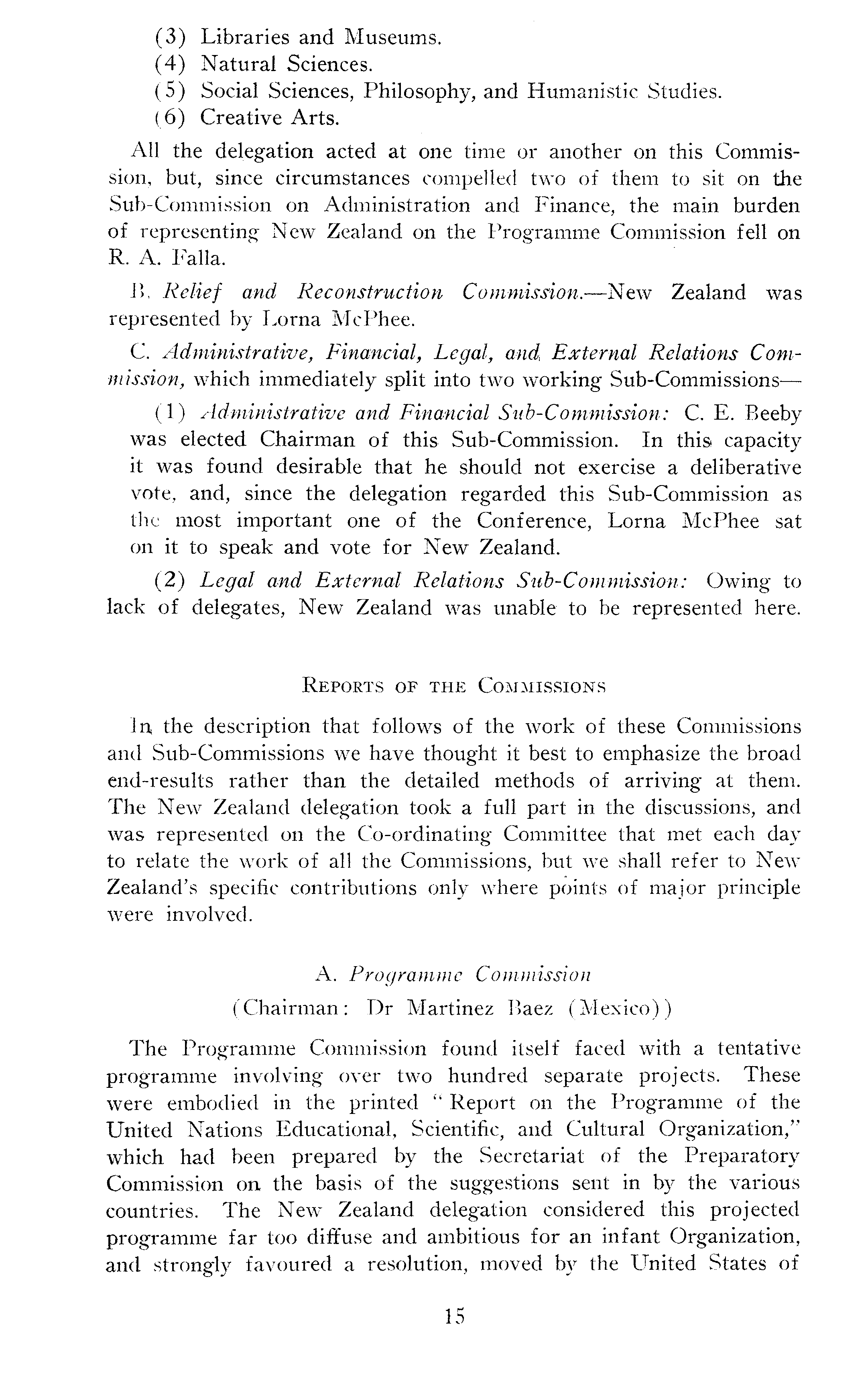 (3) Libraries and Museums. (4) Natural Sciences. (5) Social Sciences, Philosophy, and Humanistic Studies. (6) Creative Arts. All the delegation acted at one time or another on this Commission, but, since circumstances compelled two of them to sit on the Sub-Commission on Administration and Finance, the main burden of representing- New Zealand on the Programme Commission fell on R. A. Falla. B, Relief and Reconstruction Commission.—New Zealand was represented by Lorna McPhee. C. Administrative, Financial, Legal, and External Relations Commission, which immediately split into two working Sub-Commissions—-(l) Administrative and Financial Sub-Commission: C. E. Beeby was elected Chairman of this Sub-Commission. In this capacity it was found desirable that he should not exercise a deliberative vote, and, since the delegation regarded this Sub-Commission as the most important one of the Conference, Lorna McPhee sat on it to speak and vote for New Zealand. (2) Legal and External Relations Sub-Commission: Owing to lack of delegates, New Zealand was unable to be represented here. Reports of the Commissions In the description that follows of the work of these Commissions and Sub-Commissions we have thought it best to emphasize the broad end-results rather than the detailed methods of arriving at them. The New Zealand delegation took a full part in the discussions, and was represented on the Co-ordinating Committee that met each day to relate the work of all the Commissions, but we shall refer to New Zealand's specific contributions only where points of major principle were involved. A. Programme Commission (Chairman: Dr Martinez Baez (Mexico)) The Programme Commission found itself faced with a tentative programme involving over two hundred separate projects. These were embodied in the printed " Report on the Programme of the United Nations Educational, Scientific, and Cultural Organization," which had been prepared by the Secretariat of the Preparatory Commission on the basis of the suggestions sent in by the various countries. The New Zealand delegation considered this projected programme far too diffuse and ambitious for an infant Organization, and strongly favoured a resolution, moved by the United States of
