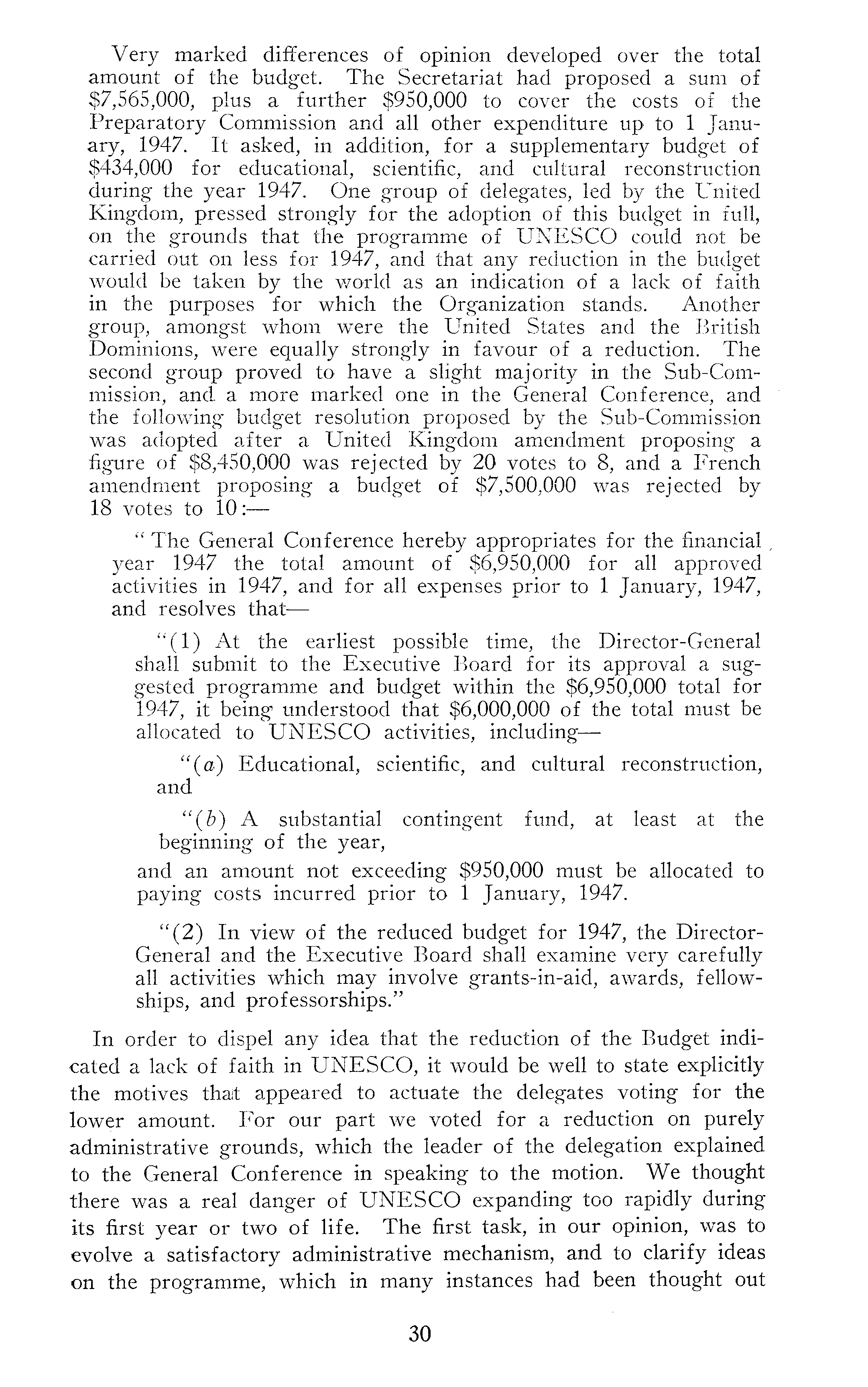 Very marked differences of opinion developed over the total amount of the budget. The Secretariat had proposed a sum of $7,565,000, plus a further $950,000 to cover the costs of the Preparatory Commission and all other expenditure up to 1 January, 1947. It asked, in addition, for a supplementary budget of $434,000 for educational, scientific, and cultural reconstruction during the year 1947. One group of delegates, led by the United Kingdom, pressed strongly for the adoption of this budget in full, on the grounds that the programme of UNESCO could not be carried out on less for 1947, and that any reduction in the budget would be taken by the world as an indication of a lack of faith in the purposes for which the Organization stands. Another group, amongst whom were the United States and the British Dominions, were equally strongly in favour of a reduction. The second group proved to have a slight majority in the Sub-Com-mission, and a more marked one in the General Conference, and the following budget resolution proposed by the Sub-Commission was adopted after a United Kingdom amendment proposing a figure of $8,450,000 was rejected by 20 votes to 8, and a French amendment proposing a budget of $7,500,000 was rejected by 18 votes to 10: — " The General Conference hereby appropriates for the financial year 1947 the total amount of $6,950,000 for all approved activities in 1947, and for all expenses prior to 1 January, 1947, and resolves that — "(1) At the earliest possible time, the Director-General shall submit to the Executive Board for its approval a suggested programme and budget within the $6,950,000 total for 1947, it being understood that $6,000,000 of the total must be allocated to UNESCO activities, including — "(a) Educational, scientific, and cultural reconstruction, and "(b) A substantial contingent fund, at least at the beginning of the year, and an amount not exceeding $950,000 must be allocated to paying costs incurred prior to 1 January, 1947. "(2) In view of the reduced budget for 1947, the DirectorGeneral and the Executive Board shall examine very carefully all activities which may involve grants-in-aid, awards, fellowships, and professorships," In order to dispel any idea that the reduction of the Budget indicated a lack of faith in UNESCO, it would be well to state explicitly the motives that appeared to actuate the delegates voting for the lower amount. For our part we voted for a reduction on purely administrative grounds, which the leader of the delegation explained to the General Conference in speaking to the motion. We thought there was a real danger of UNESCO expanding too rapidly during its first year or two of life. The first task, in our opinion, was to evolve a satisfactory administrative mechanism, and to clarify ideas on the programme, which in many instances had been thought out
