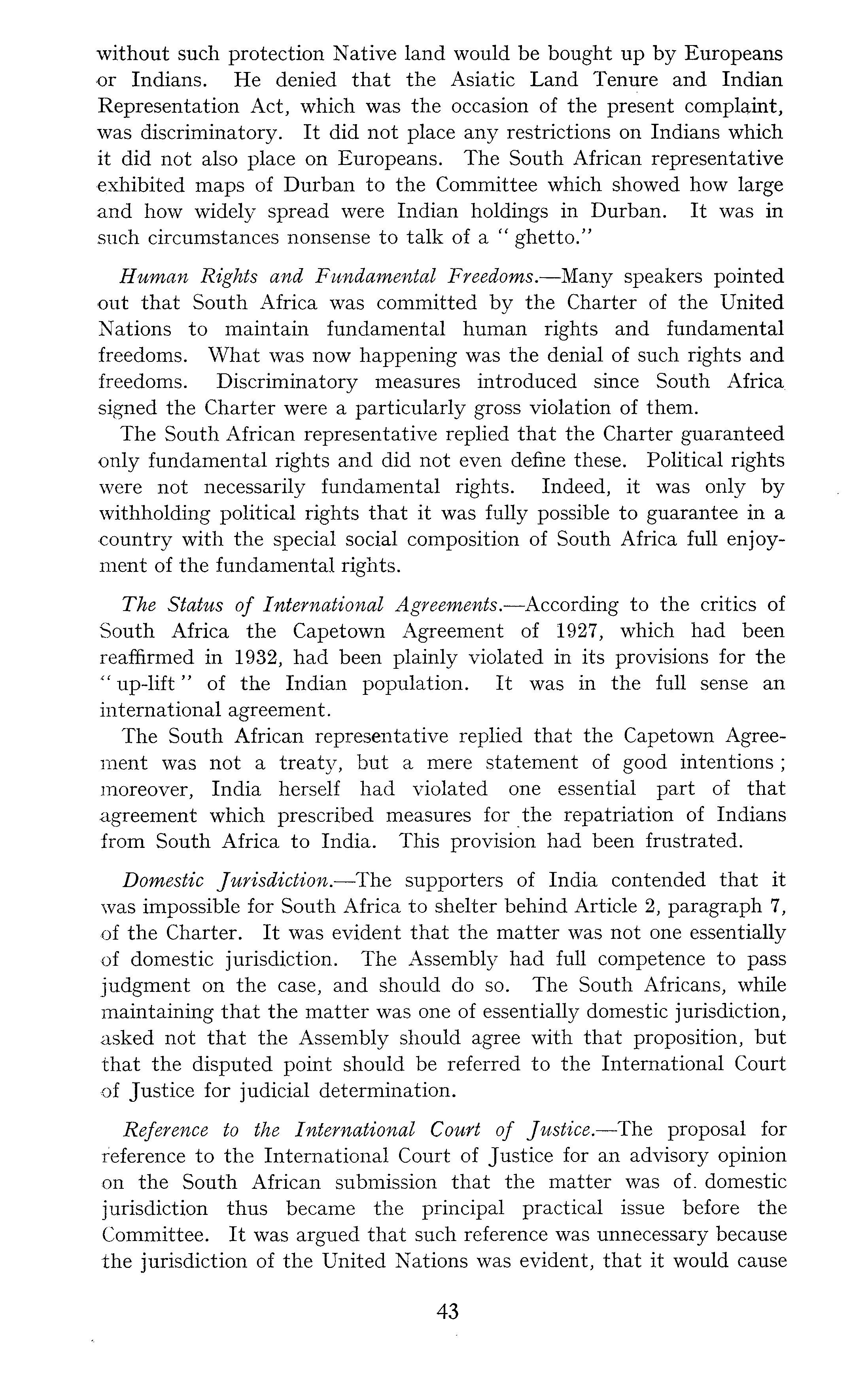 without such protection Native land would be bought up by Europeans or Indians. He denied that the Asiatic Land Tenure and Indian Representation Act, which was the occasion of the present complaint, was discriminatory. It did not place any restrictions on Indians which it did not also place on Europeans. The South African representative exhibited maps of Durban to the Committee which showed how large and how widely spread were Indian holdings in Durban. It was in such circumstances nonsense to talk of a " ghetto." Human Rights and Fundamental Freedoms. —Many speakers pointed out that South Africa was committed by the Charter of the United Nations to maintain fundamental human rights and fundamental freedoms. What was now happening was the denial of such rights and freedoms. Discriminatory measures introduced since South Africa, signed the Charter were a particularly gross violation of them. The South African representative replied that the Charter guaranteed only fundamental rights and did not even define these. Political rights were not necessarily fundamental rights. Indeed, it was only by withholding political rights that it was fully possible to guarantee in a country with the special social composition of South Africa full enjoyment of the fundamental rights. The Status of International Agreements.—According to the critics of South Africa the Capetown Agreement of 1927, which had been reaffirmed in 1932, had been plainly violated in its provisions for the " up-lift" of the Indian population. It was in the full sense an international agreement. The South African representative replied that the Capetown Agreement was not a treaty, but a mere statement of good intentions ; moreover, India herself had violated one essential part of that agreement which prescribed, measures for the repatriation of Indians from South Africa to India. This provision had been frustrated. Domestic Jurisdiction. —The supporters of India contended that it was impossible for South Africa to shelter behind Article 2, paragraph 7, of the Charter. It was evident that the matter was not one essentially of domestic jurisdiction. The Assembly had full competence to pass judgment on the case, and should do so. The South Africans, while maintaining that the matter was one of essentially domestic jurisdiction, asked not that the Assembly should agree with that proposition, but that the disputed point should be referred to the International Court of Justice for judicial determination. Reference to the International Court of Justice. —The proposal for reference to the International Court of Justice for an advisory opinion on the South African submission that the matter was of. domestic jurisdiction thus became the principal practical issue before the Committee. It was argued that such reference was unnecessary because the jurisdiction of the United Nations was evident, that it would cause
