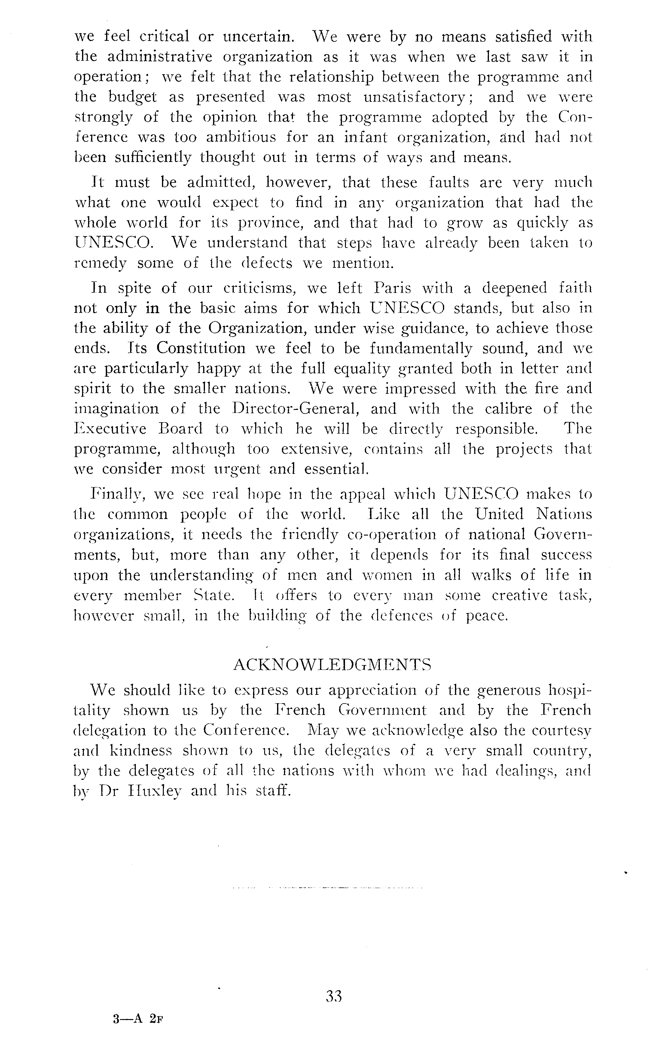 we feel critical or uncertain. We were by no means satisfied with the administrative organization as it was when we last saw it in operation; we felt that the relationship between the programme and the budget as presented was most unsatisfactory; and we were strongly of the opinion that the programme adopted by the Conference was too ambitious for an infant organization, and had not been sufficiently thought out in terms of ways and means. It must be admitted, however, that these faults are very much what one would expect to find in any organization that had the whole world for its province, and that had to grow as quickly as UNESCO. We understand that steps have already been taken to remedy some of the defects we mention. In spite of our criticisms, we left Paris with a deepened faith not only in the basic aims for which UNESCO stands, but also in the ability of the Organization, under wise guidance, to achieve those ends. Its Constitution we feel to be fundamentally sound, and we are particularly happy at the full equality granted both in letter and spirit to the smaller nations. We were impressed with the fire and imagination of the Director-General, and with the calibre of the Executive Board to which he will be directly responsible. The programme, although too extensive, contains all the projects that we consider most urgent and essential. Finally, we see real hope in the appeal which UNESCO makes to the common people of the world. Like all the United Nations organizations, it needs the friendly co-operation of national Governments, but, more than any other, it depends for its final success upon the understanding of men and women in all walks of life in every member State. It offers to every man some creative task, however small, in the building of the defences of peace. ACKNOWLEDGMENTS We should like to express our appreciation of the generous hospitality shown us by the French Government and by the French delegation to the Conference. May we acknowledge also the courtesy and kindness shown to us, the delegates of a„ very small country, by the delegates of all the nations with whom we had dealings, and by Dr Huxley and his staff.