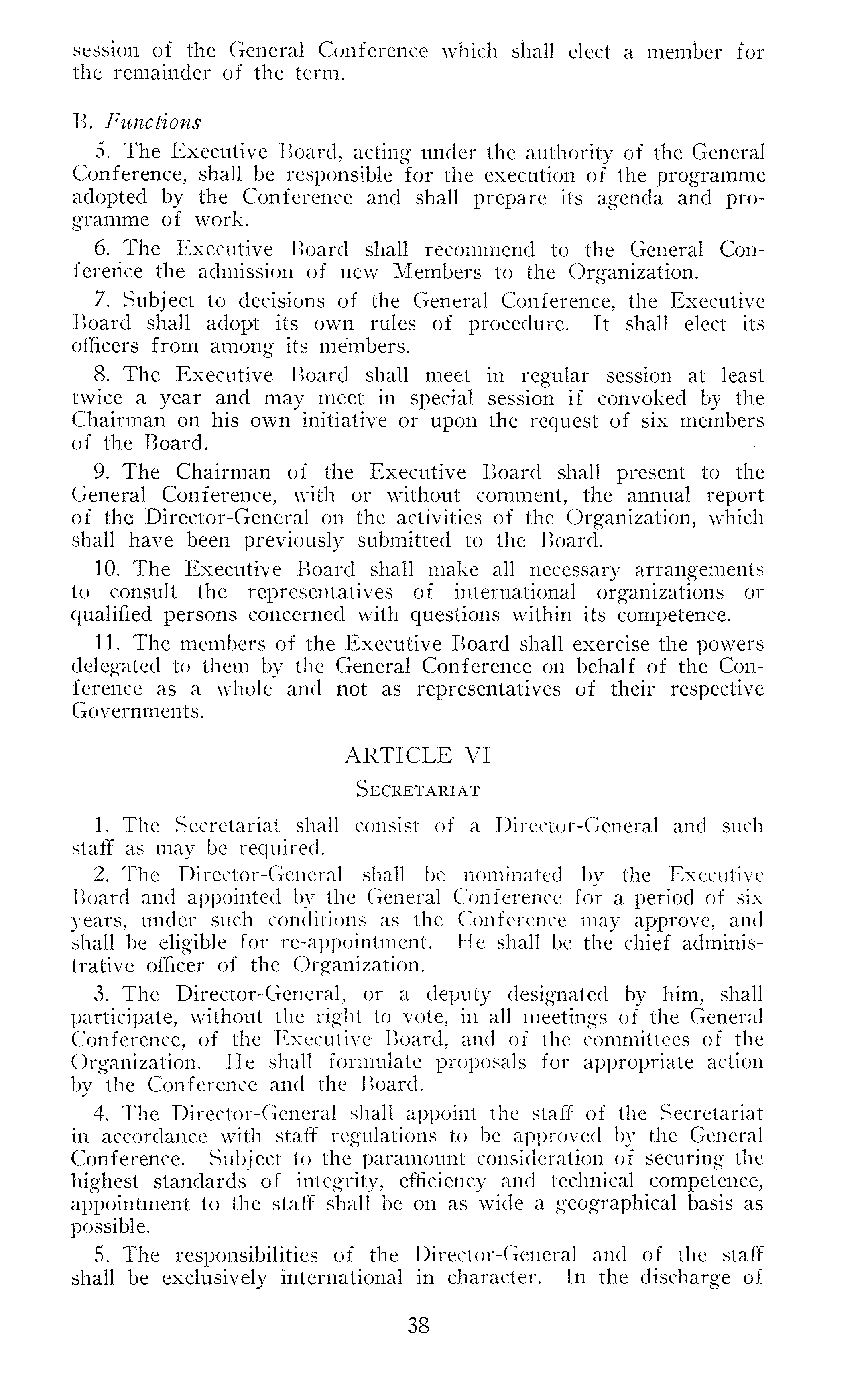session of the General Conference which shall elect a member for the remainder of the term. B. Functions 5. The Executive Board, acting under the authority of the General Conference, shall be responsible for the execution of the programme adopted by the Conference and shall prepare its agenda and programme of work. 6. The Executive Board shall recommend to the General Conference the admission of new Members to the Organization. 7. Subject to decisions of the General Conference, the Executive Board shall adopt its own rules of procedure. It shall elect its officers from among its members. 8. The Executive Board shall meet in regular session at least twice a year and may meet in special session if convoked by the Chairman on his own initiative or upon the request of six members of the Board. 9. The Chairman of the Executive Board shall present to the General Conference, with or without comment, the annual report of the Director-General on the activities of the Organization, which shall have been previously submitted to the Board. 10. The Executive Board shall make all necessary arrangements to consult the representatives of international organizations or qualified persons concerned with questions within its competence. 11. The members of the Executive Board shall exercise the powers delegated to them by the General Conference on behalf of the Conference as a whole and not as representatives of their respective Governments. ARTICLE VI Secretariat 1. The Secretariat shall consist of a Director-General and such staff as may be required. 2. The Director-General shall be nominated by the Executive Board and appointed by the General Conference for a period of six years, under such conditions as the Conference may approve, and shall be eligible for re-appointment. He shall be the chief administrative officer of the Organization. 3. The Director-General, or a deputy designated by him, shall participate, without the right to vote, in all meetings of the General Conference, of the Executive Board, and of the committees of the Organization. He shall formulate proposals for appropriate action by the Conference and the Board. 4. The Director-General shall appoint the staff of the Secretariat in accordance with staff regulations to be approved by the General Conference. Subject to the paramount consideration of securing the highest standards of integrity, efficiency and technical competence, appointment to the staff shall be on as wide a geographical basis as possible. 5. The responsibilities of the Director-General and of the staff shall be exclusively international in character. In the discharge of